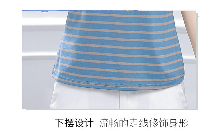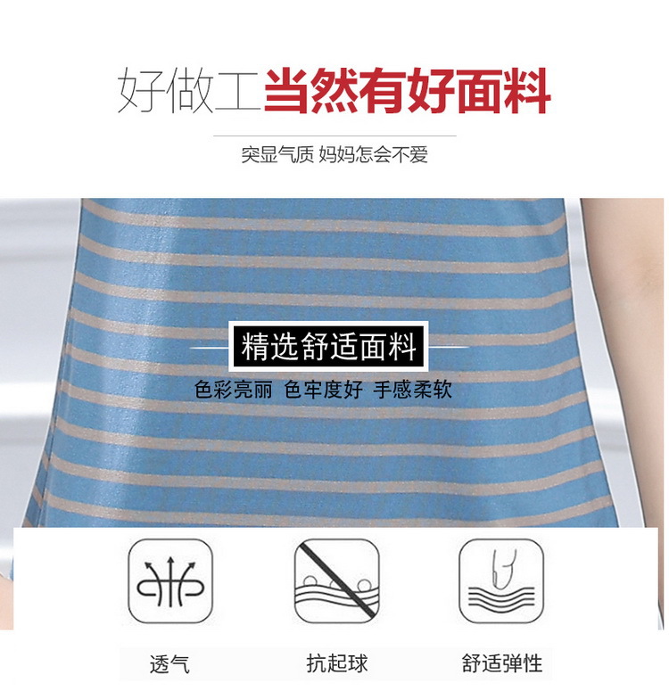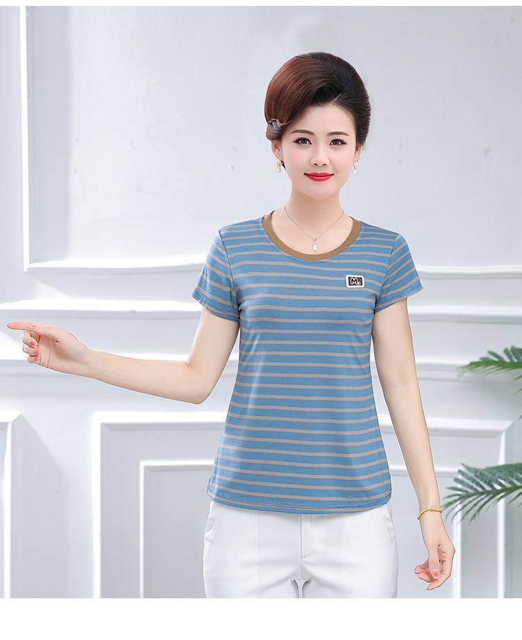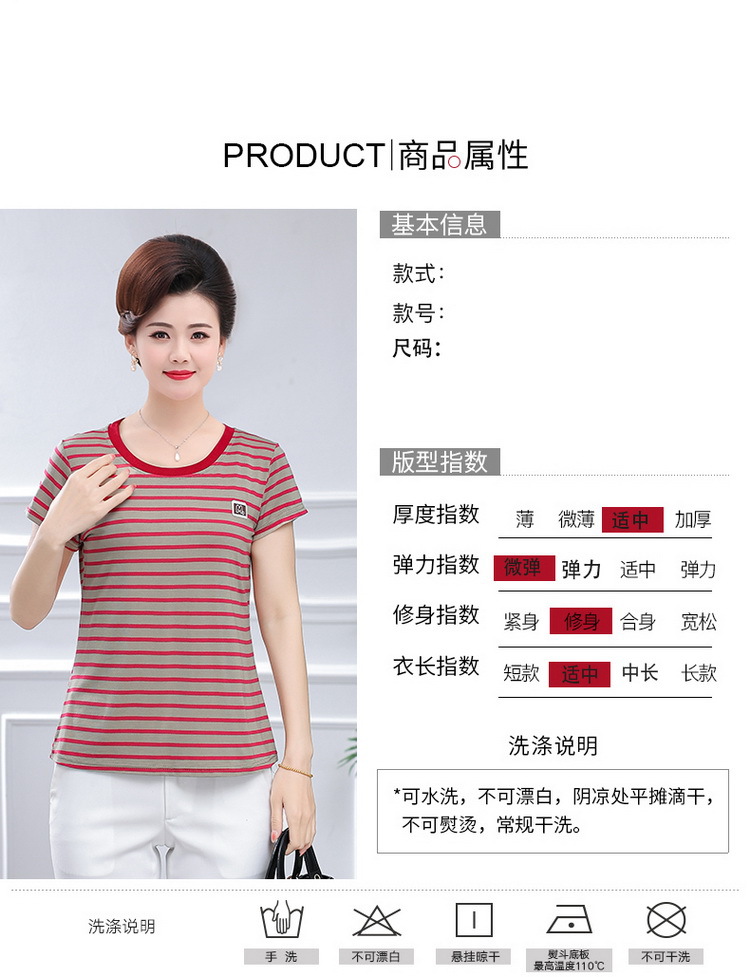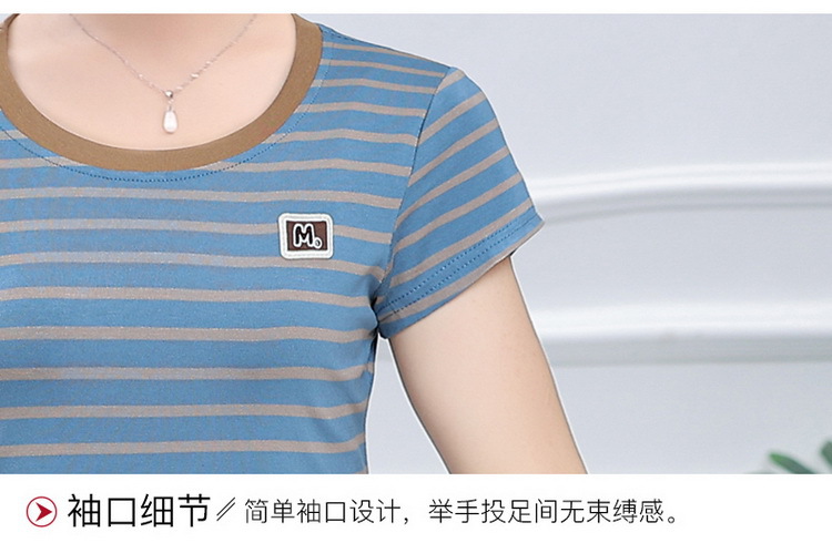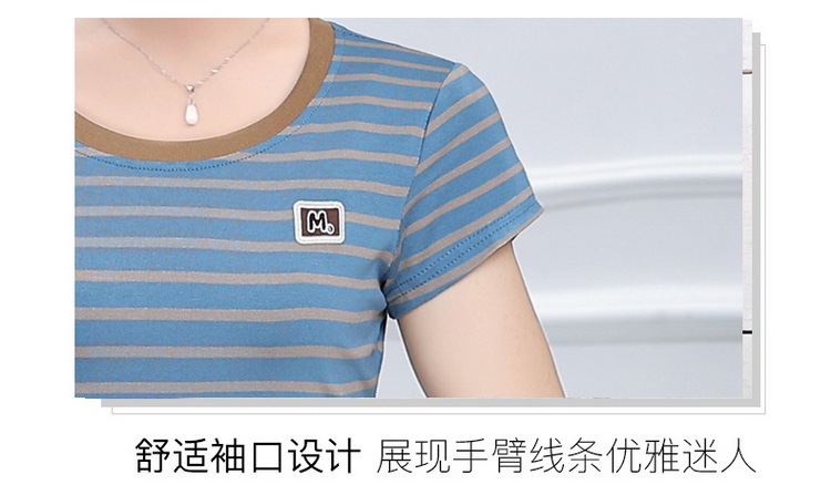 中老年夏装短袖棉t恤女装新款妈妈装圆领小衫黑白条纹T恤百搭上衣