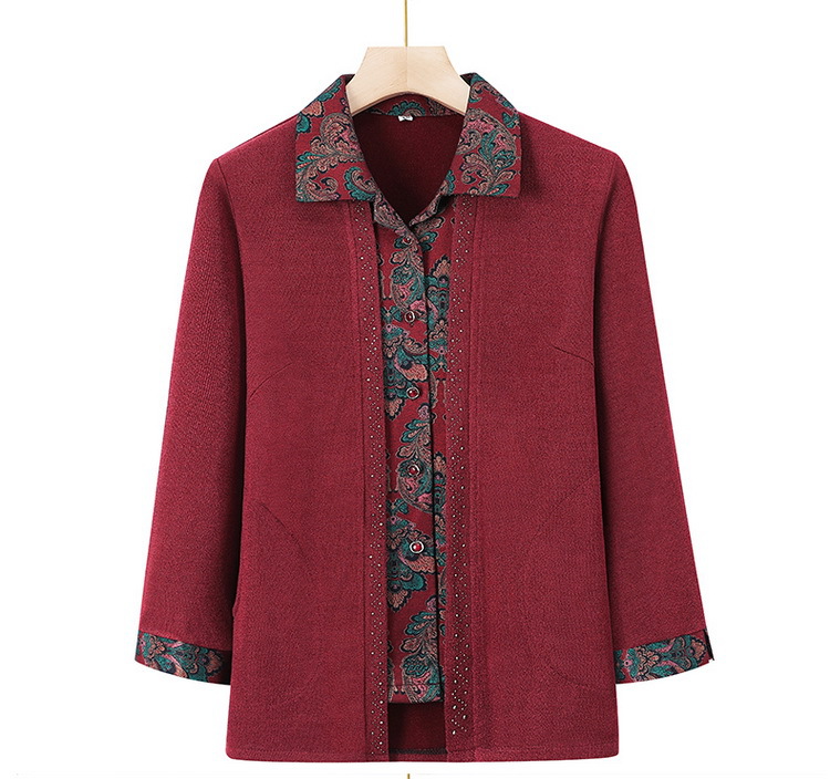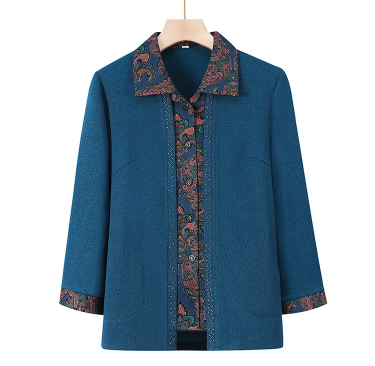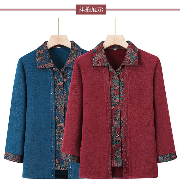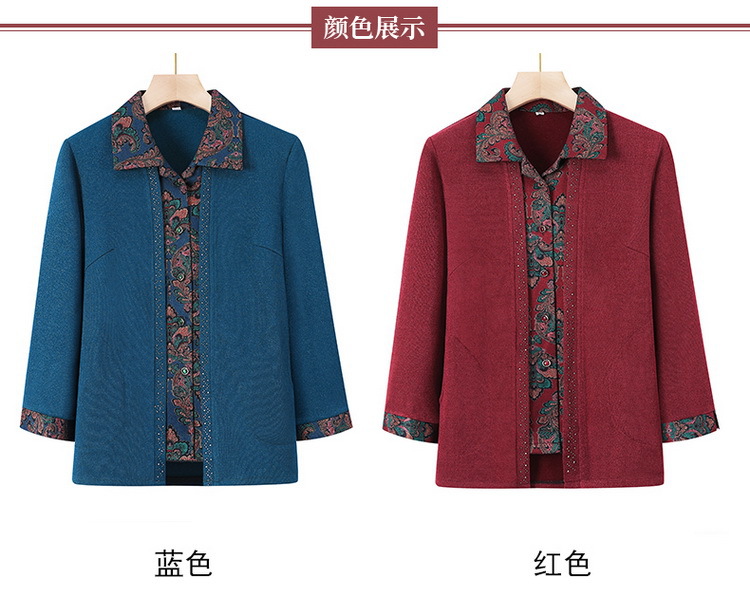 奶奶春装衬衫中老年人女假两件翻领开衫妈妈长袖洋气老太太上衣服