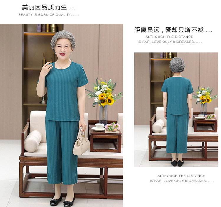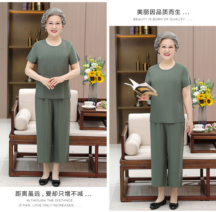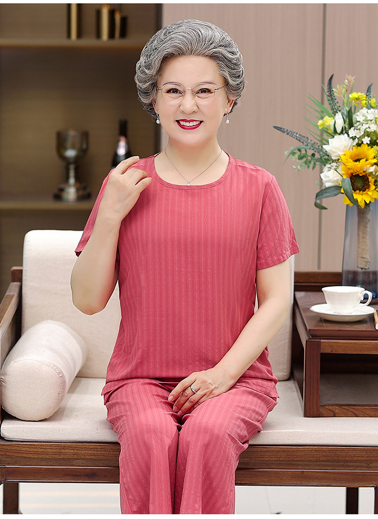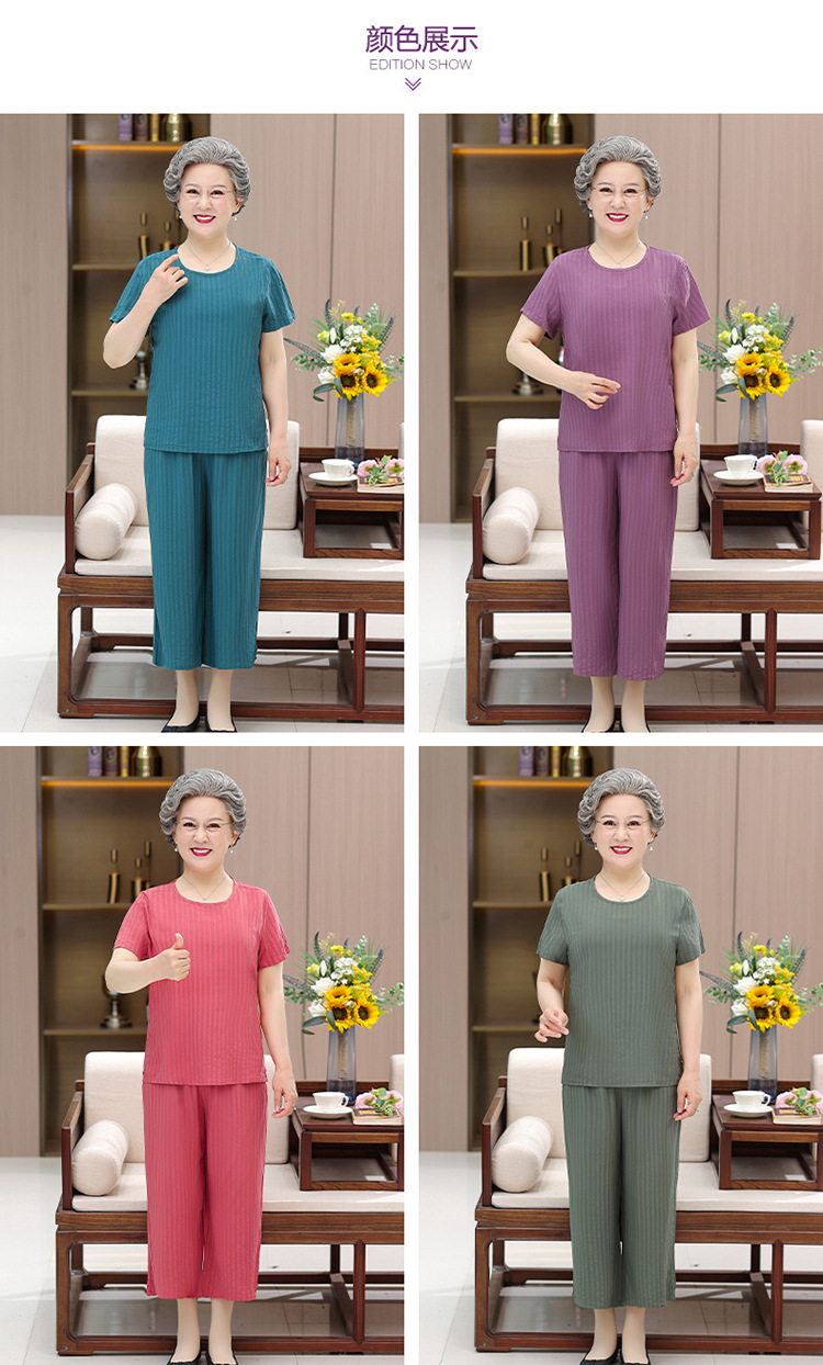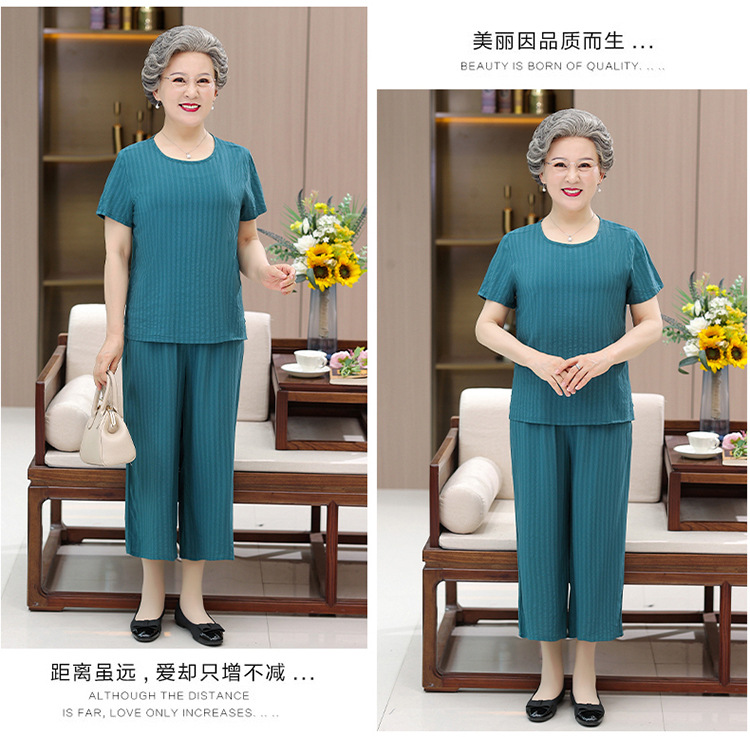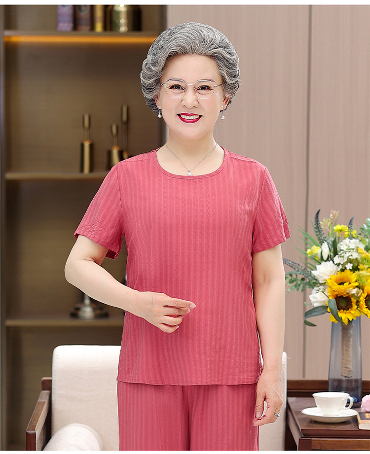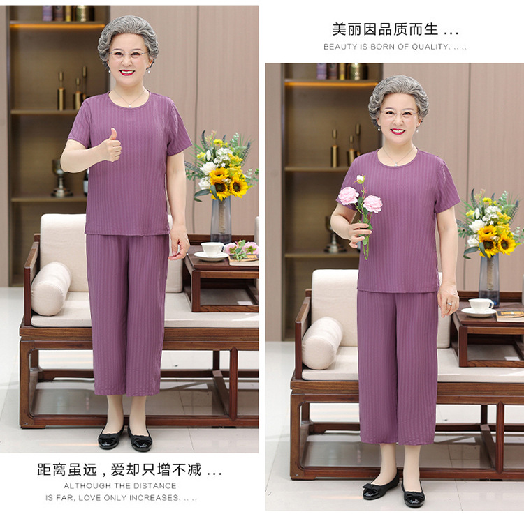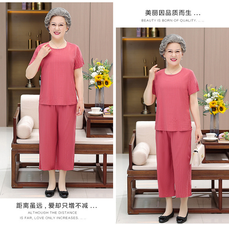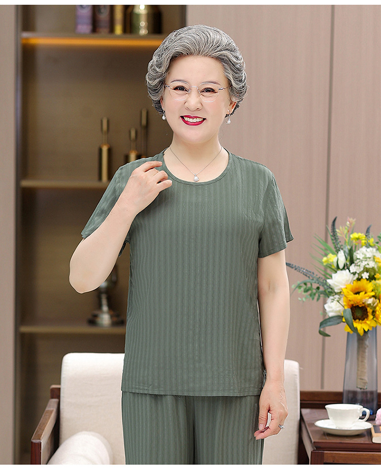 中老年女装奶奶夏装套装妈妈装棉绸短袖T恤老太太人棉提花两件套