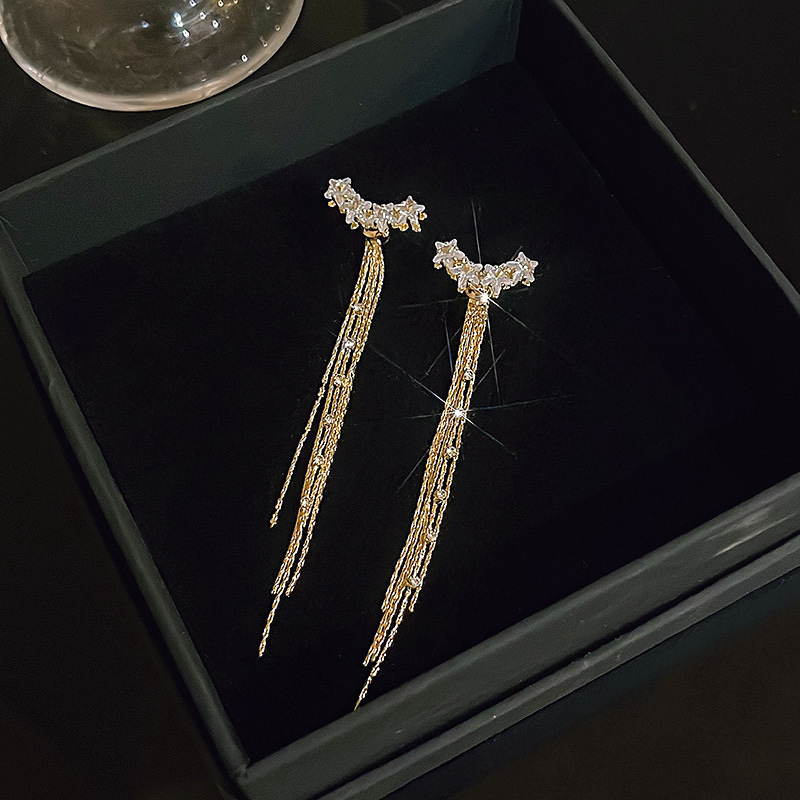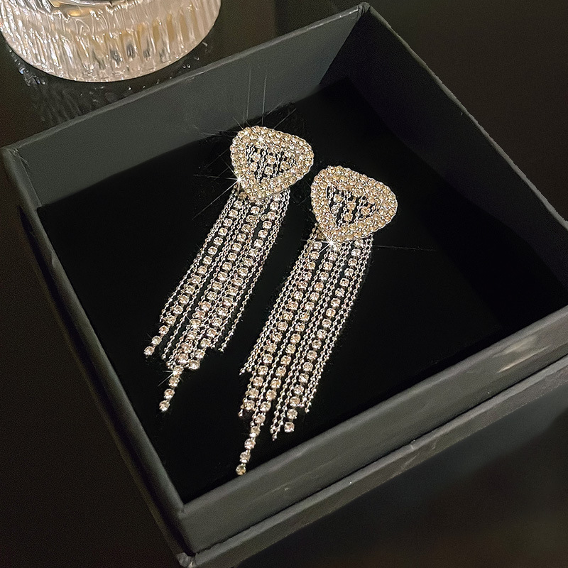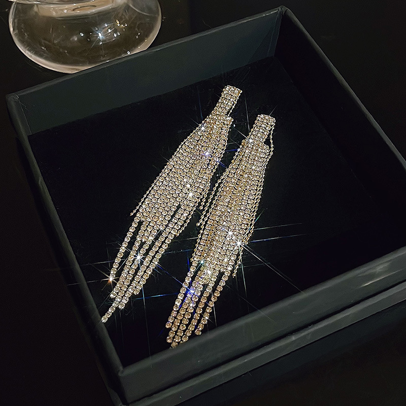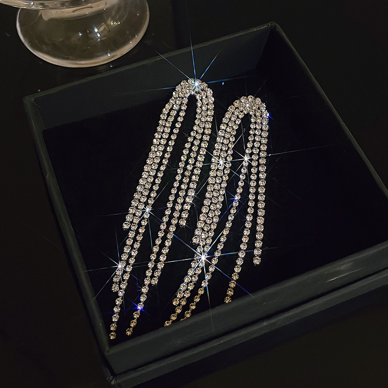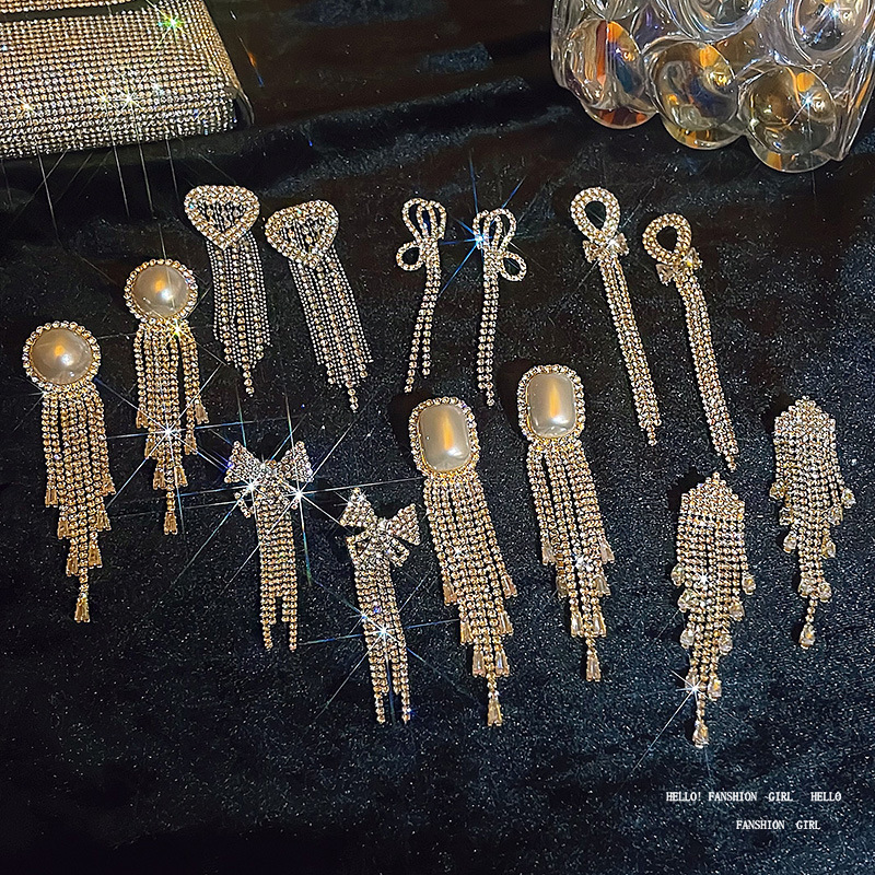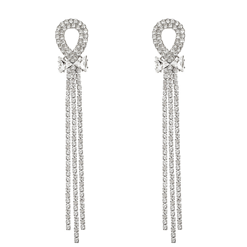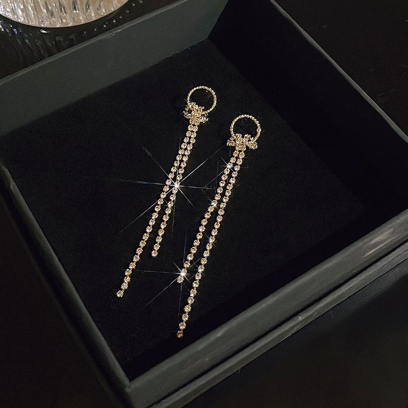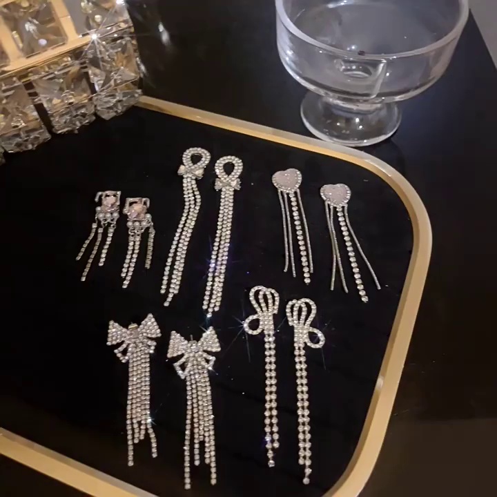 S925银针精致满钻蝴蝶结耳钉高级感耳饰品欧美夸张长款流苏耳环女