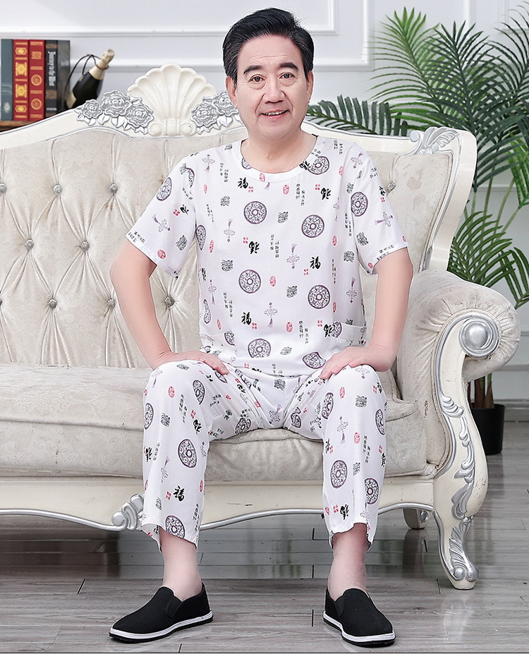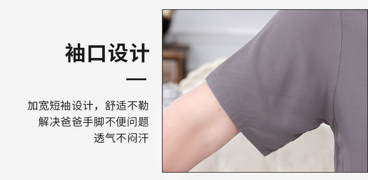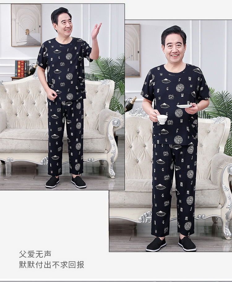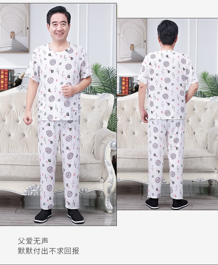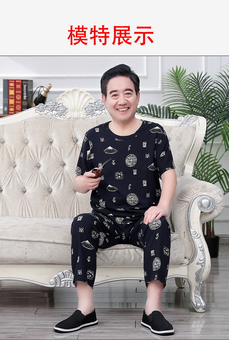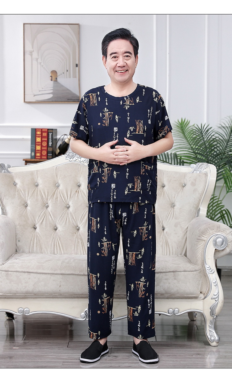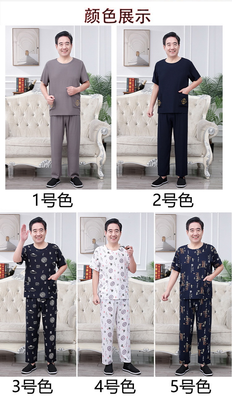 爸爸夏装短袖长裤棉绸睡衣中老年男士短袖家居服人造棉套装爷爷装