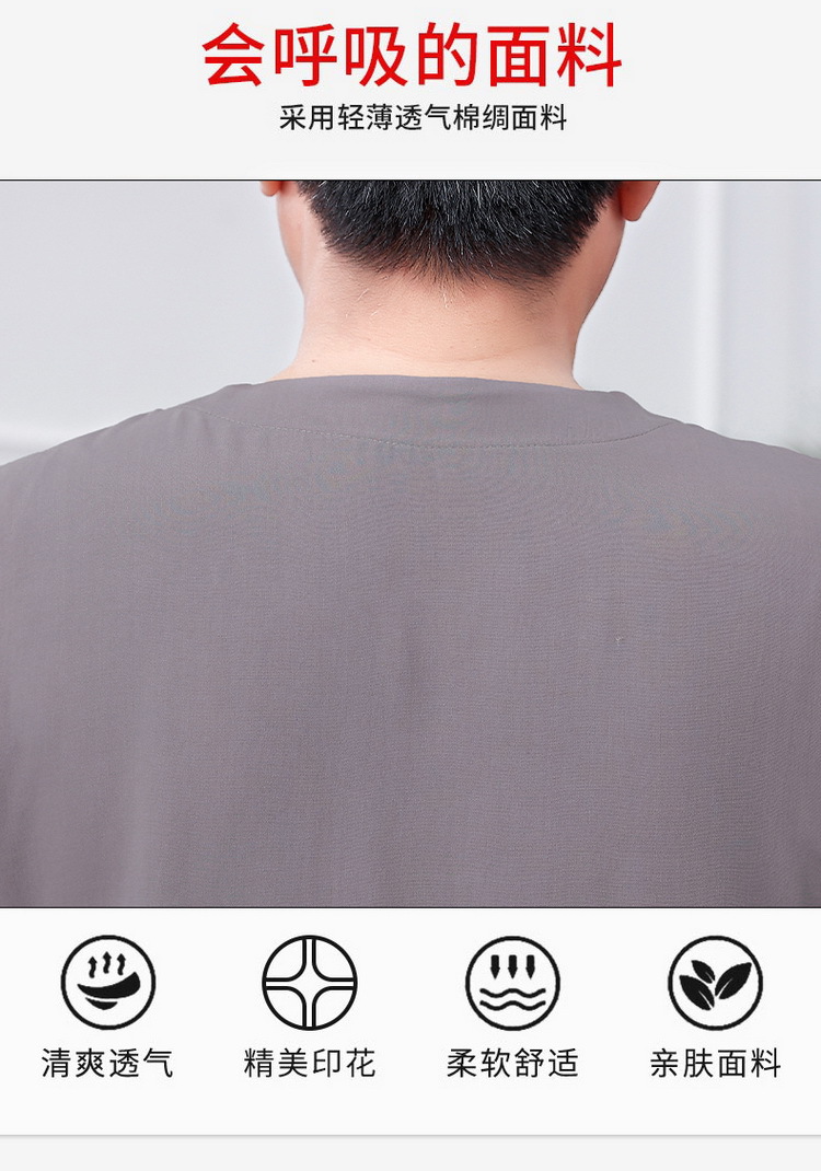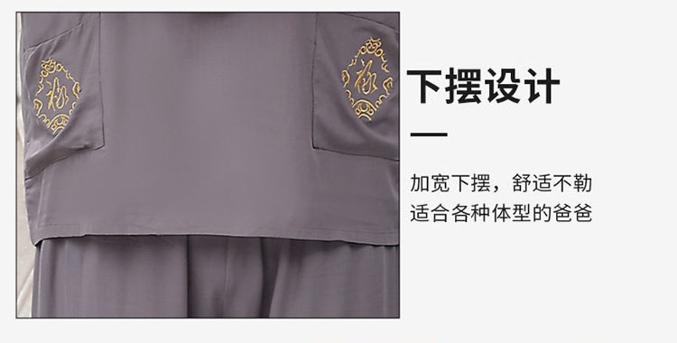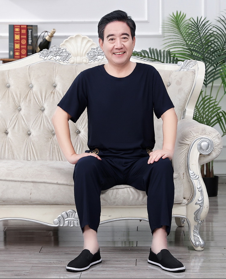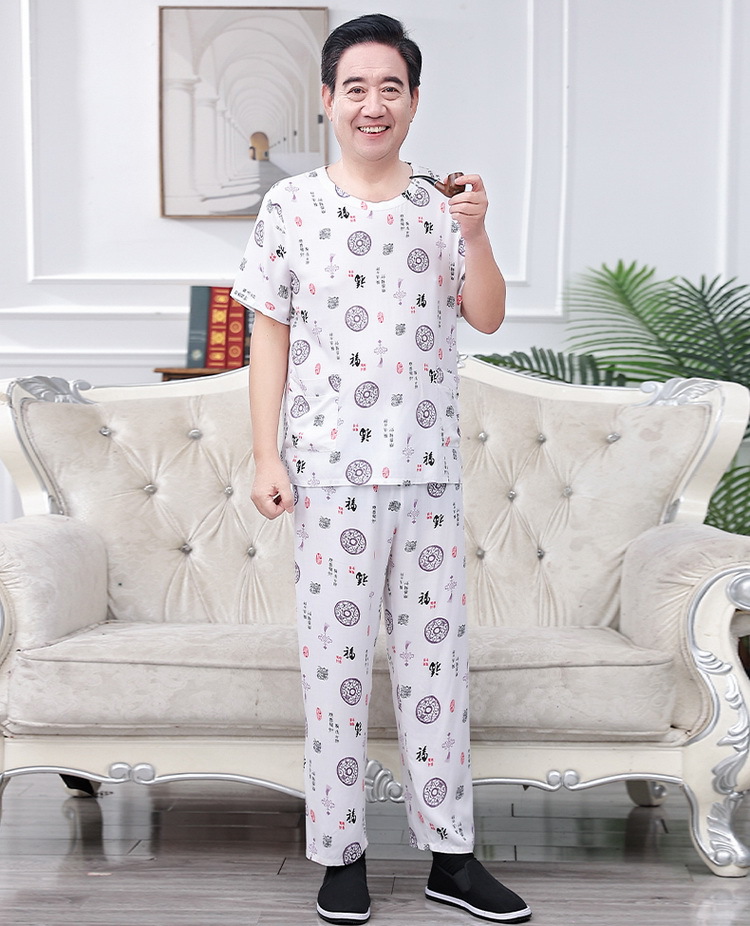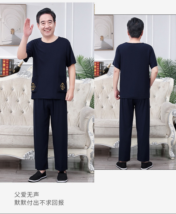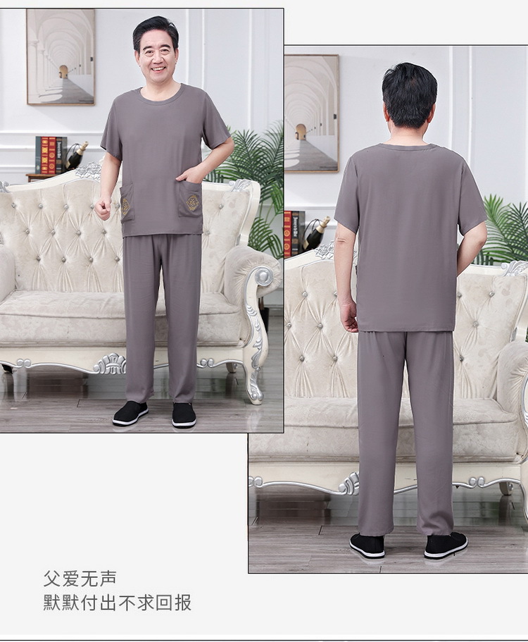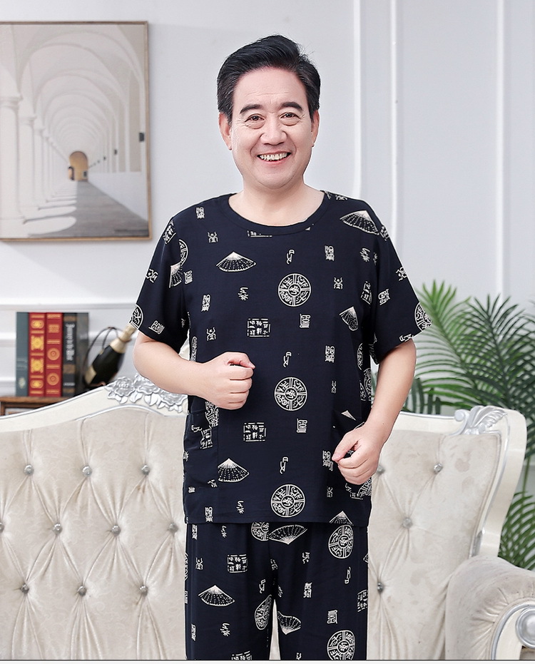 爸爸夏装短袖长裤棉绸睡衣中老年男士短袖家居服人造棉套装爷爷装