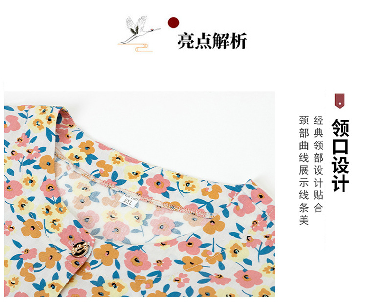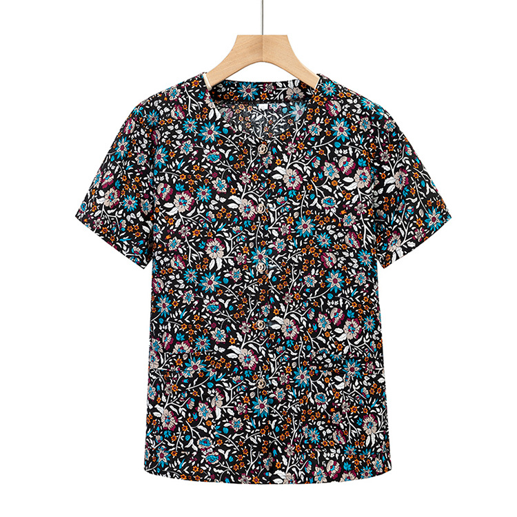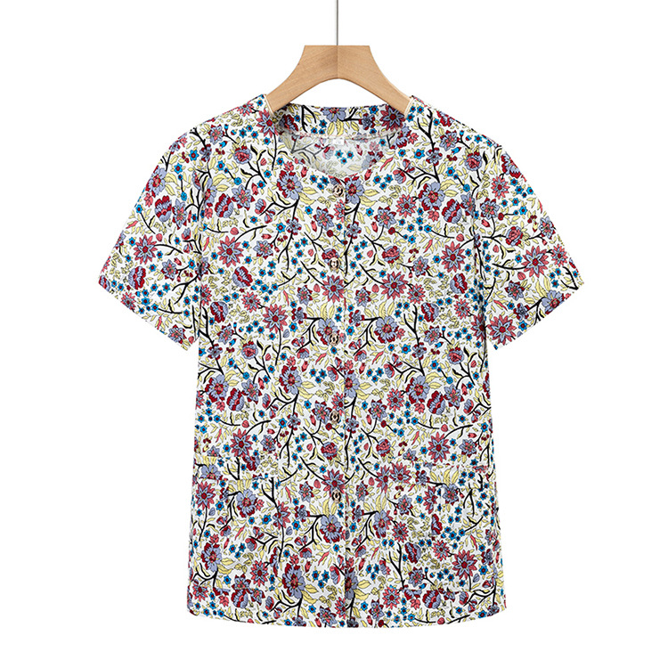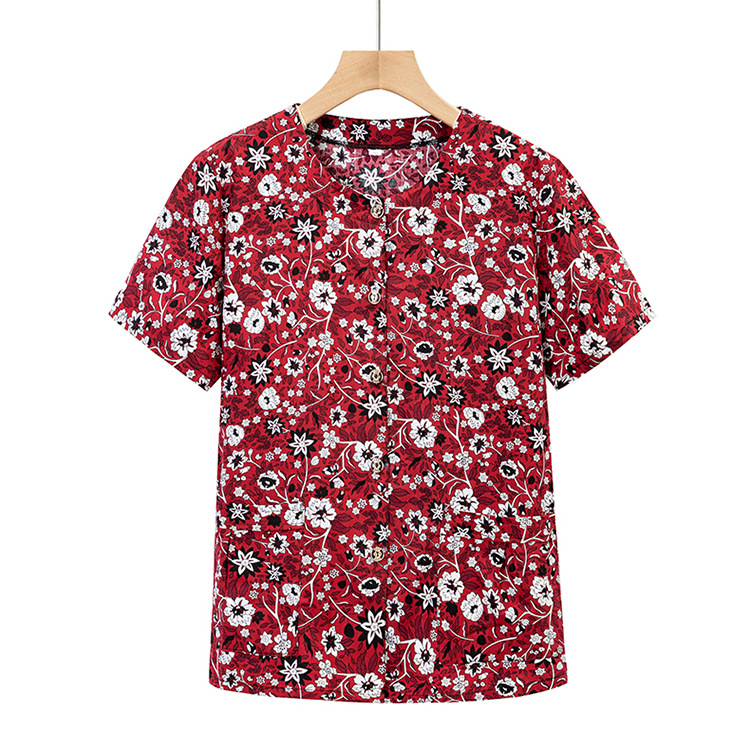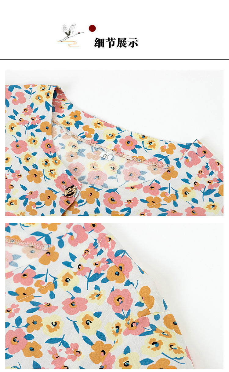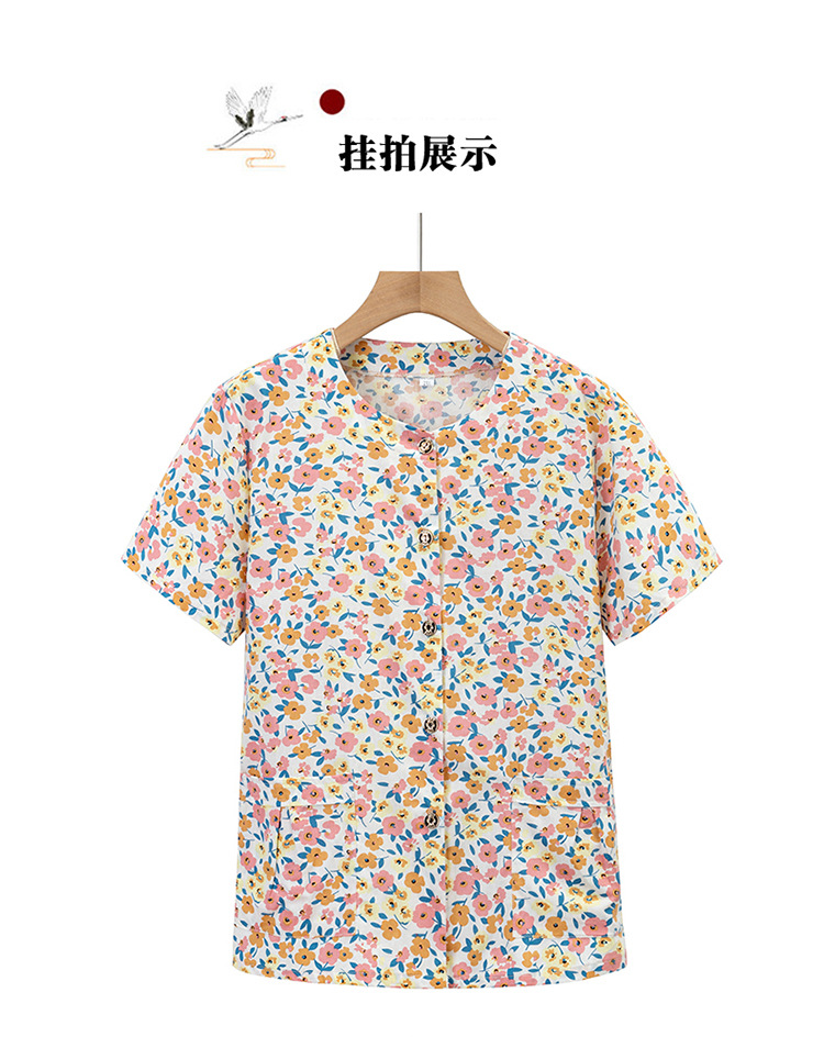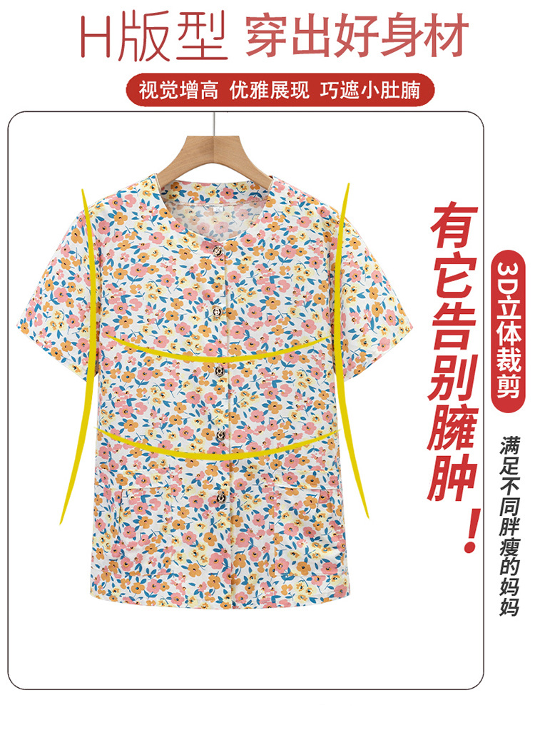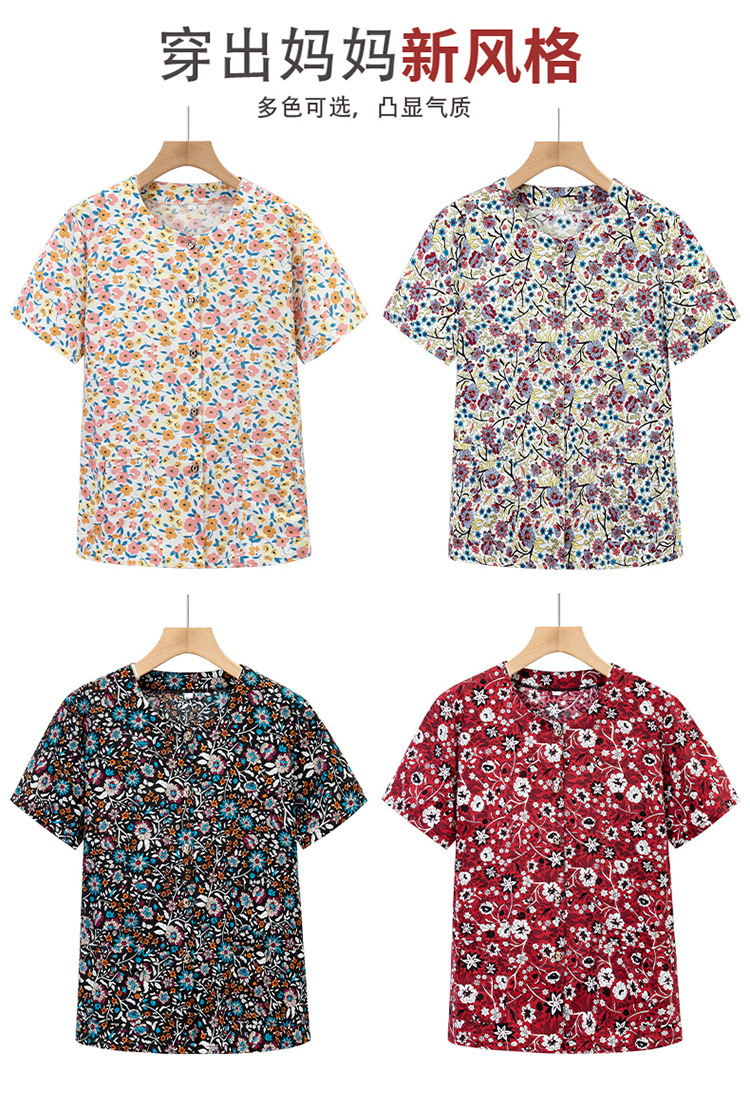奶奶夏装全棉短袖花衬衫老太太圆领开衫上衣妈妈夏季纯棉衬衣汗衫