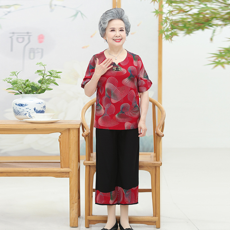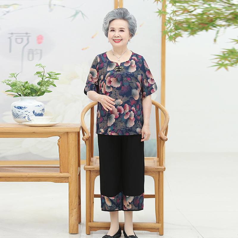 中老年人女装夏装人造棉套装70岁80奶奶棉绸套装老人短袖睡衣可外