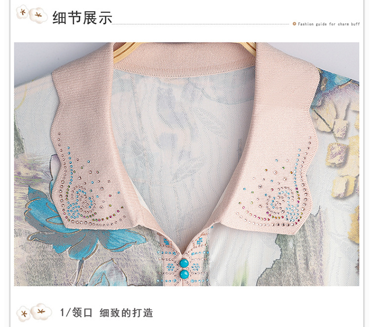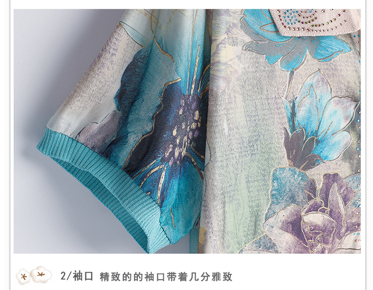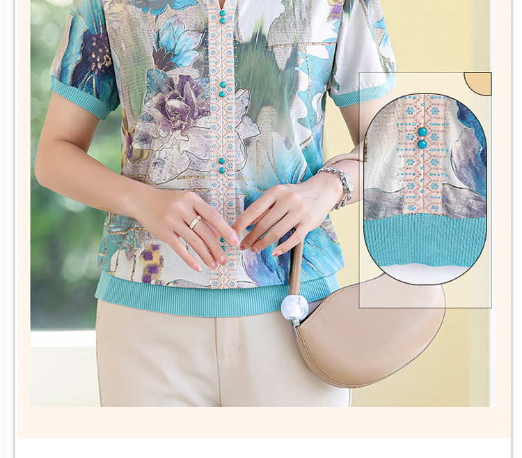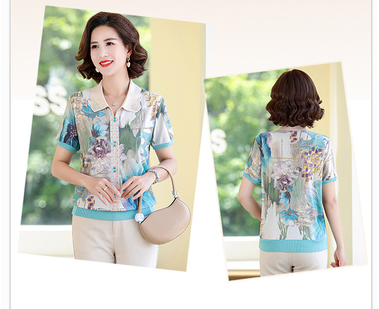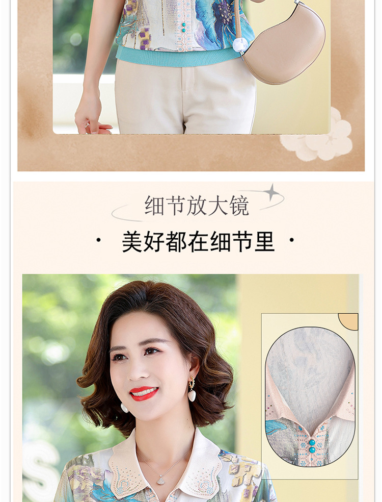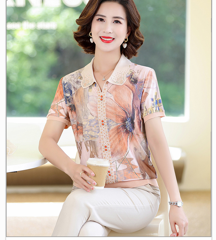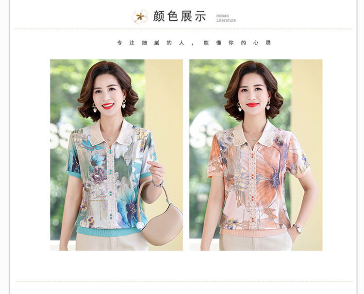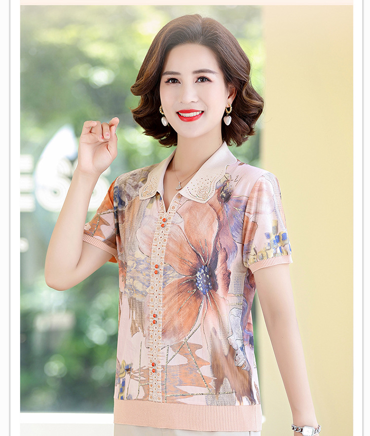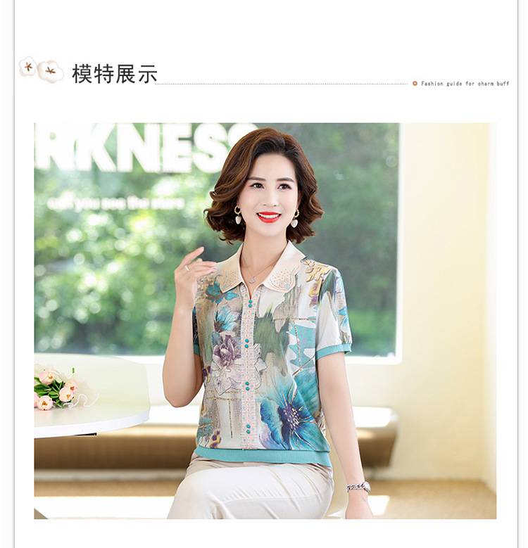 妈妈夏装短袖宽松T恤中老年人翻领上衣洋气50岁中年女装冰丝小衫