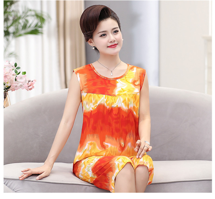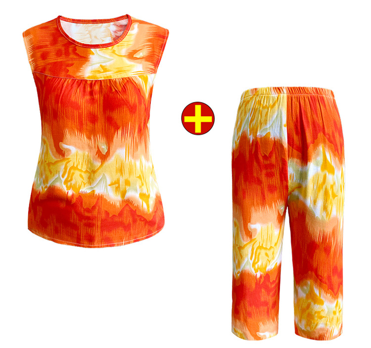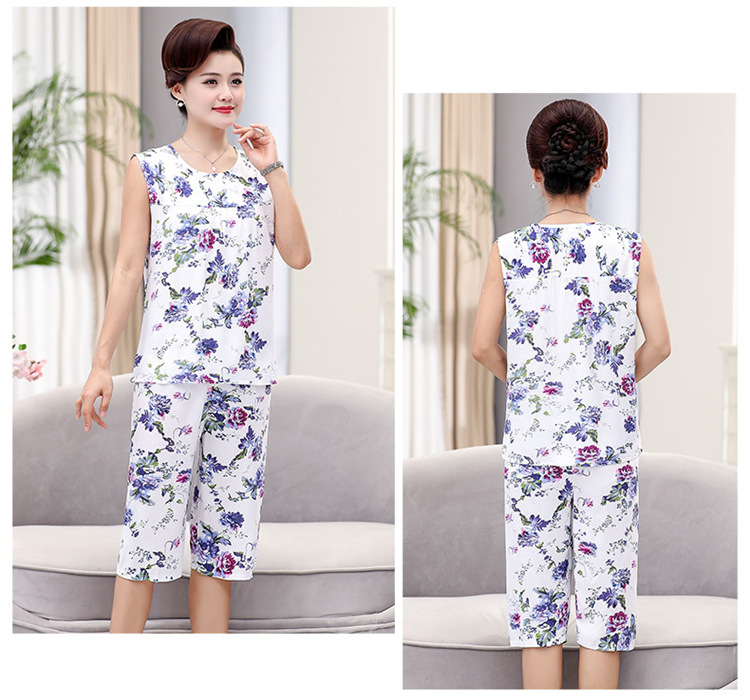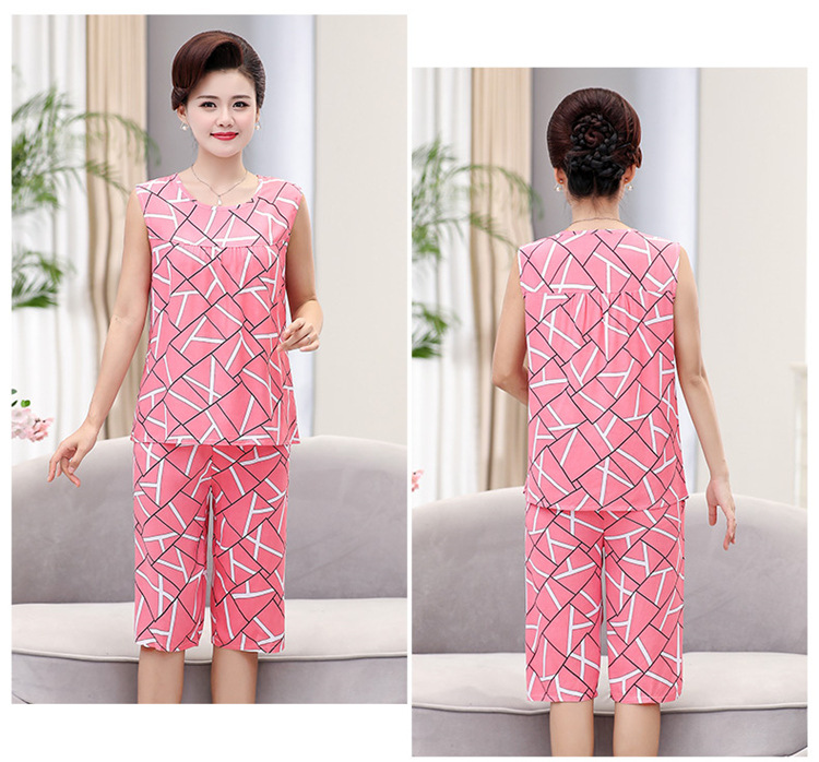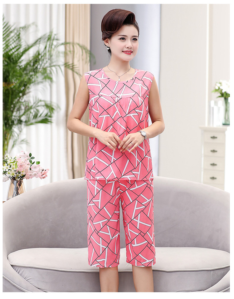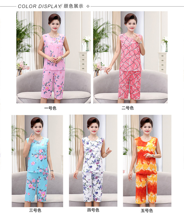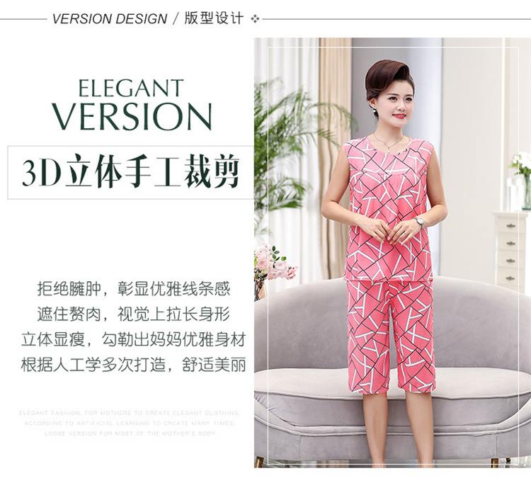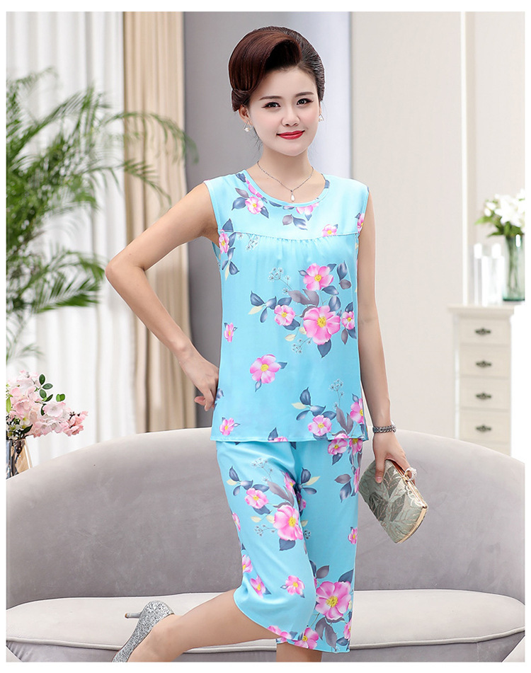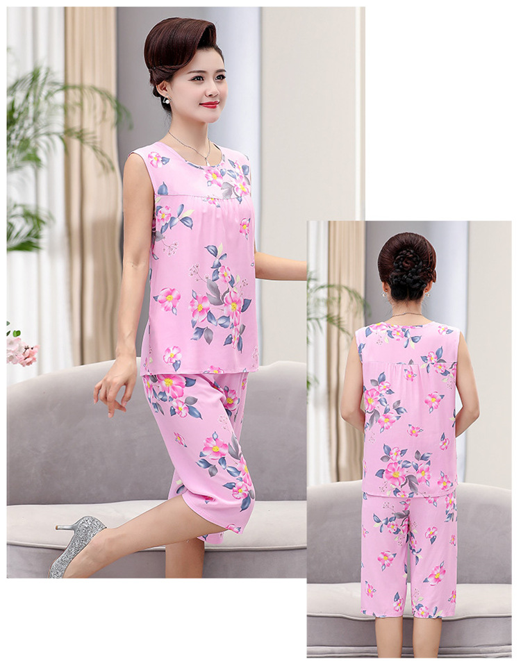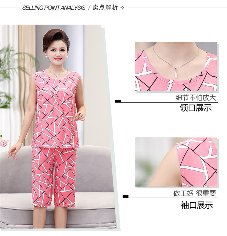 中老年女夏季棉绸睡衣两件套妈妈装无袖七分裤人造棉家居服套装