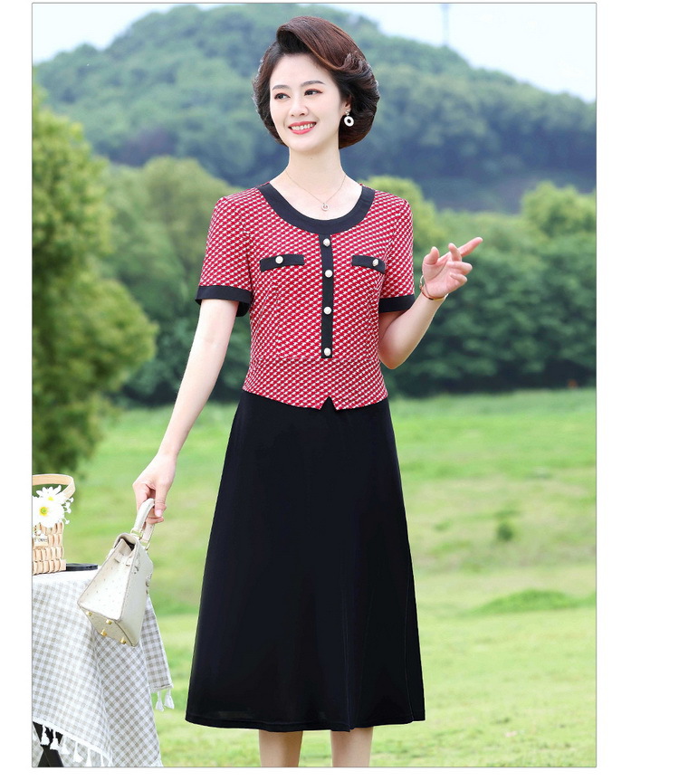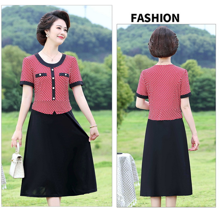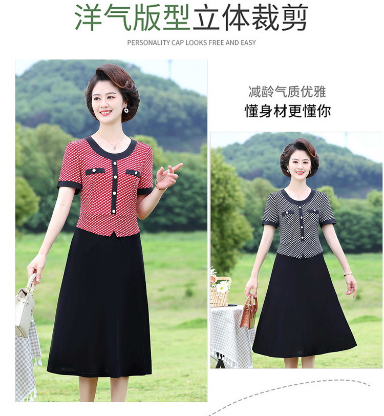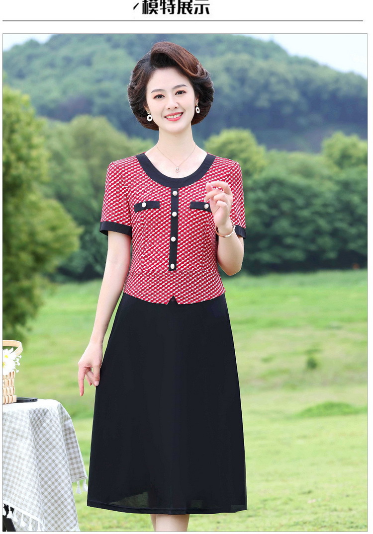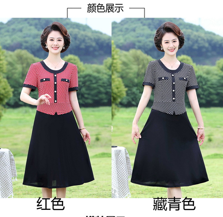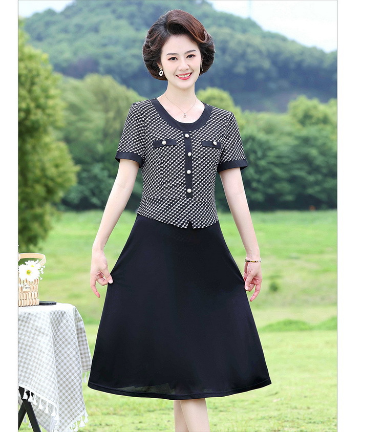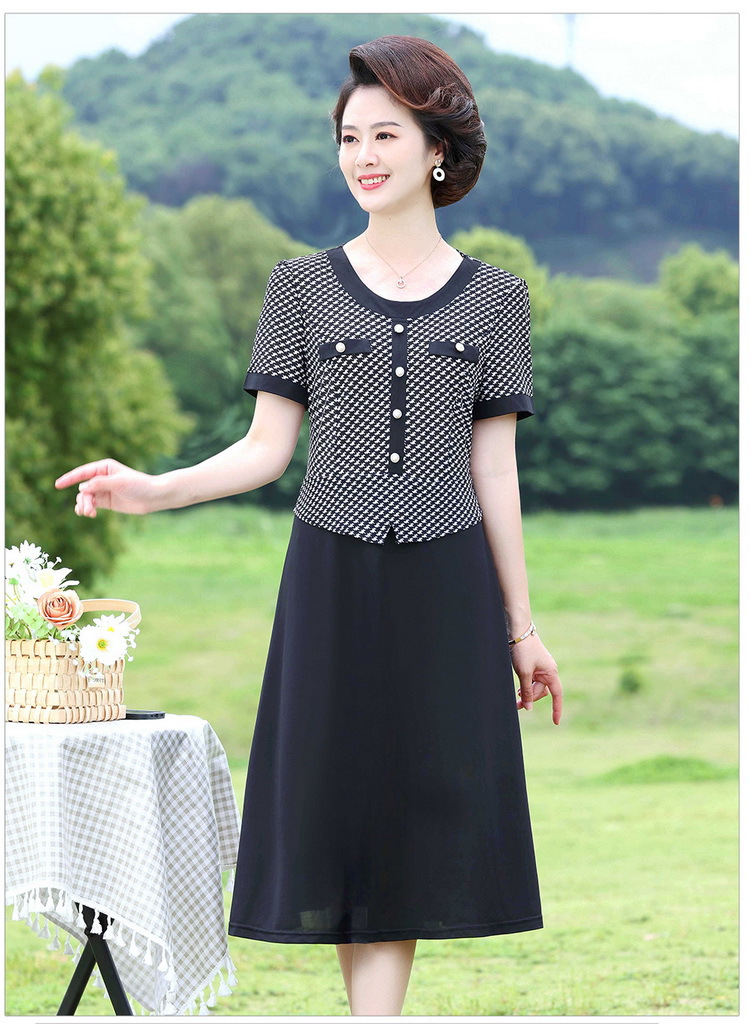 50岁妈妈夏装洋气短袖小香风拼接连衣裙中老年女假两件中长款裙子