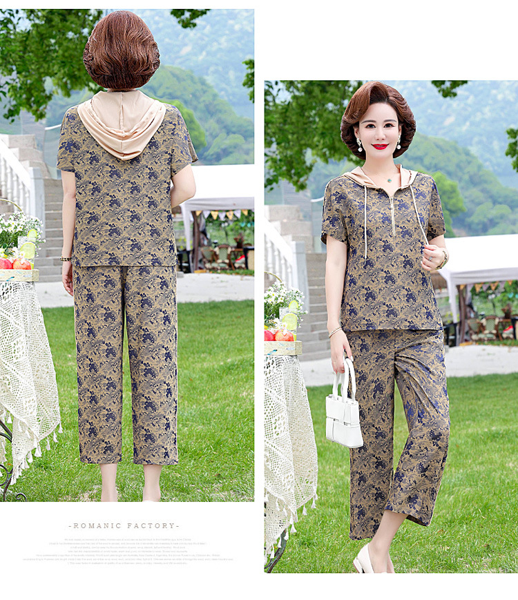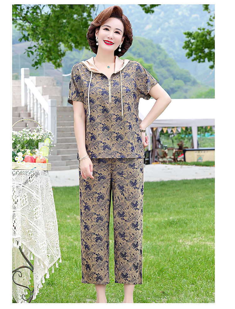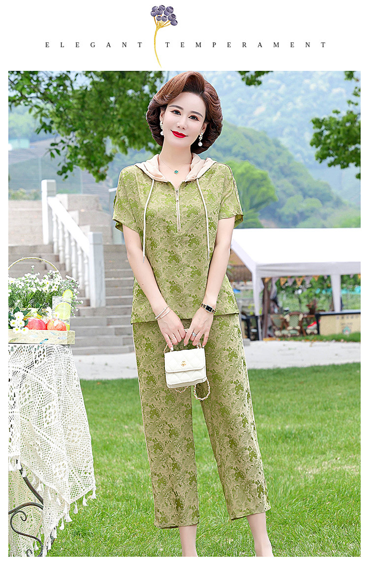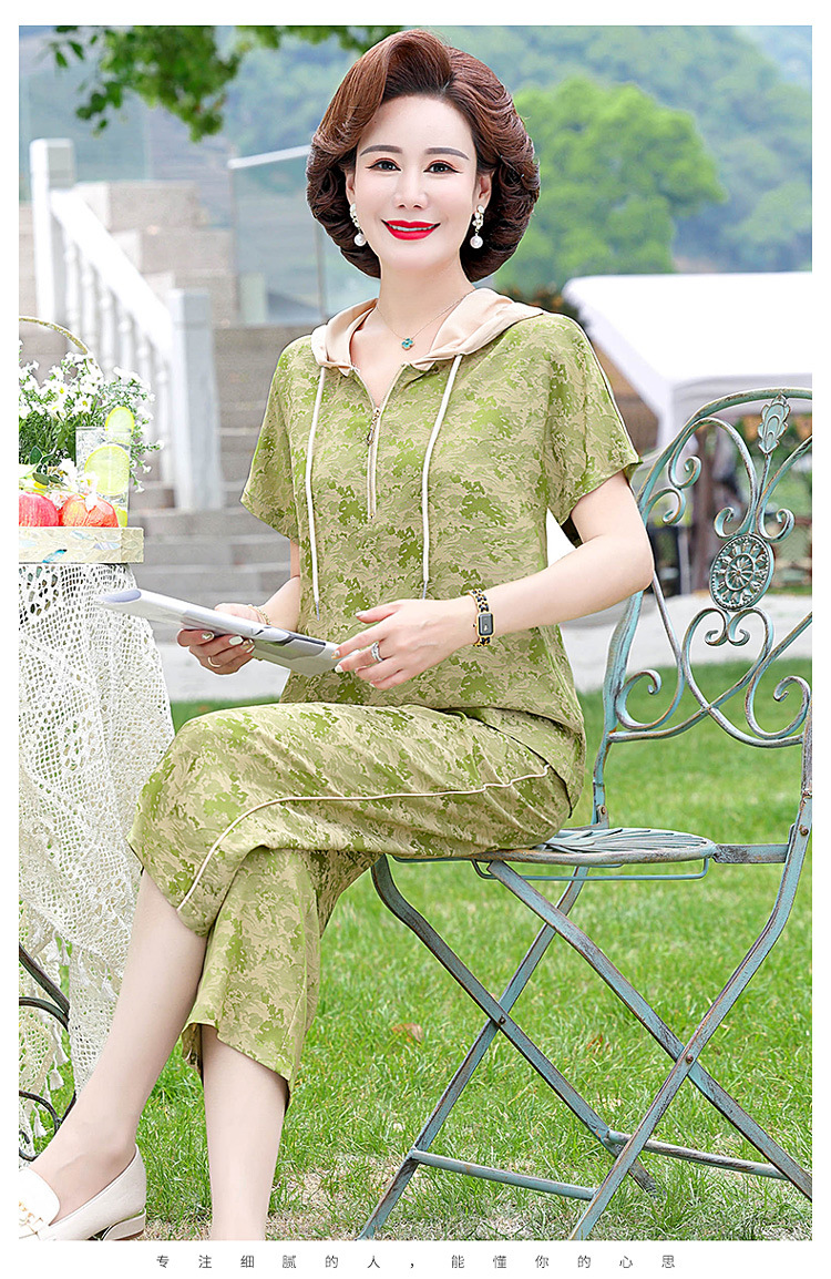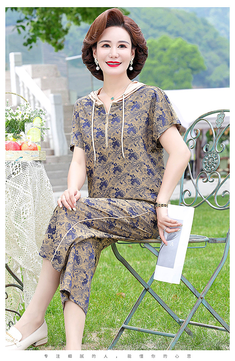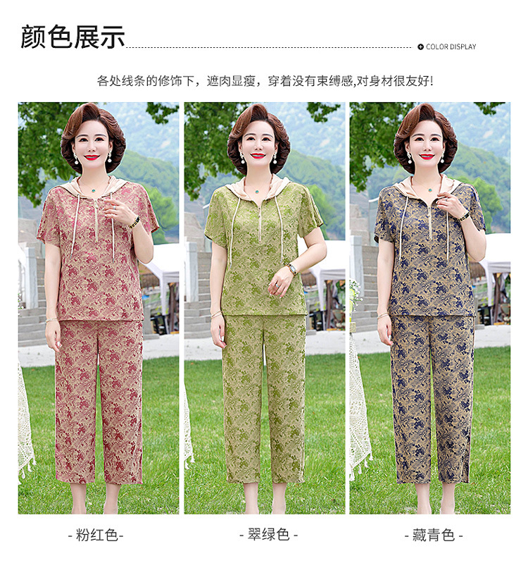 妈妈装短袖连帽卫衣2023夏装运动套装薄款中老年女装休闲两件套