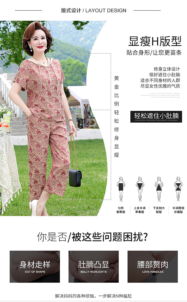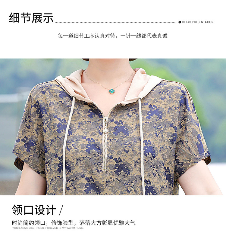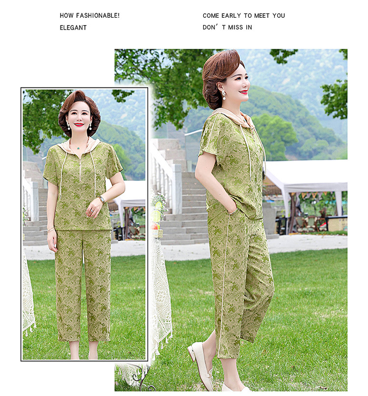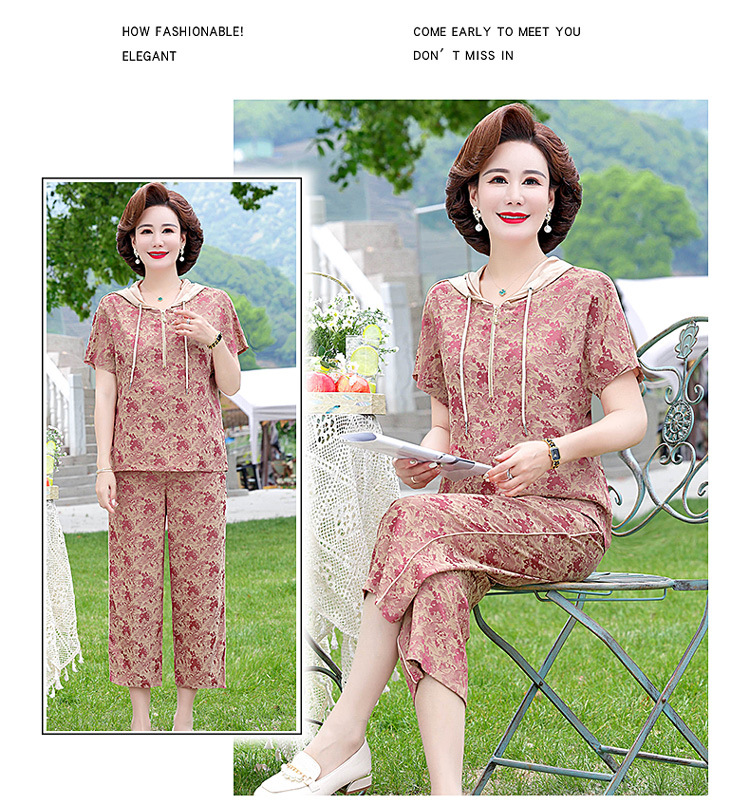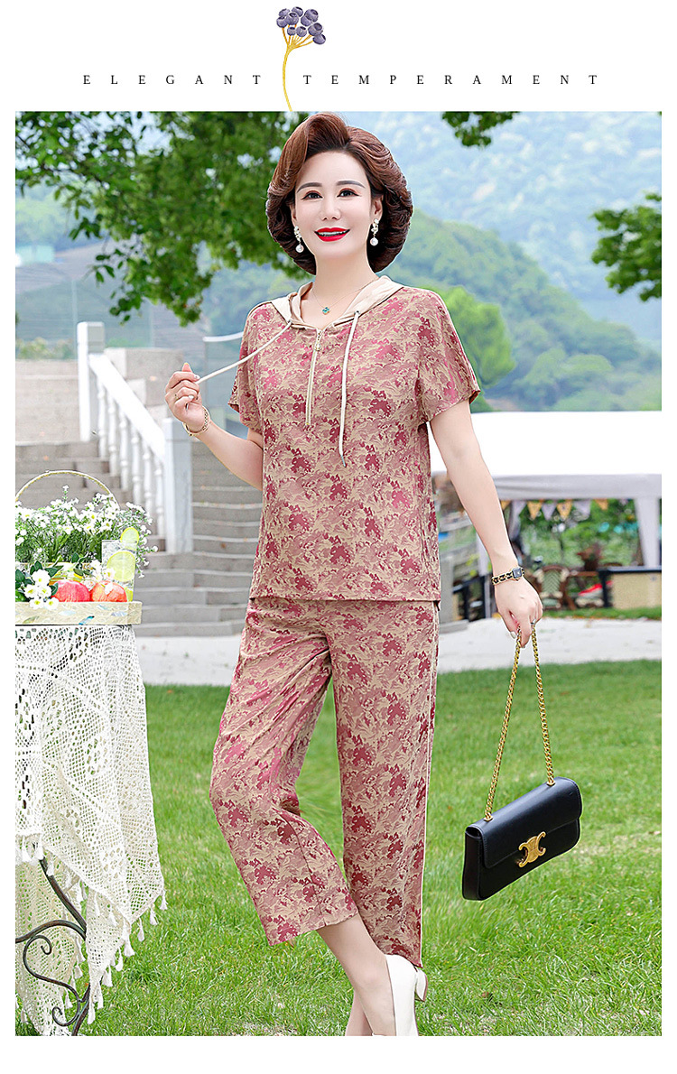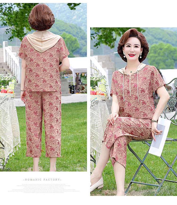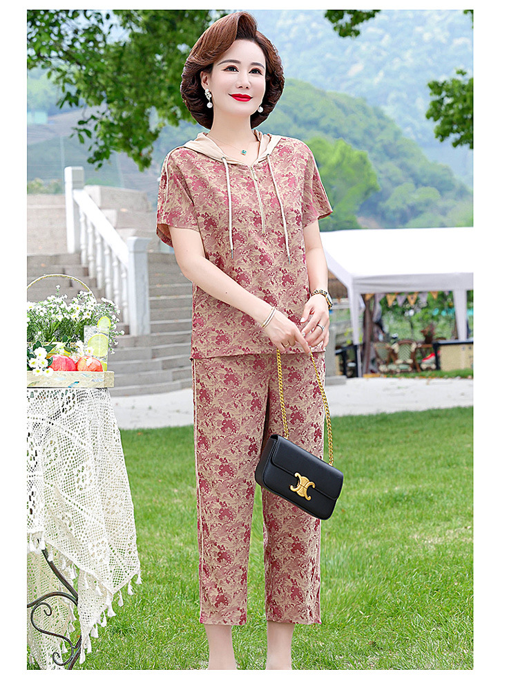 妈妈装短袖连帽卫衣2023夏装运动套装薄款中老年女装休闲两件套