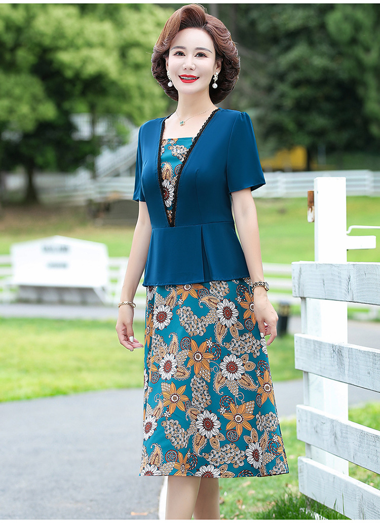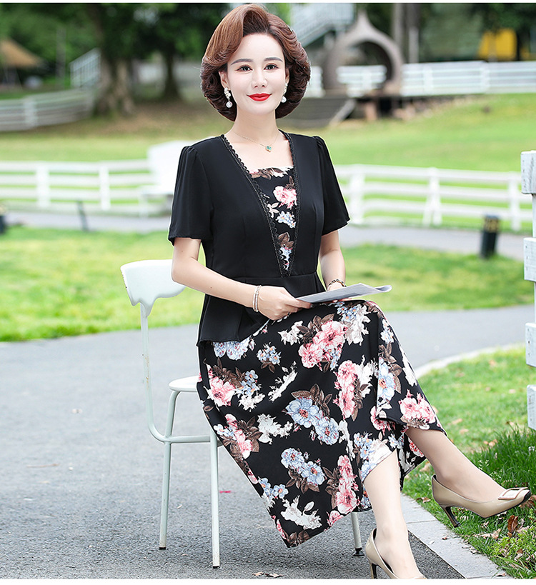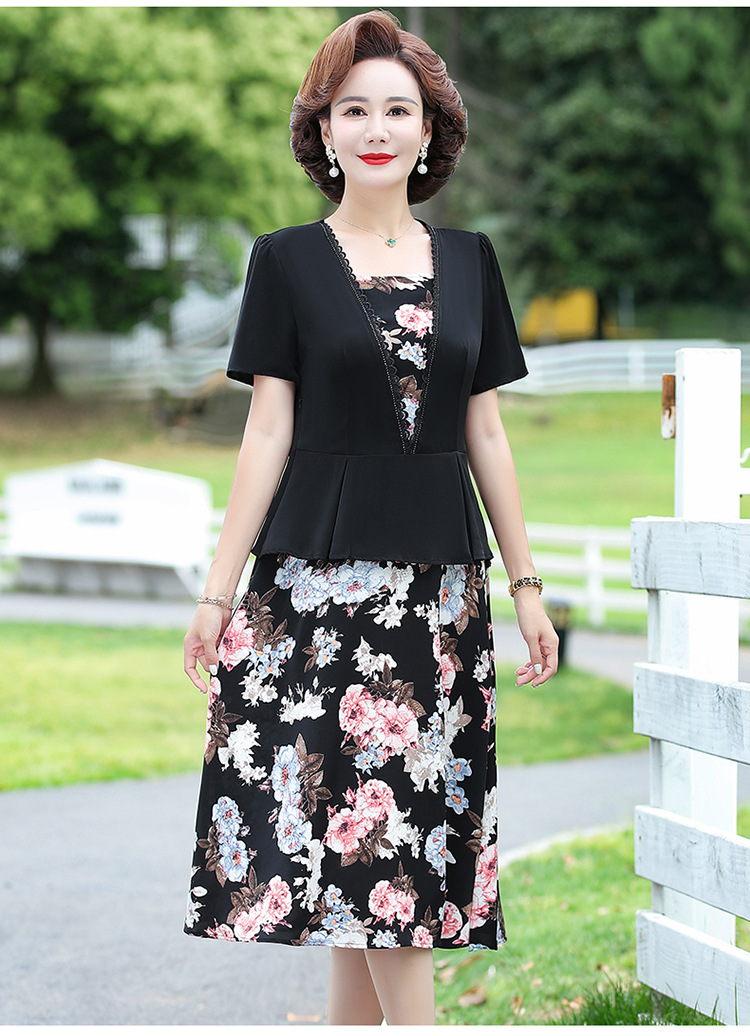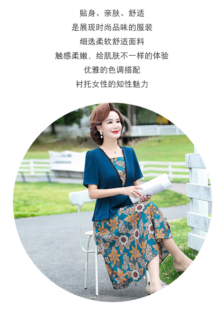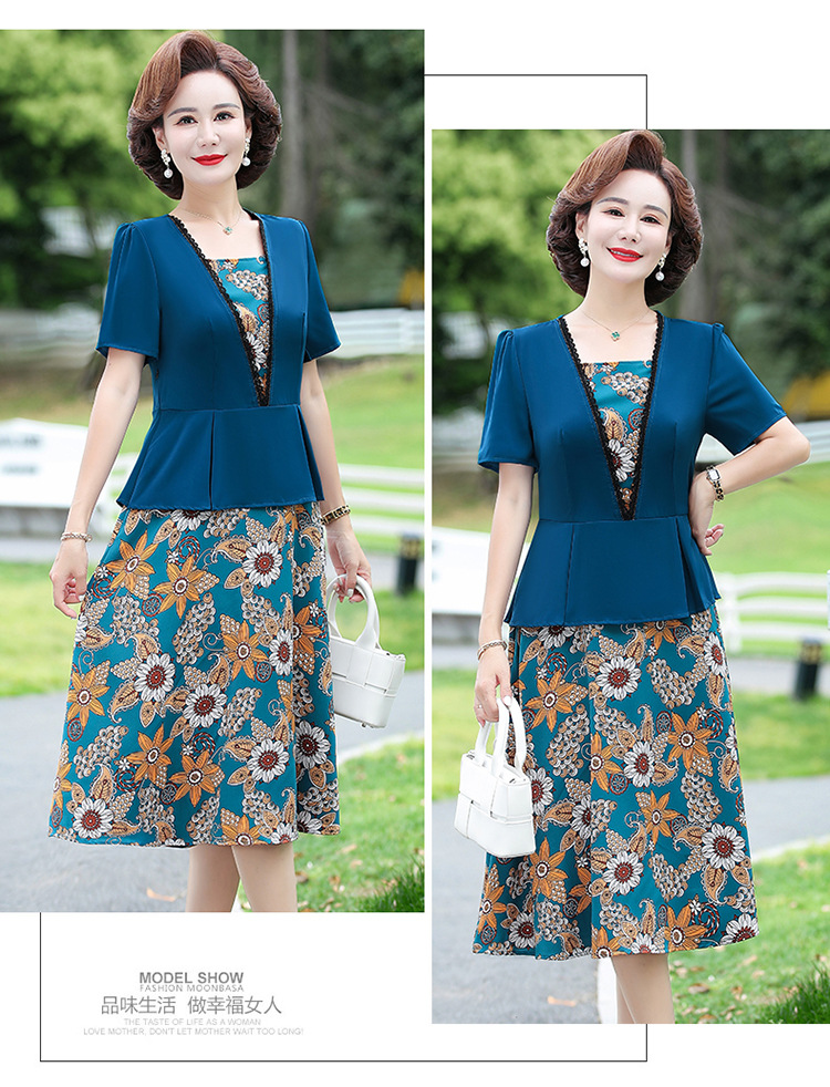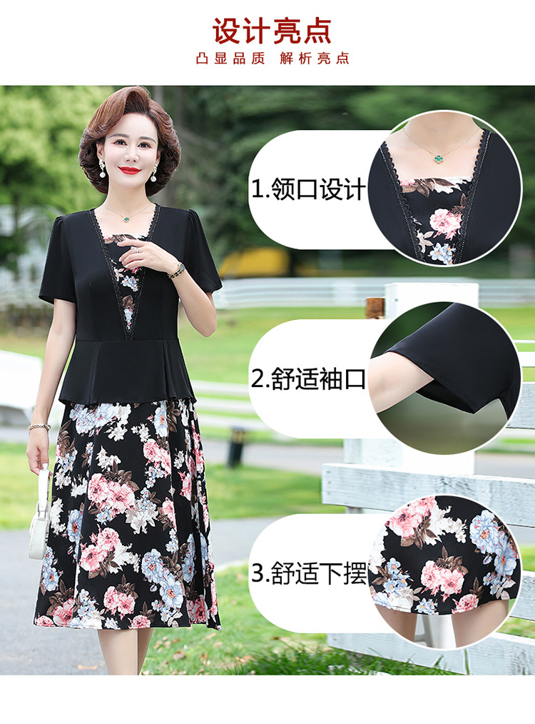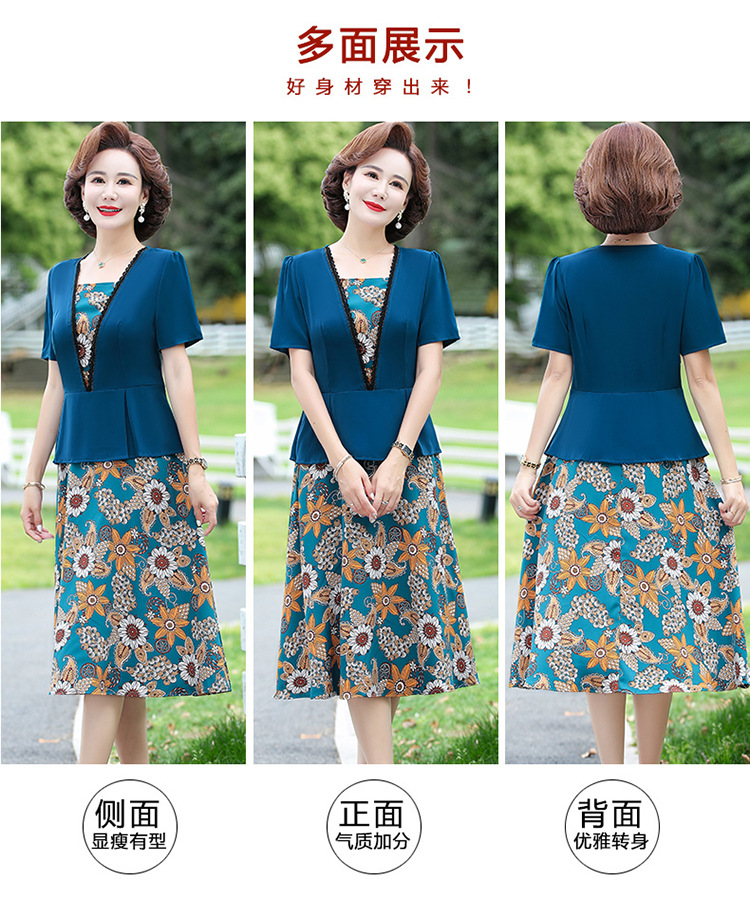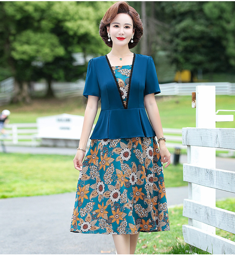中年妈妈夏装短袖连衣裙洋气新款50岁中老年女士假两件中长款裙子