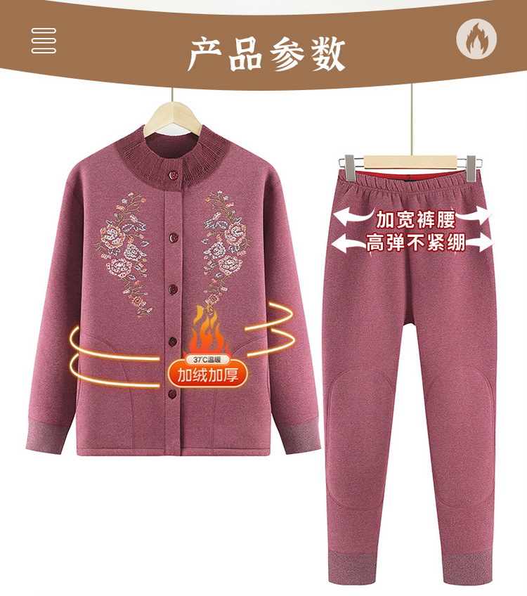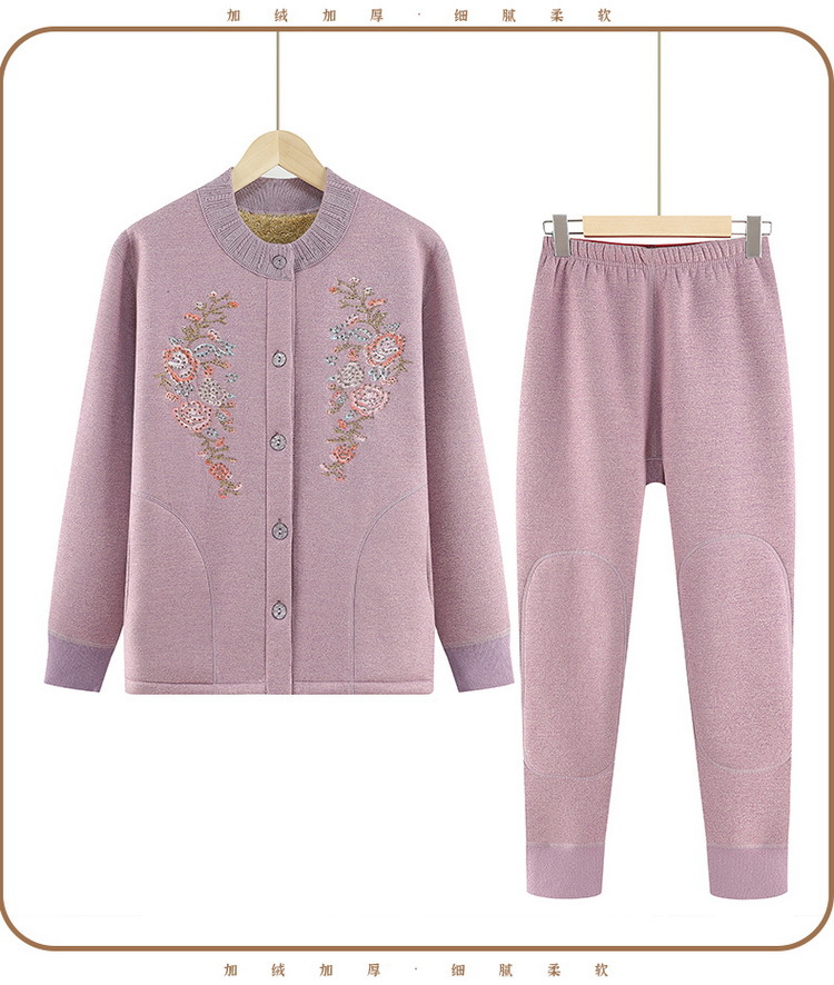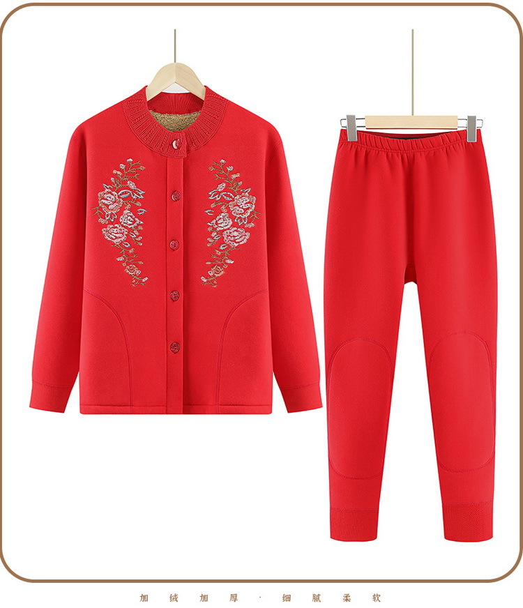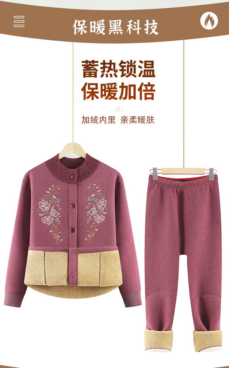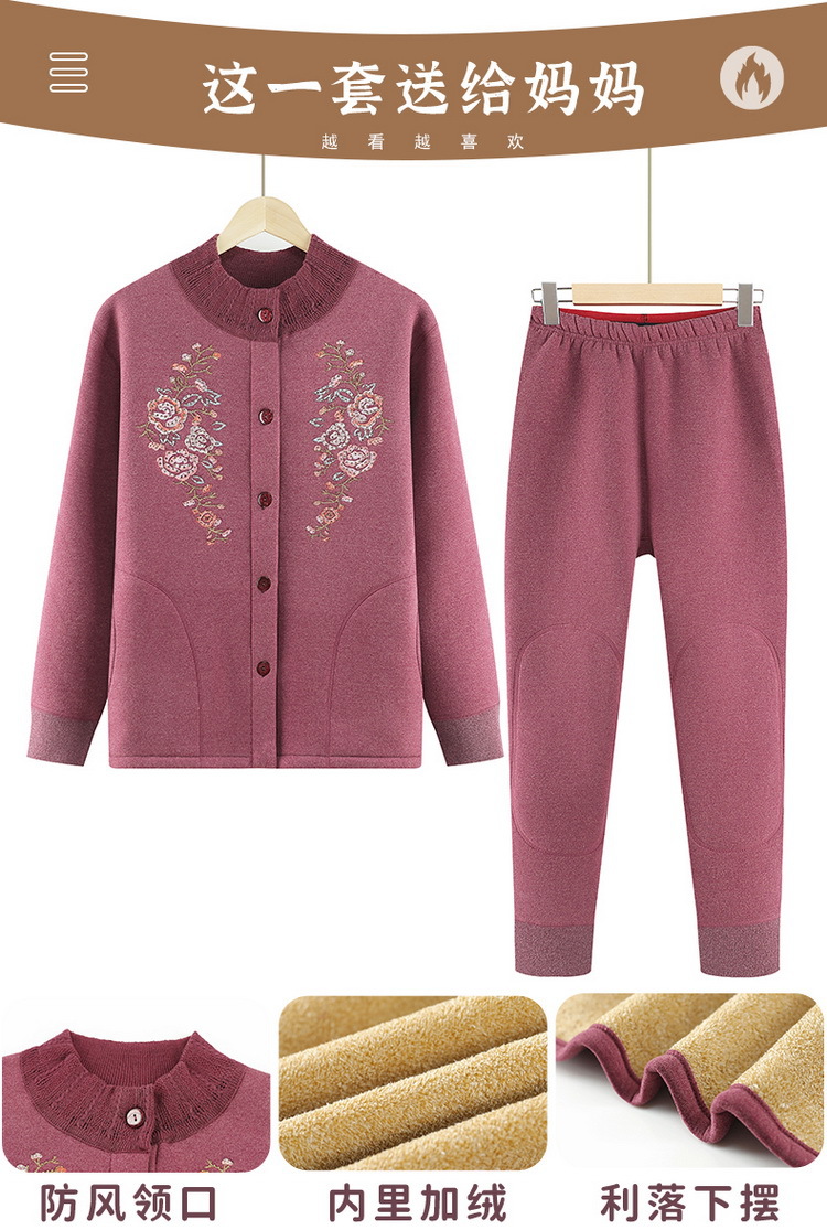 奶奶秋冬开衫保暖内衣中老年人女妈妈加绒加厚羊羔绒外套两件套装