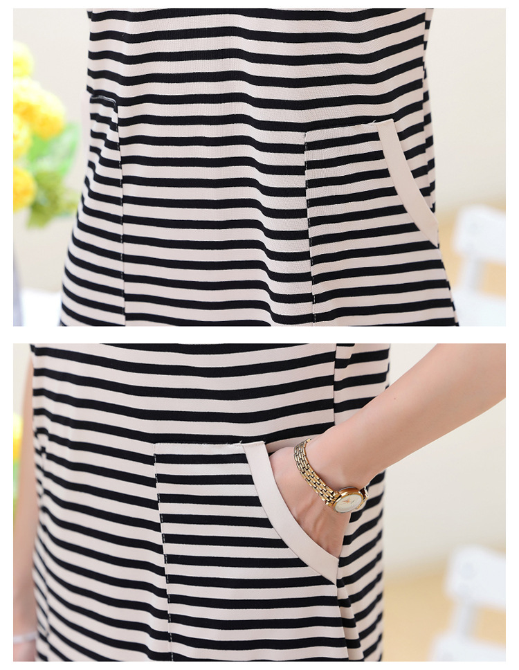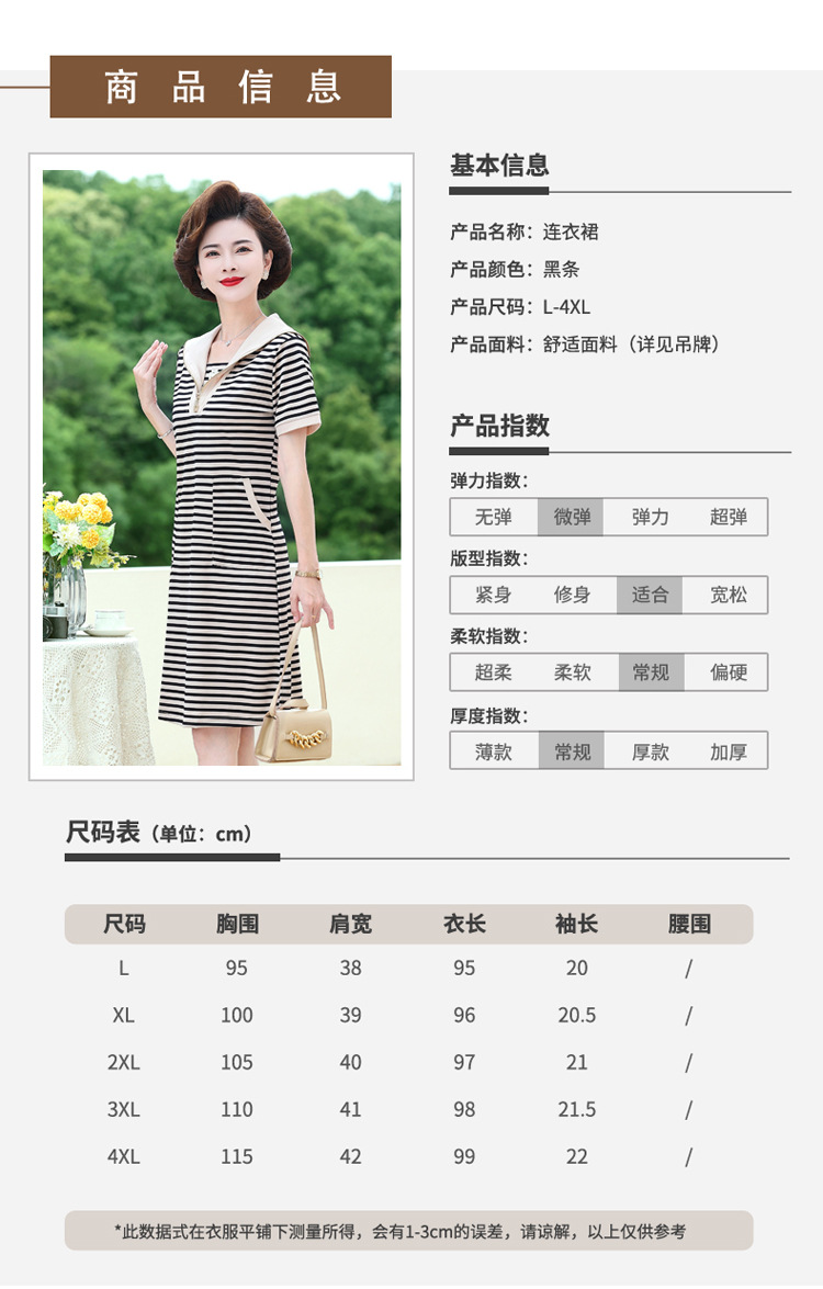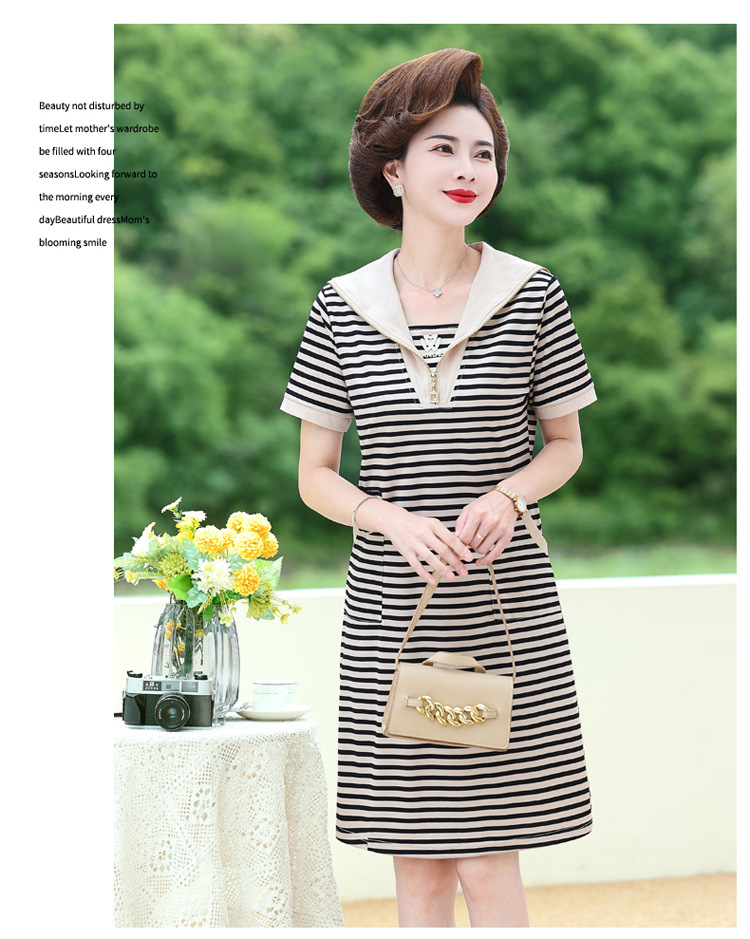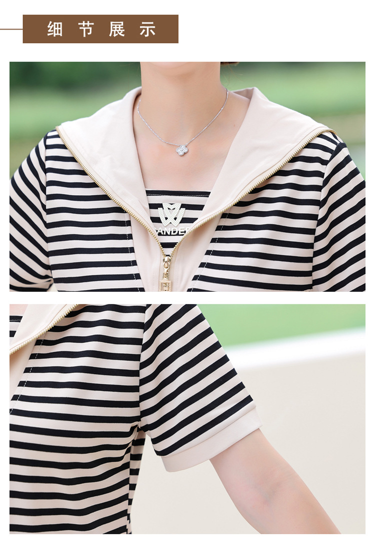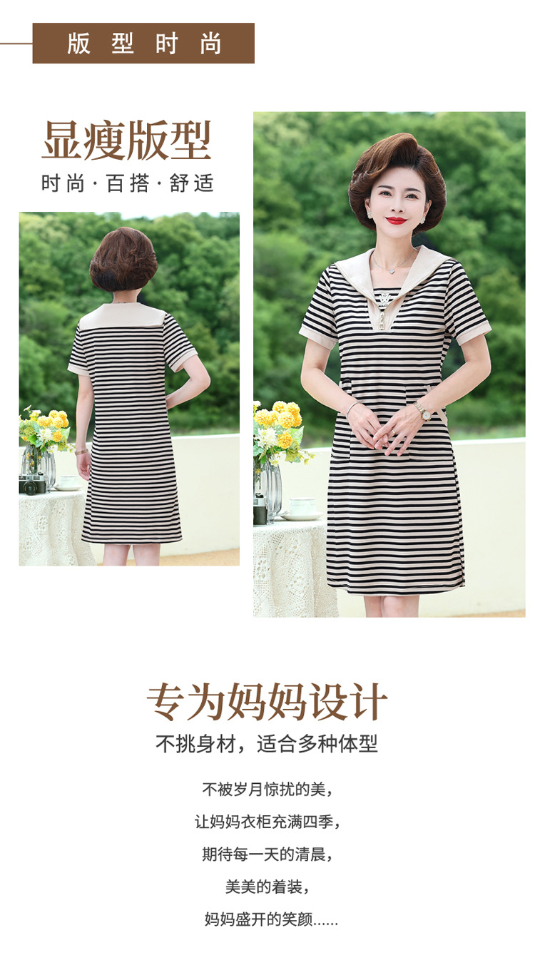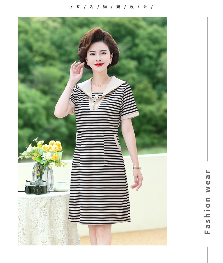 中年妈妈装连帽连衣裙夏季新款洋气女装中长款条纹海军领修身裙子