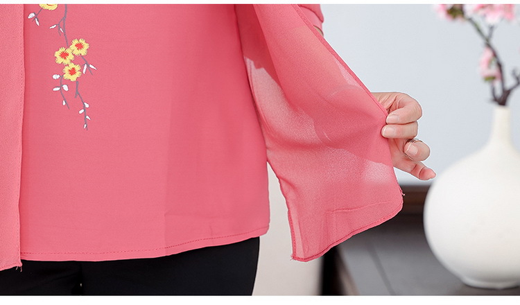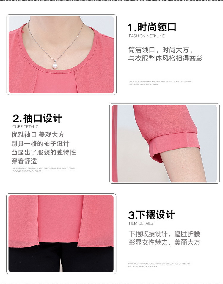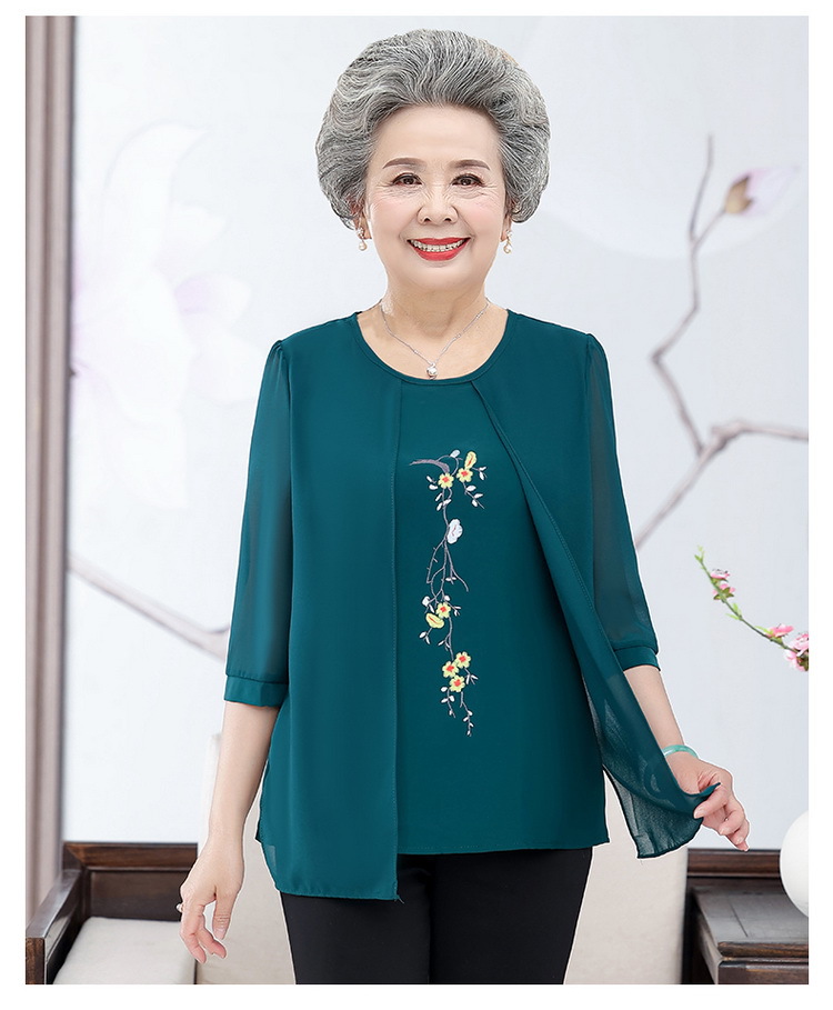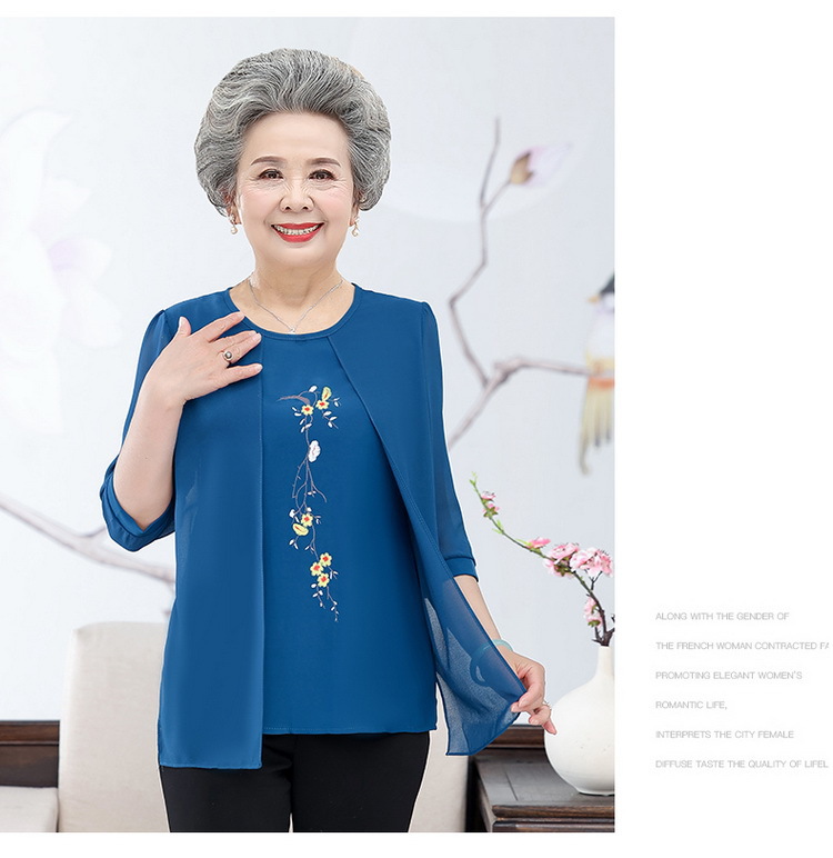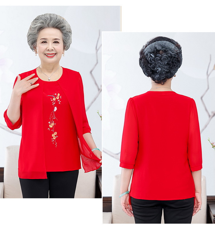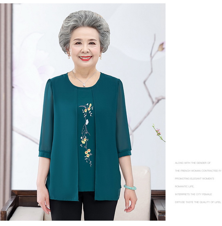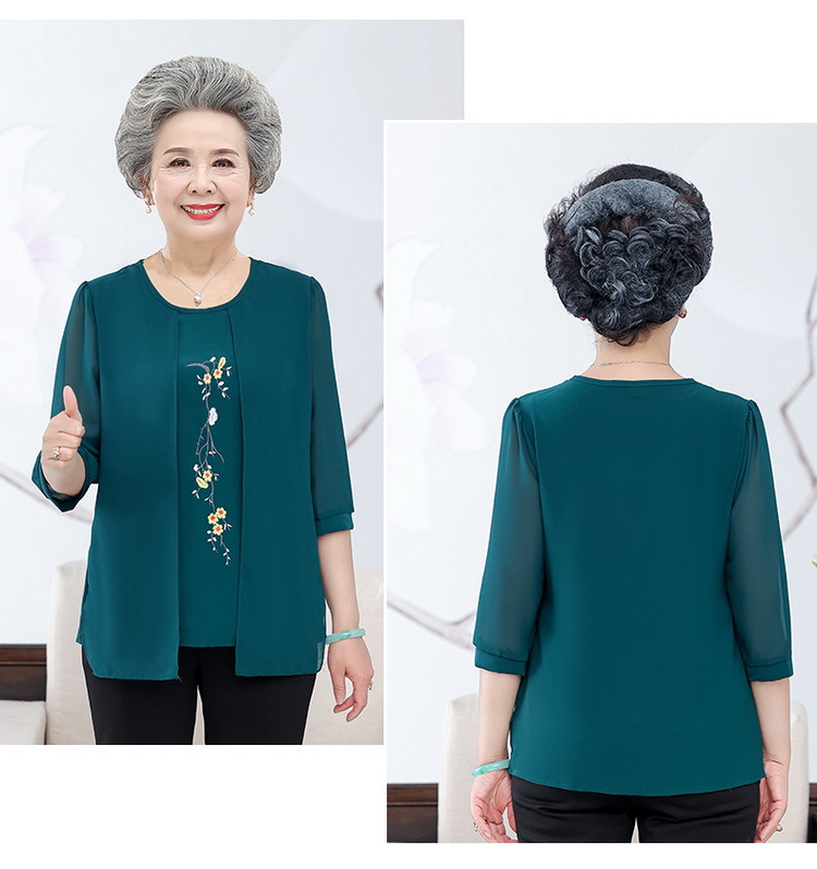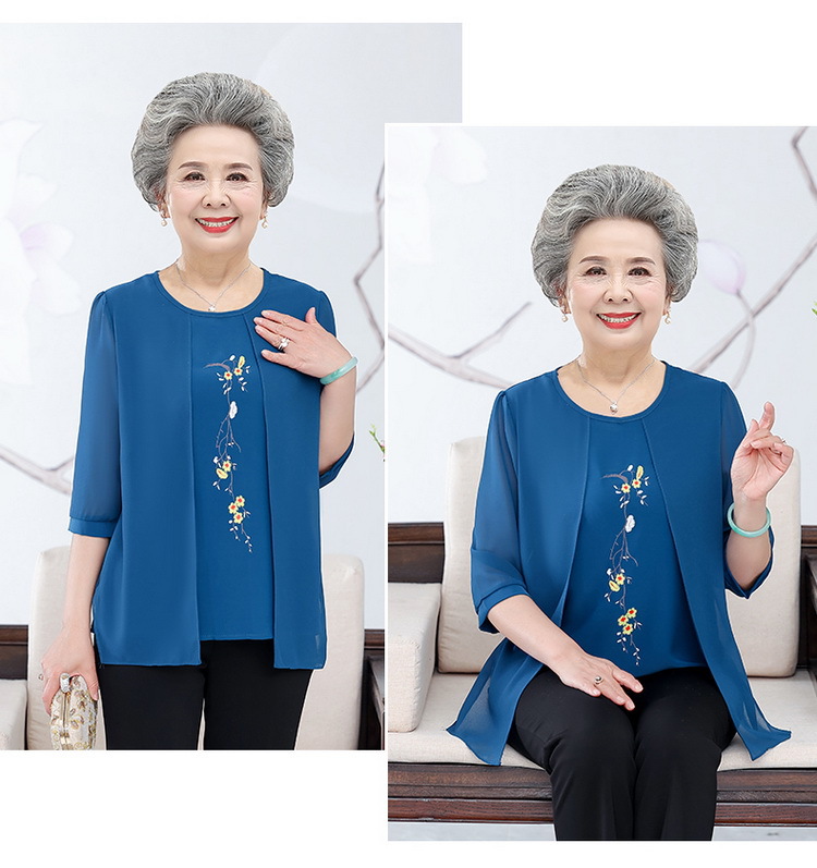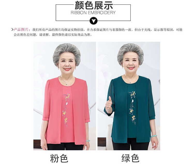 中老年人女夏装雪纺衫老太太衣服夏季T恤奶奶洋气中袖假两件上衣