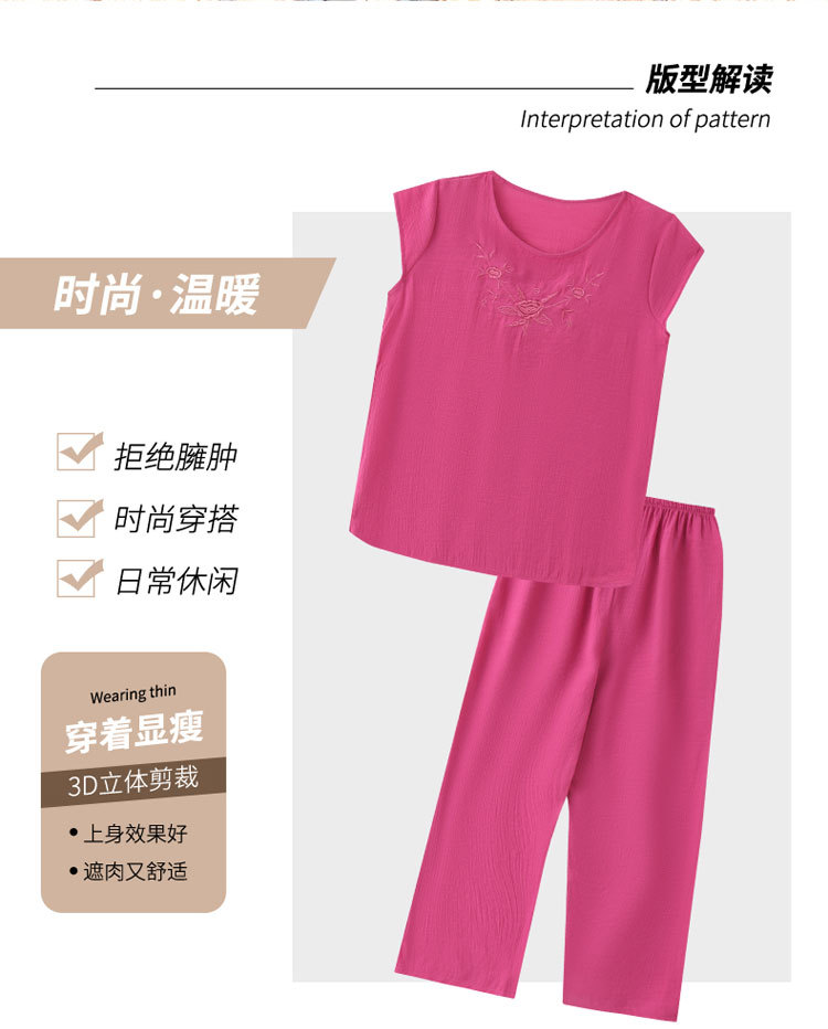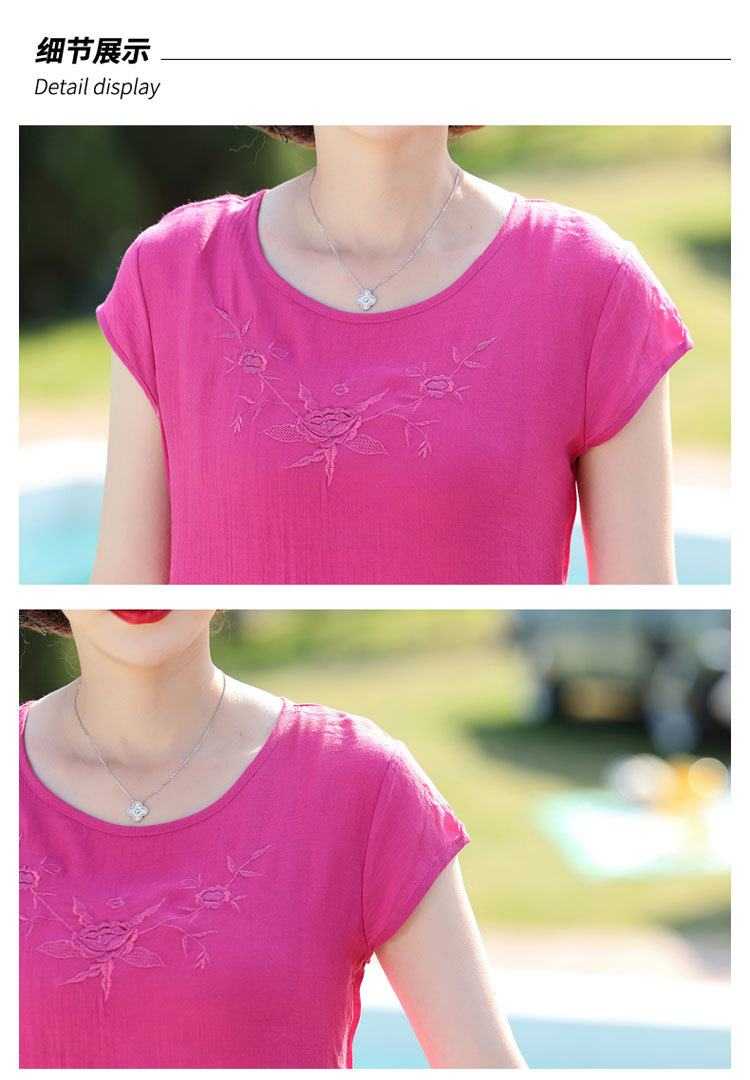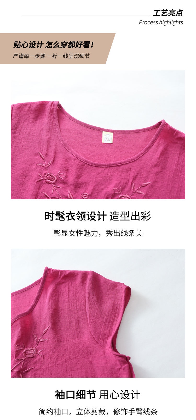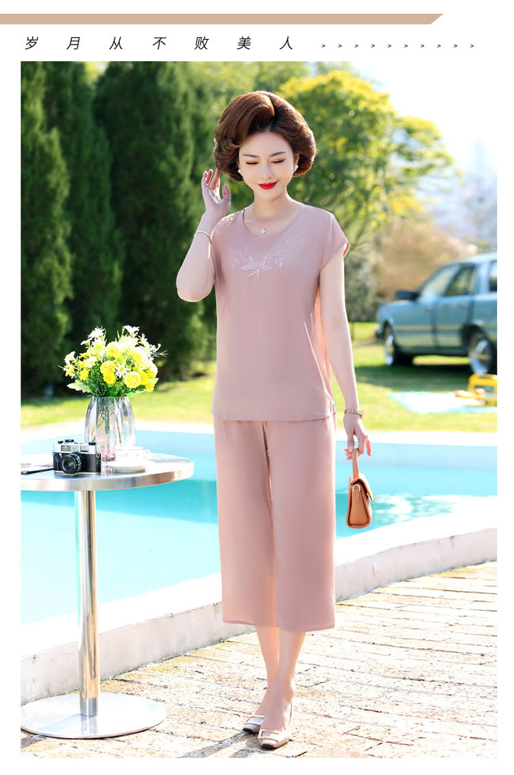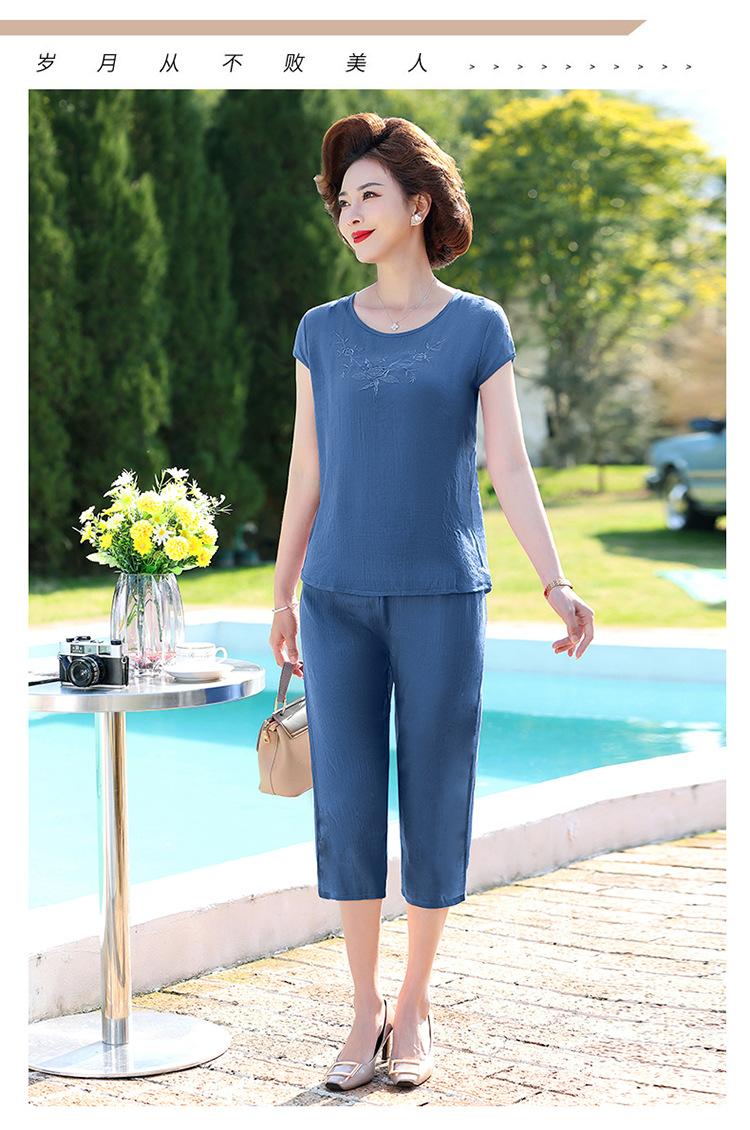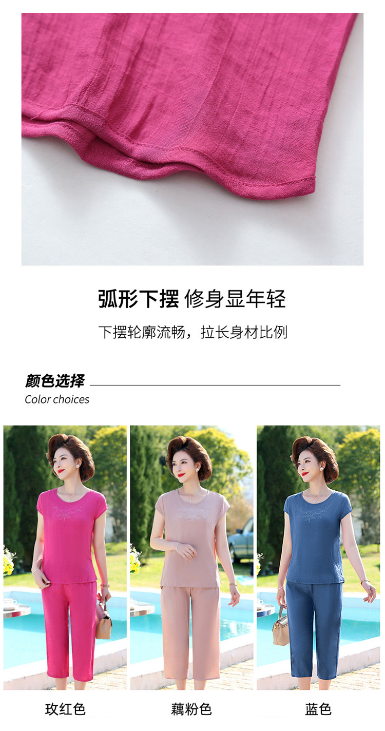 妈妈夏装棉麻套装天丝亚麻上衣绣花中老年短袖T恤七分裤女两件套