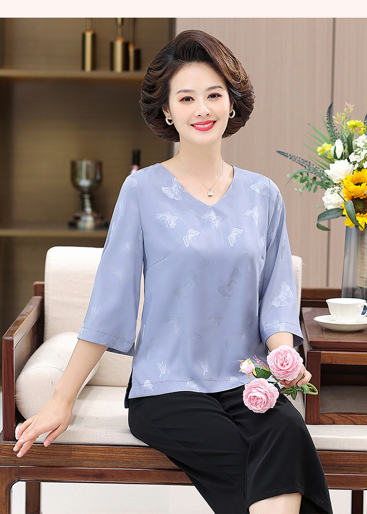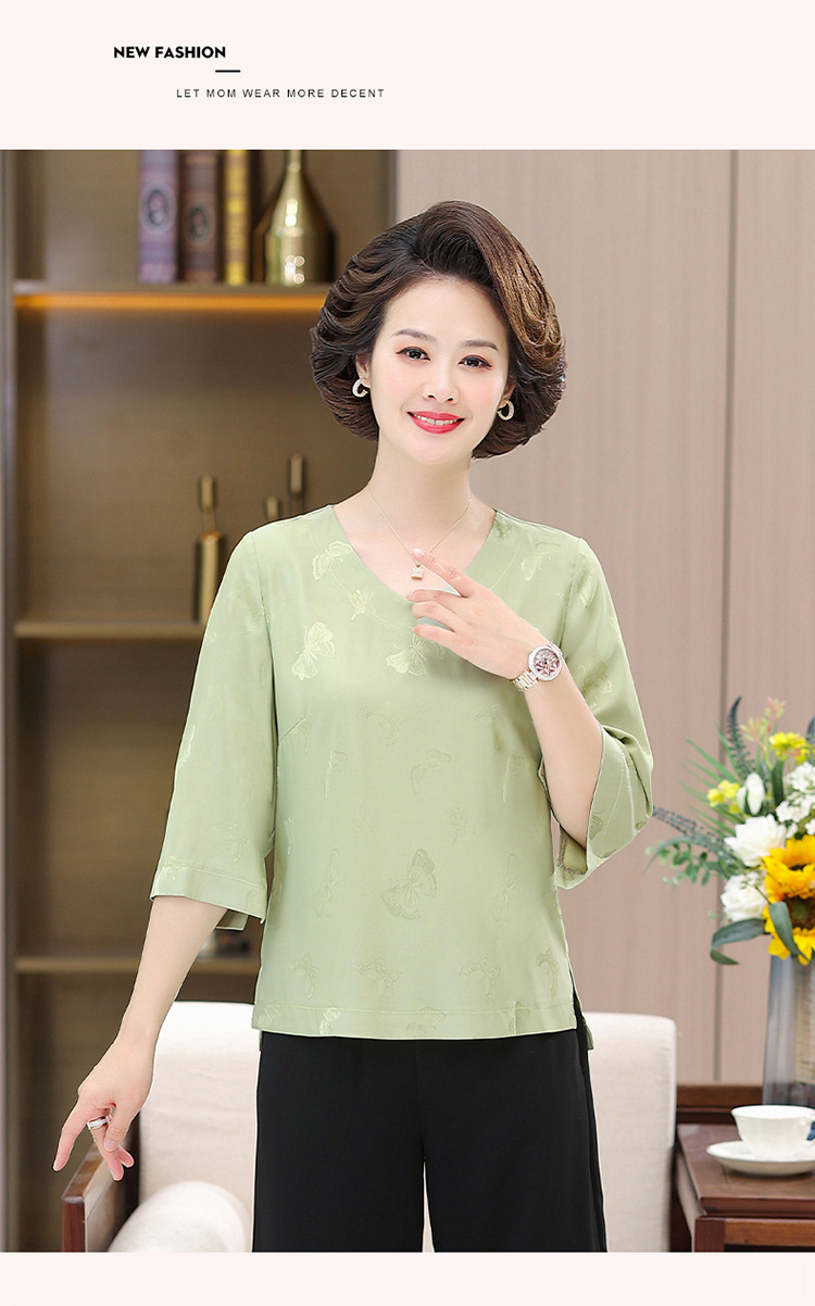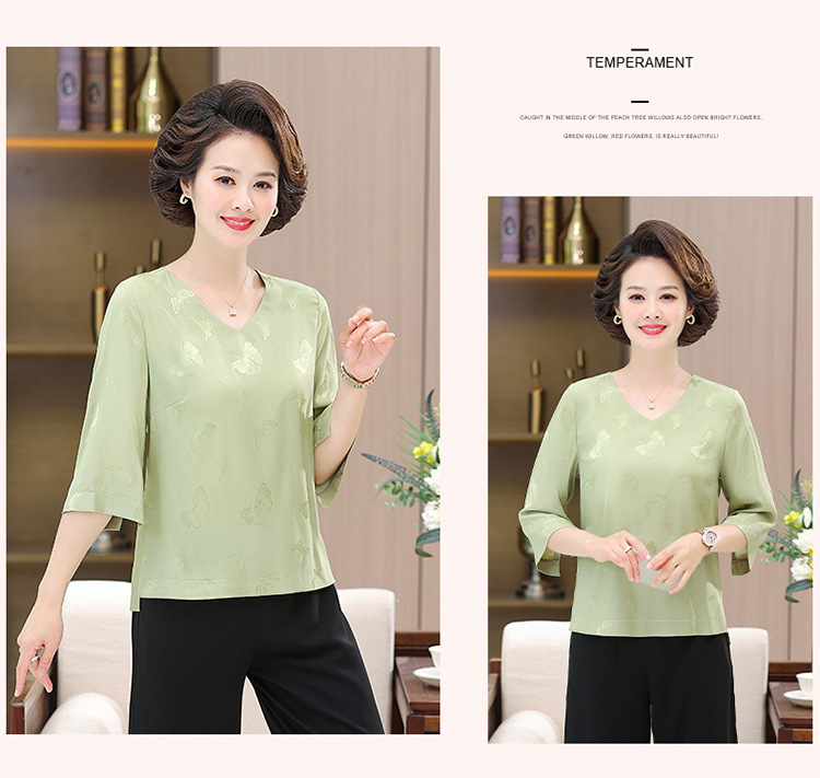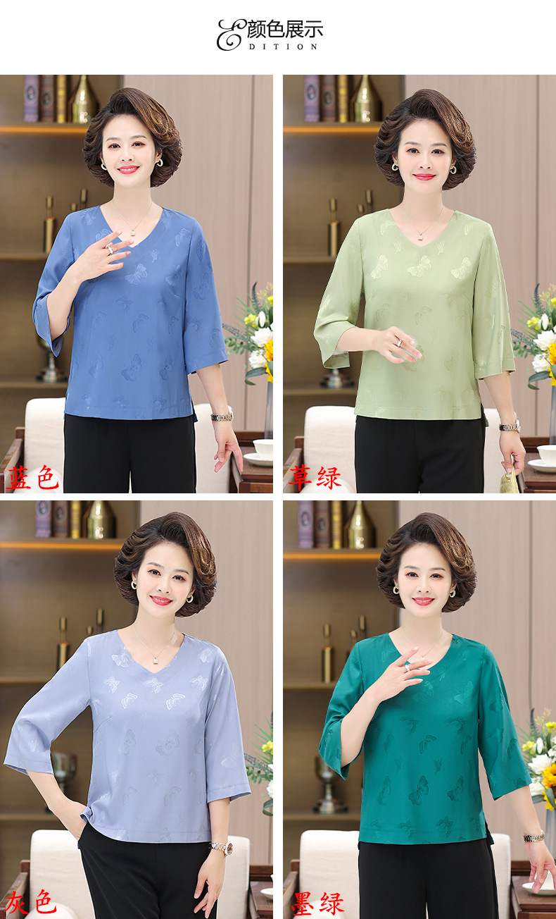 新款妈妈夏装中袖t恤中老年仿真丝上衣女时尚洋气宽松50岁60小衫