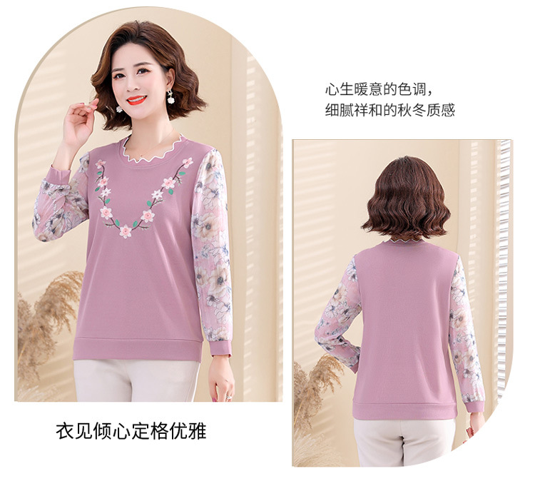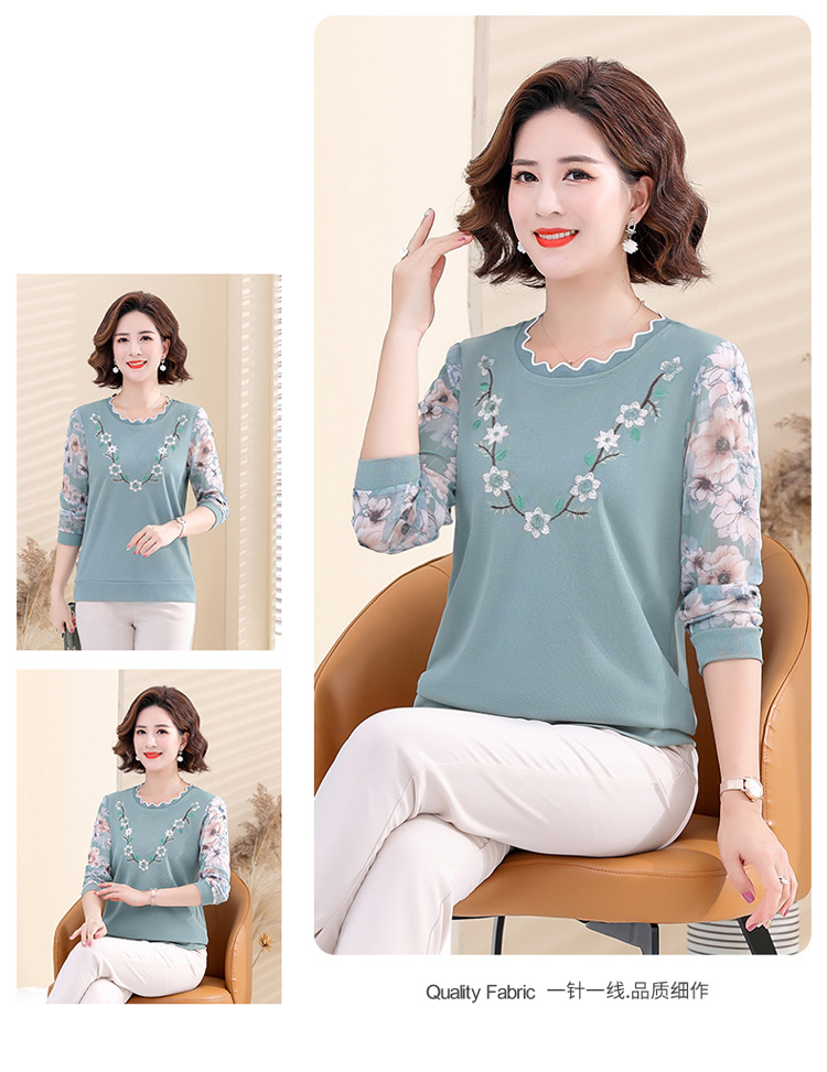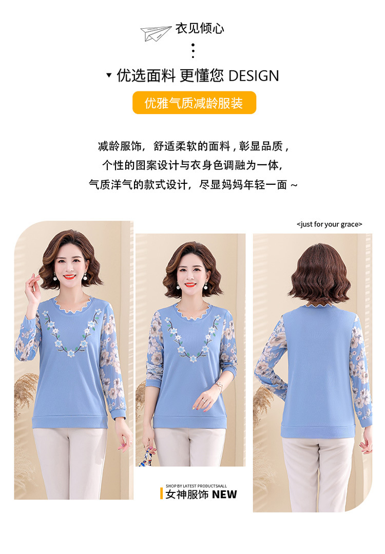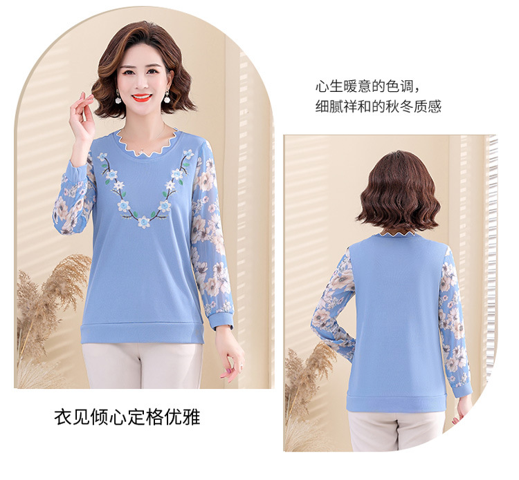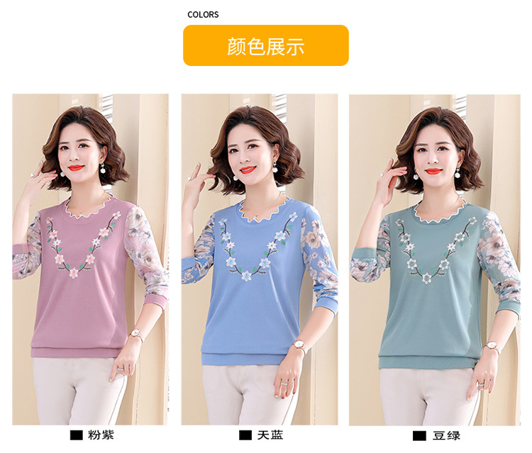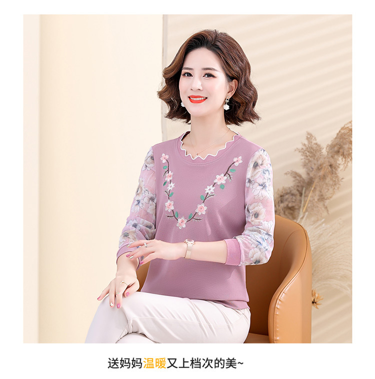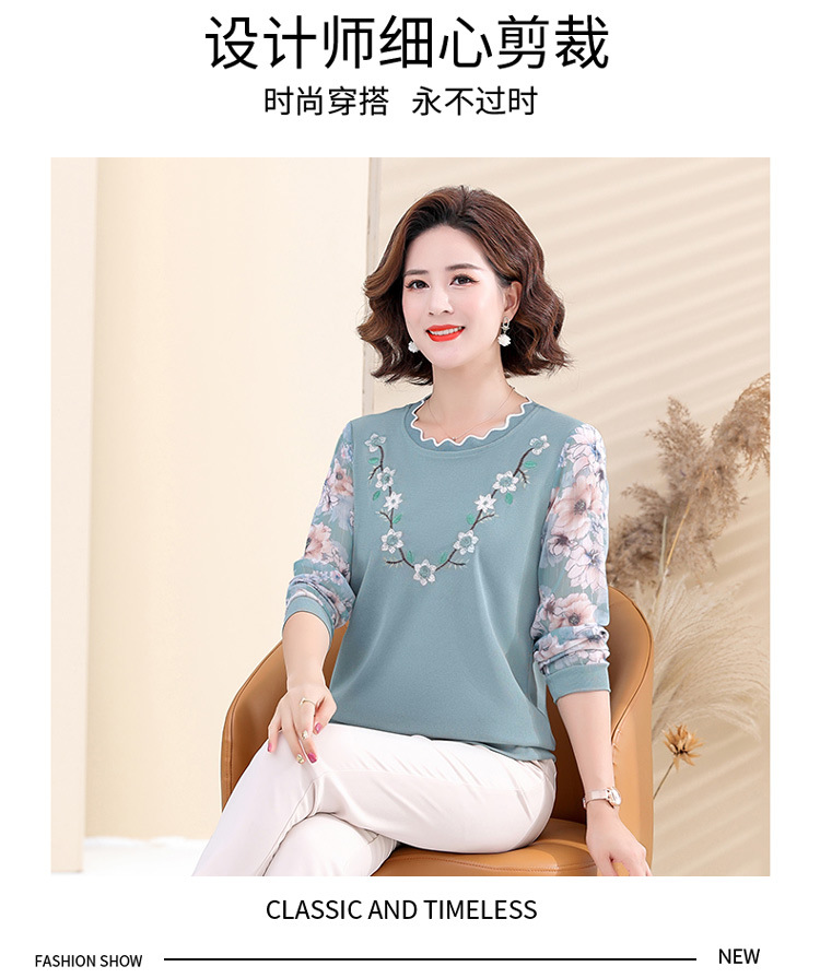 妈妈春装圆领T恤2023新款洋气上衣中年女装春秋长袖短款打底小衫