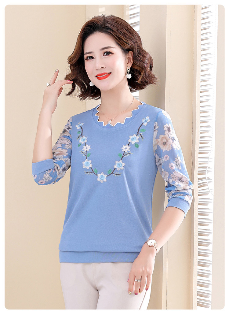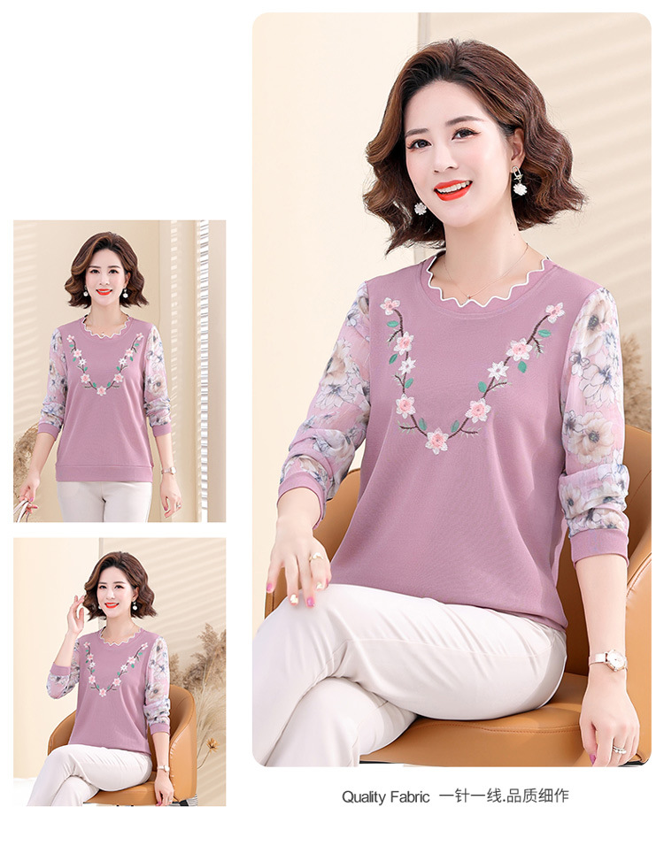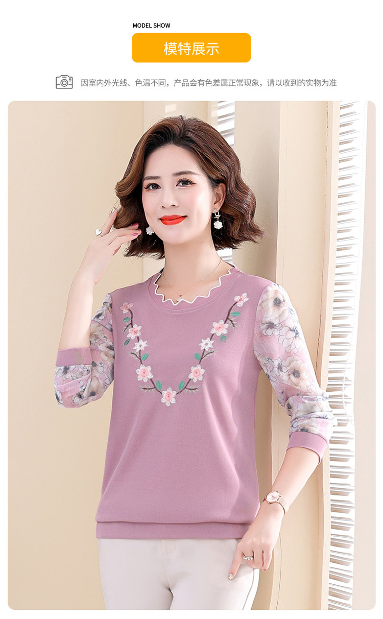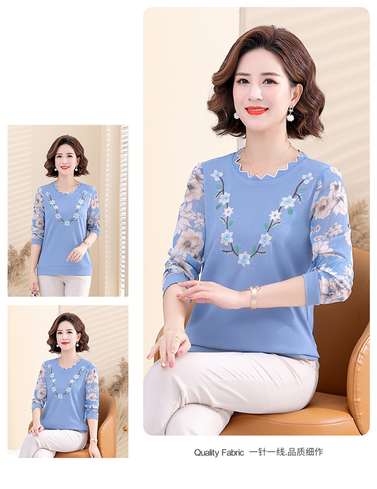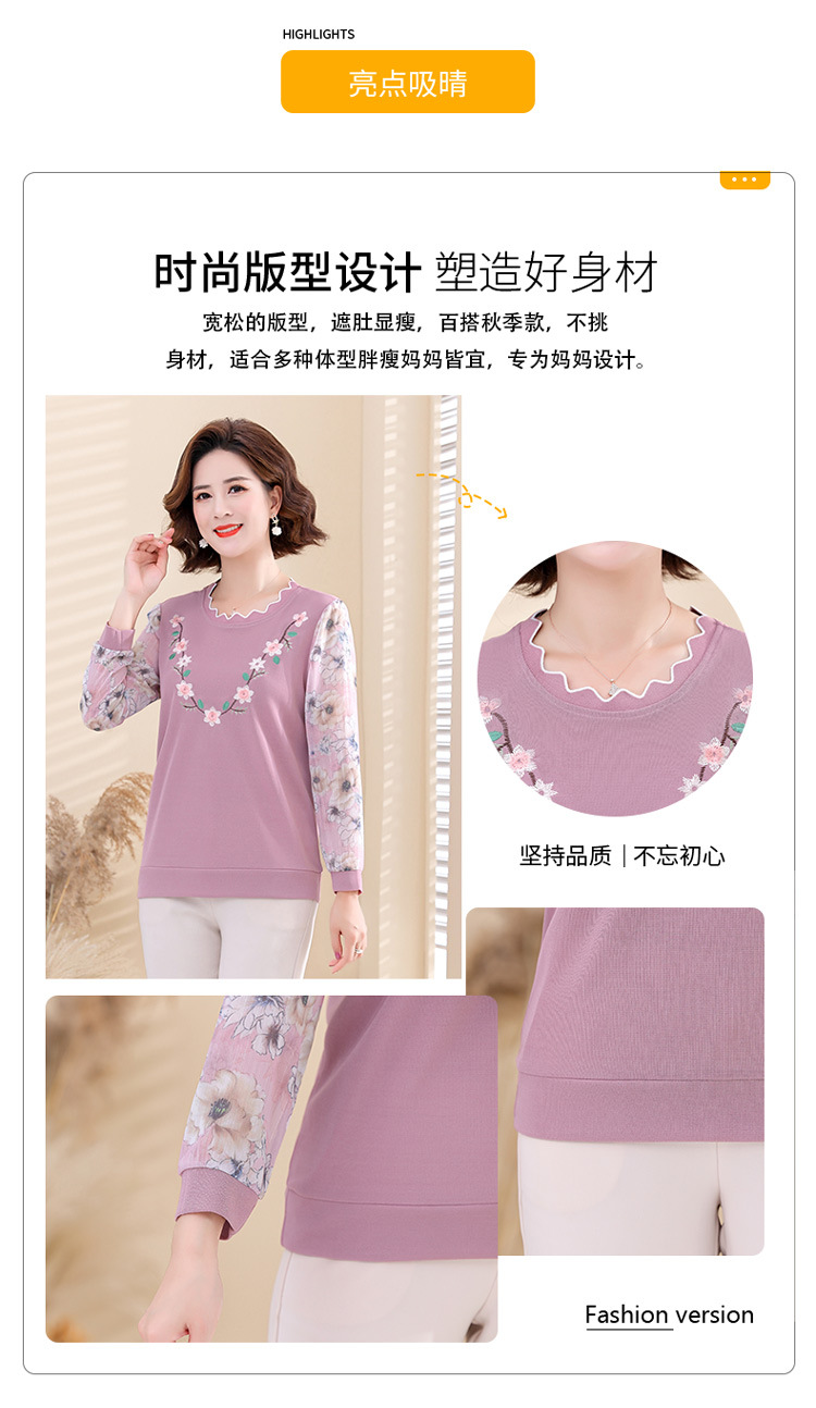 妈妈春装圆领T恤2023新款洋气上衣中年女装春秋长袖短款打底小衫