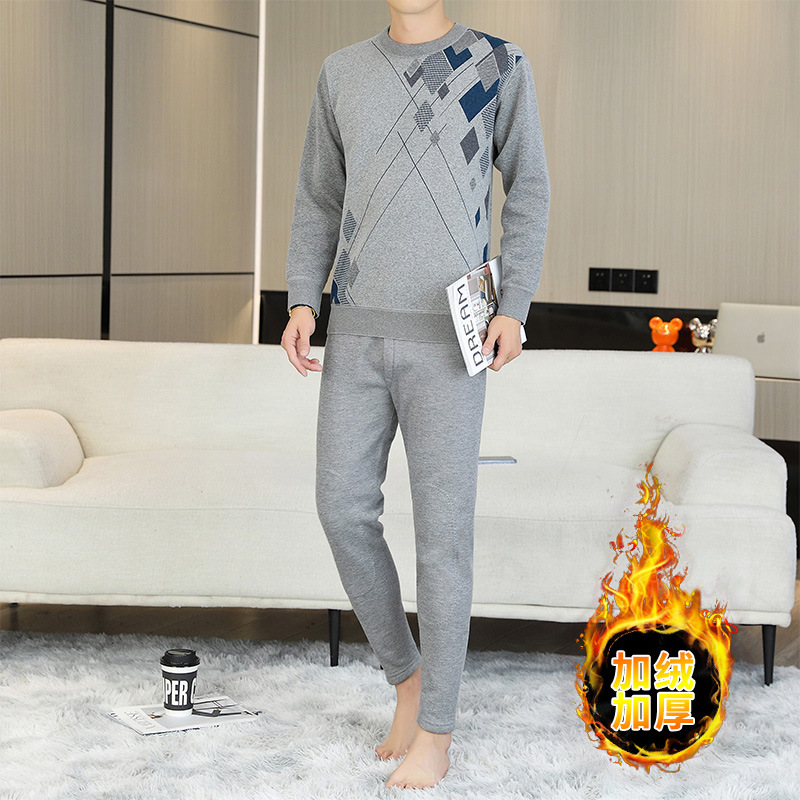 中青年男士冬季保暖内衣套装爸爸加厚加绒圆领提花棉毛衫中老年人