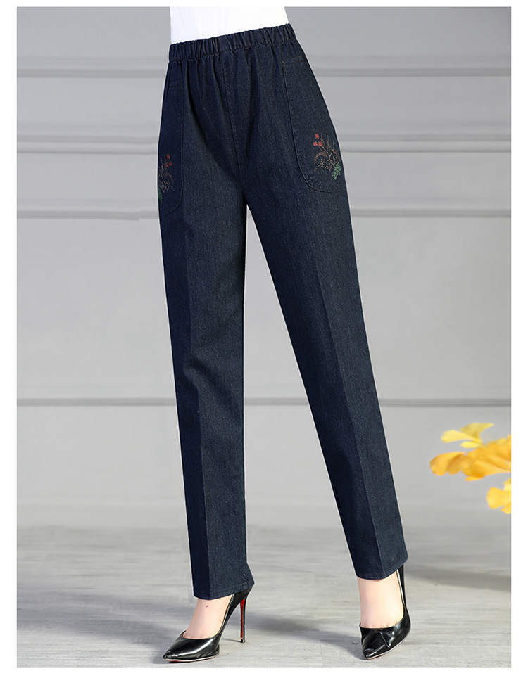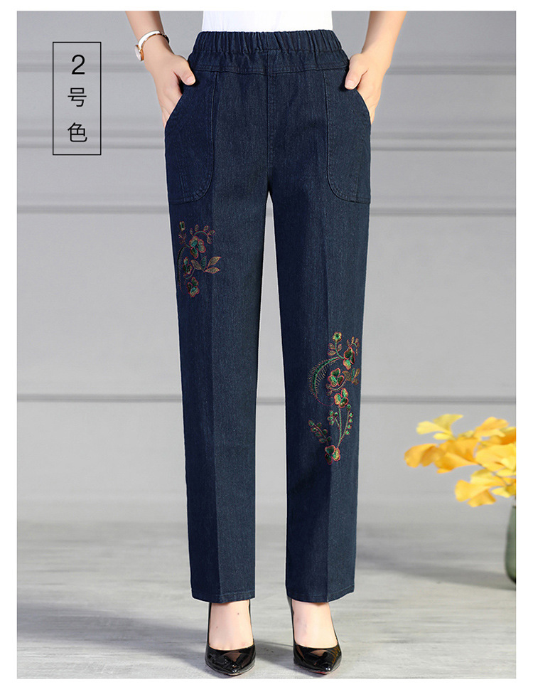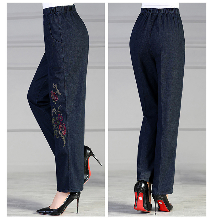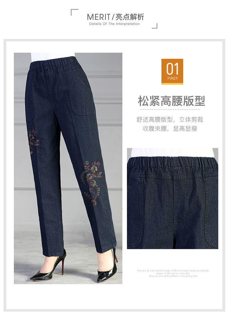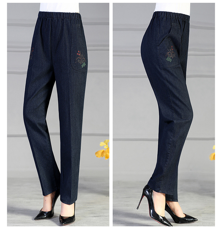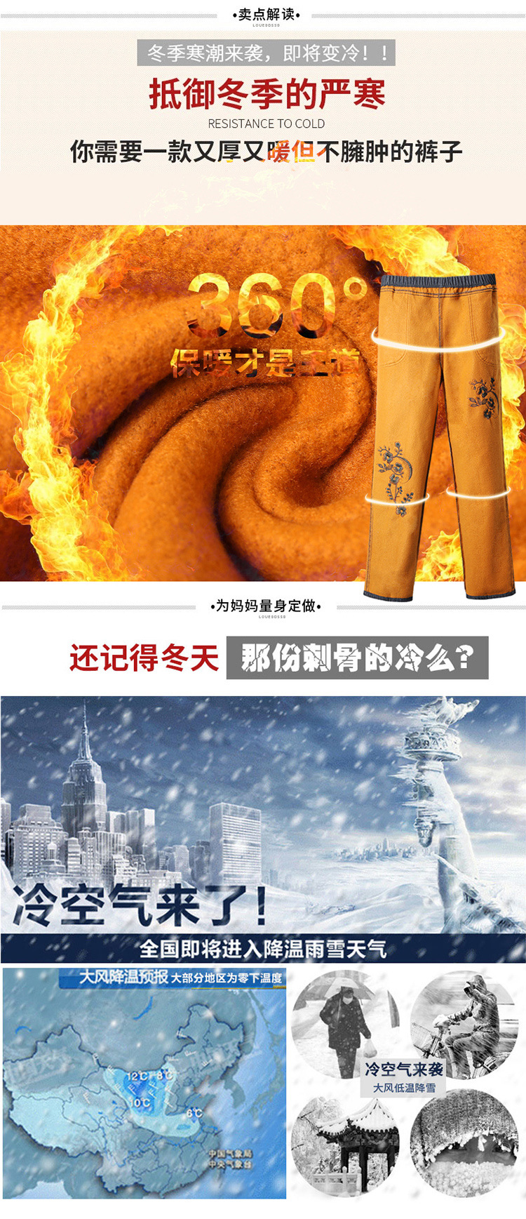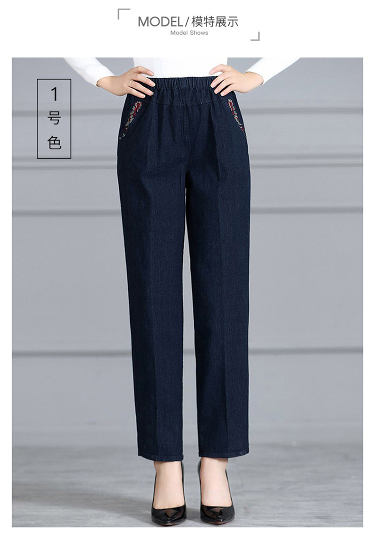 妈妈秋冬松紧高腰加绒牛仔裤中老年女宽松直筒保暖加厚弹力长裤子