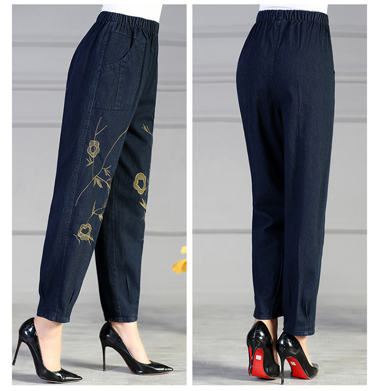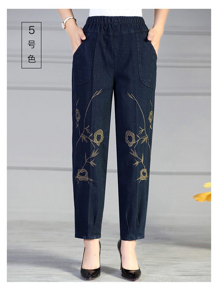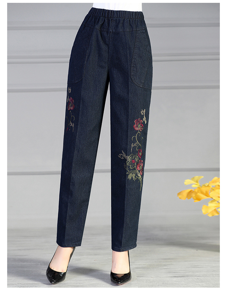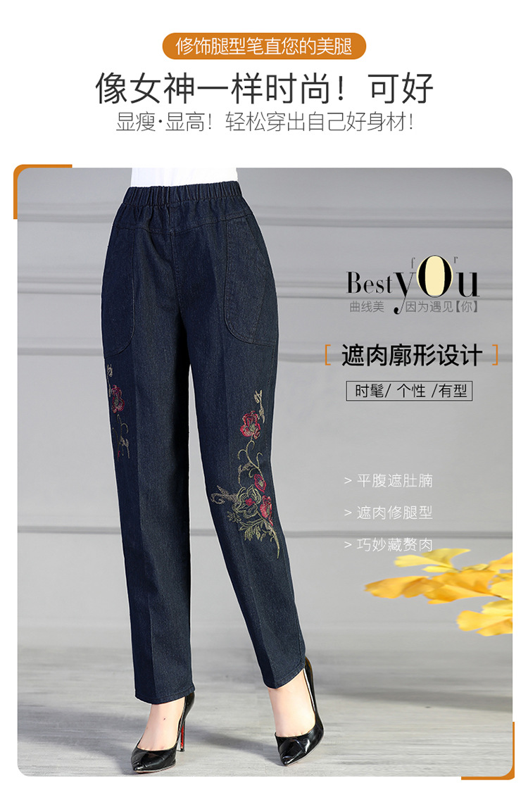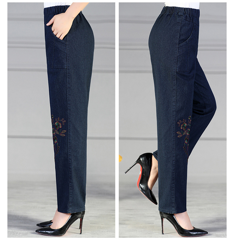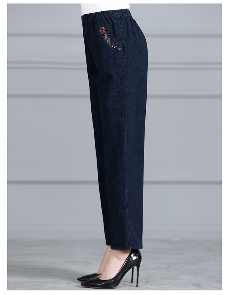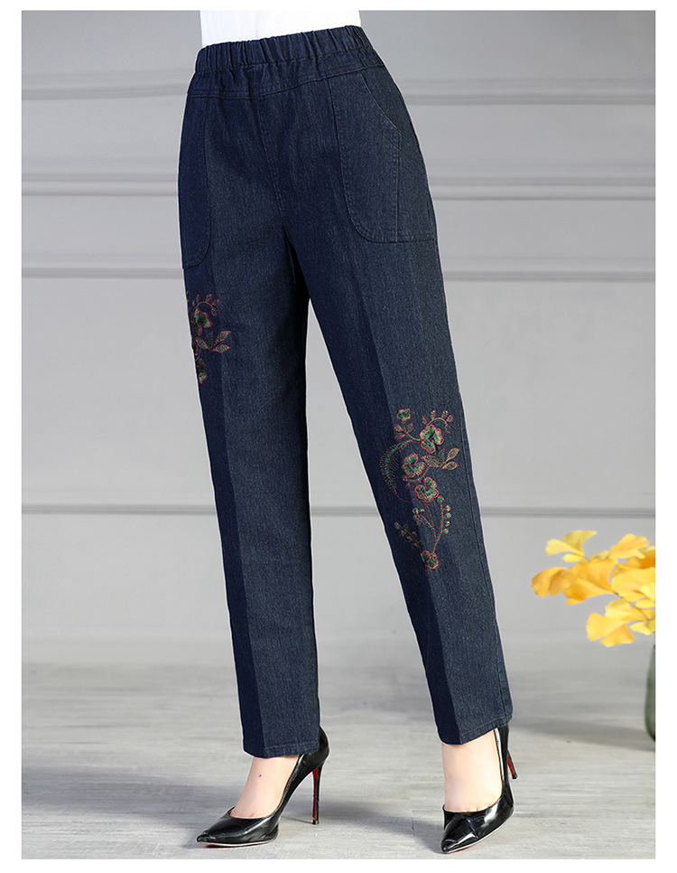 妈妈秋冬松紧高腰加绒牛仔裤中老年女宽松直筒保暖加厚弹力长裤子