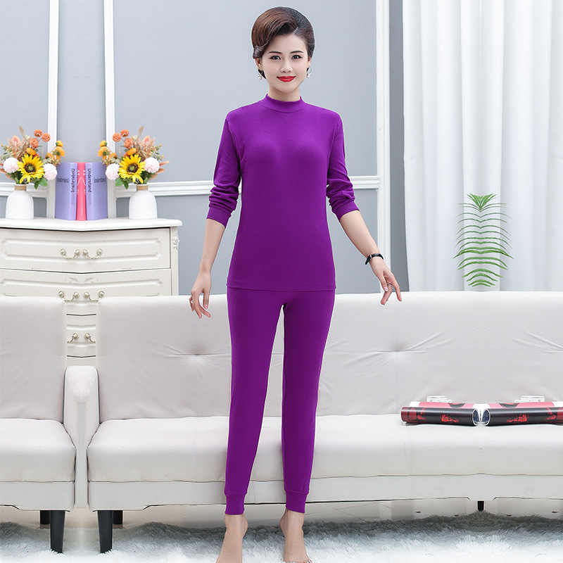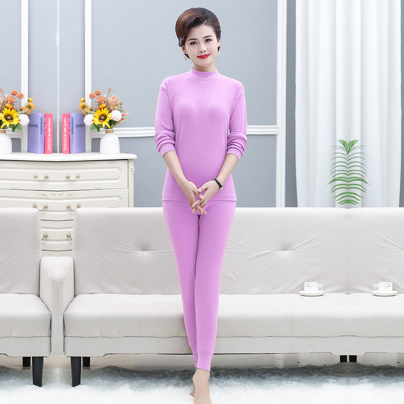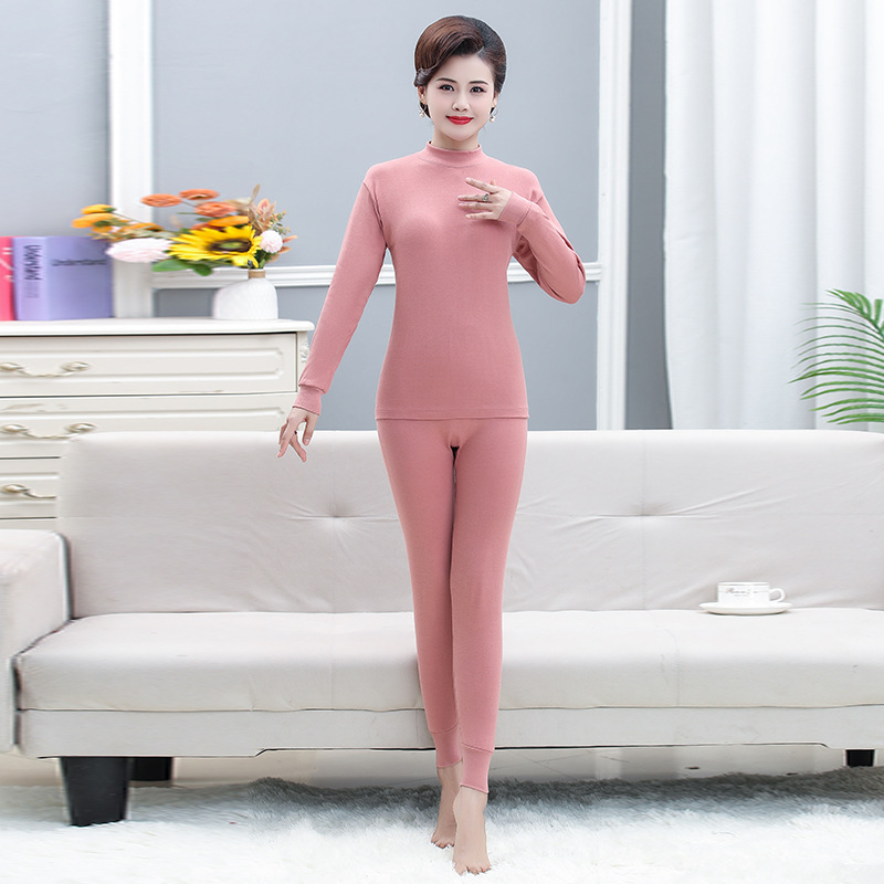 中老年人秋衣秋裤女纯棉保暖内衣全棉纯色中高领妈妈棉毛衫套装