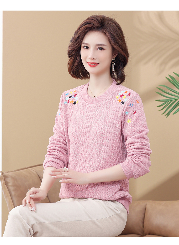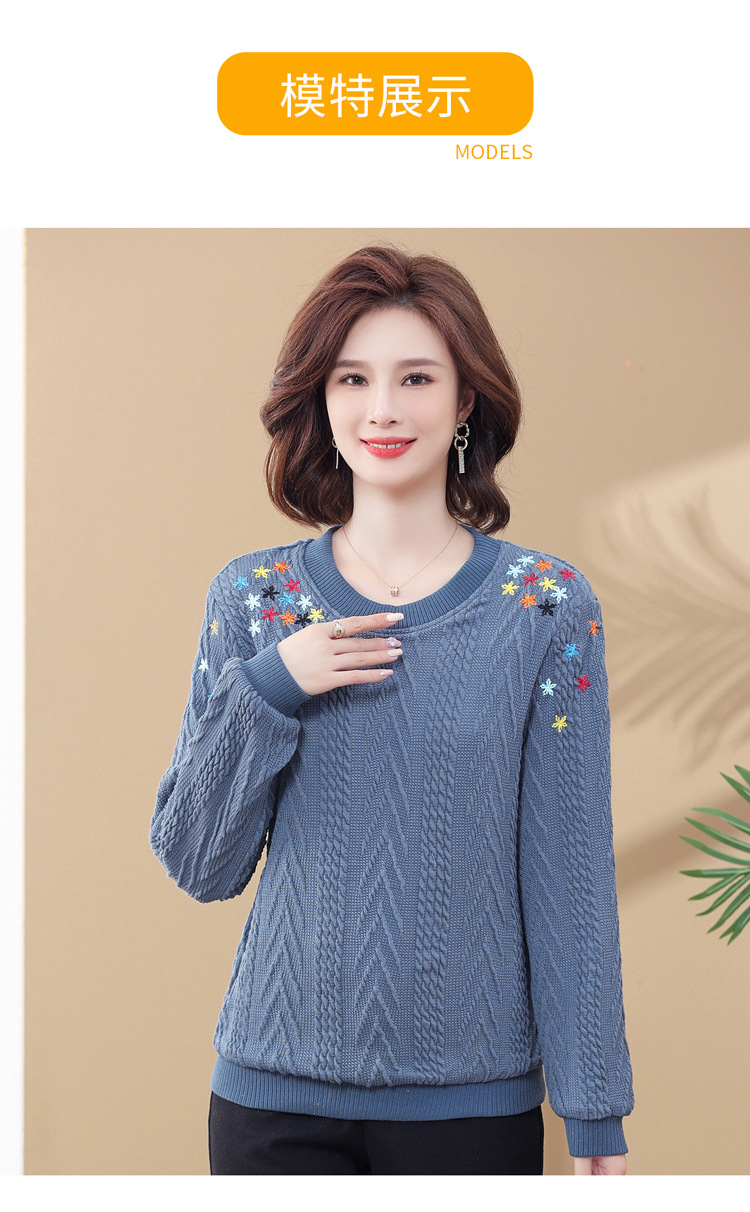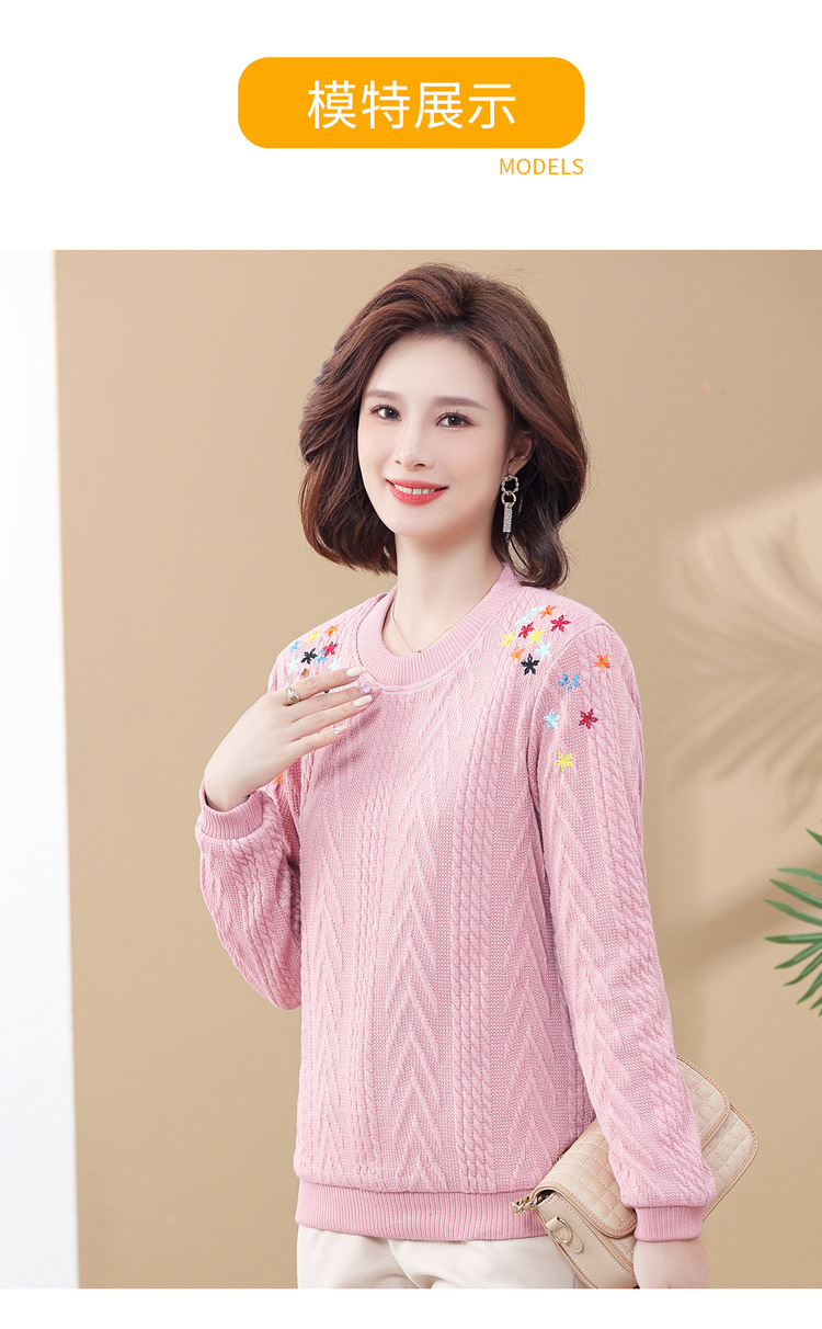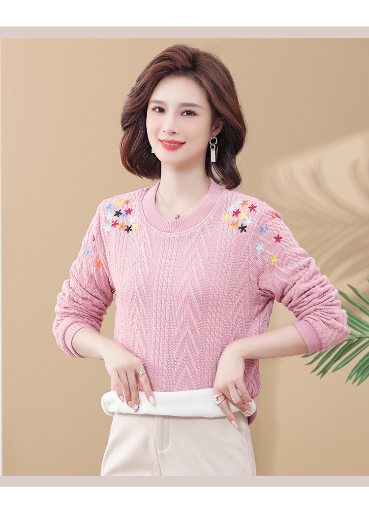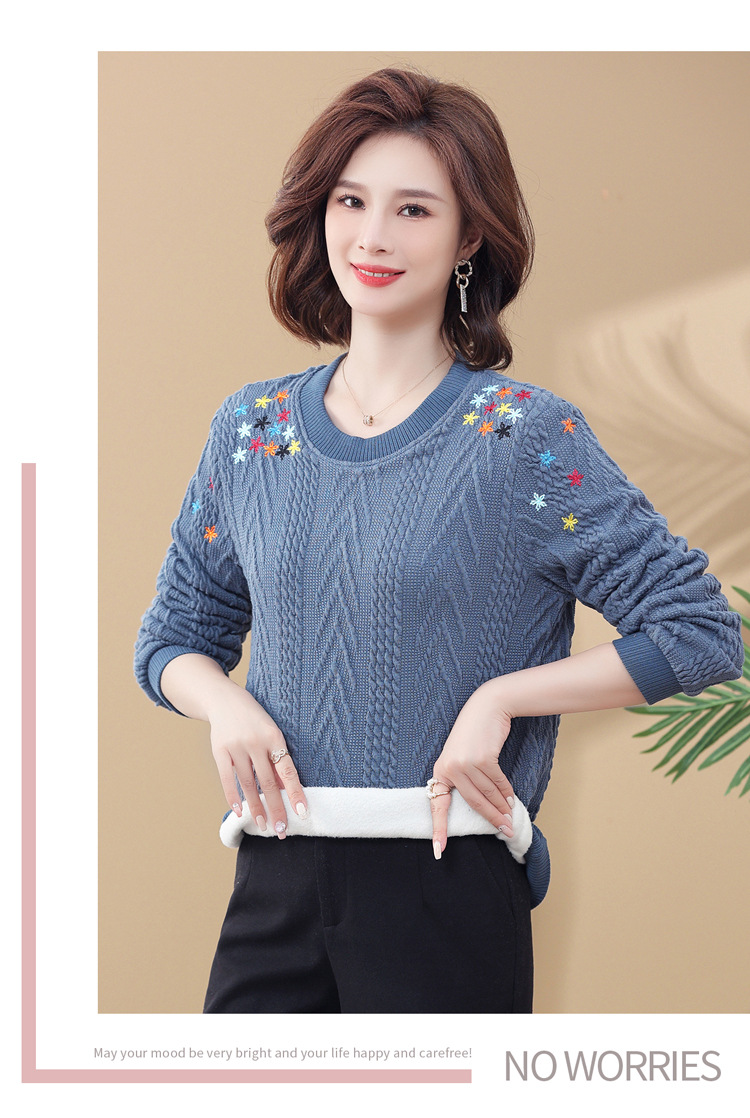 妈妈装加绒加厚针织打底衫2022新款中老年女冬装圆领套头绣花毛衣
