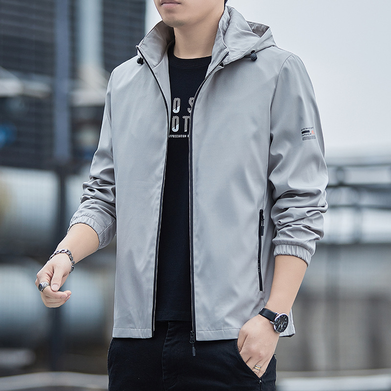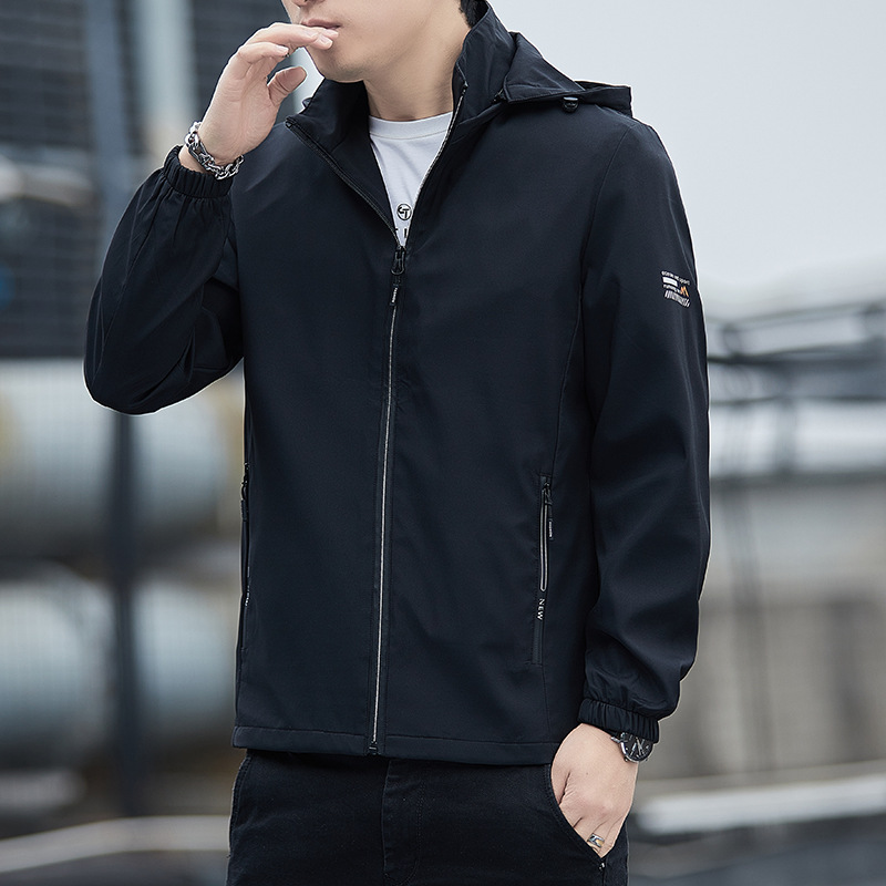 2023春秋季新款男士夹克薄款外套男冲锋衣纯色连帽休闲上衣运动潮