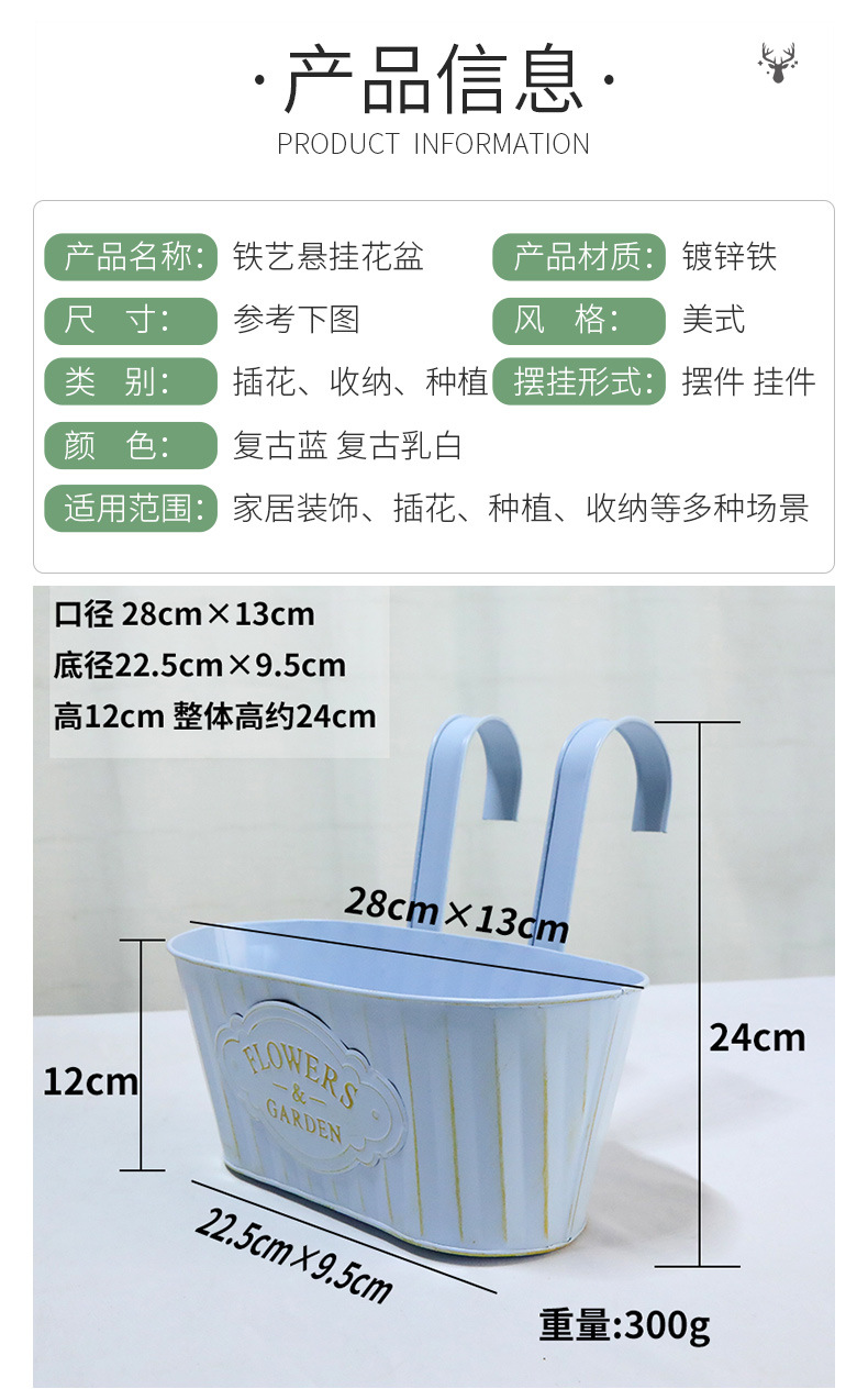 跨境热卖 新款园艺椭圆花盆双挂钩可拆卸挂钩 铁皮悬挂桶阳台围栏
