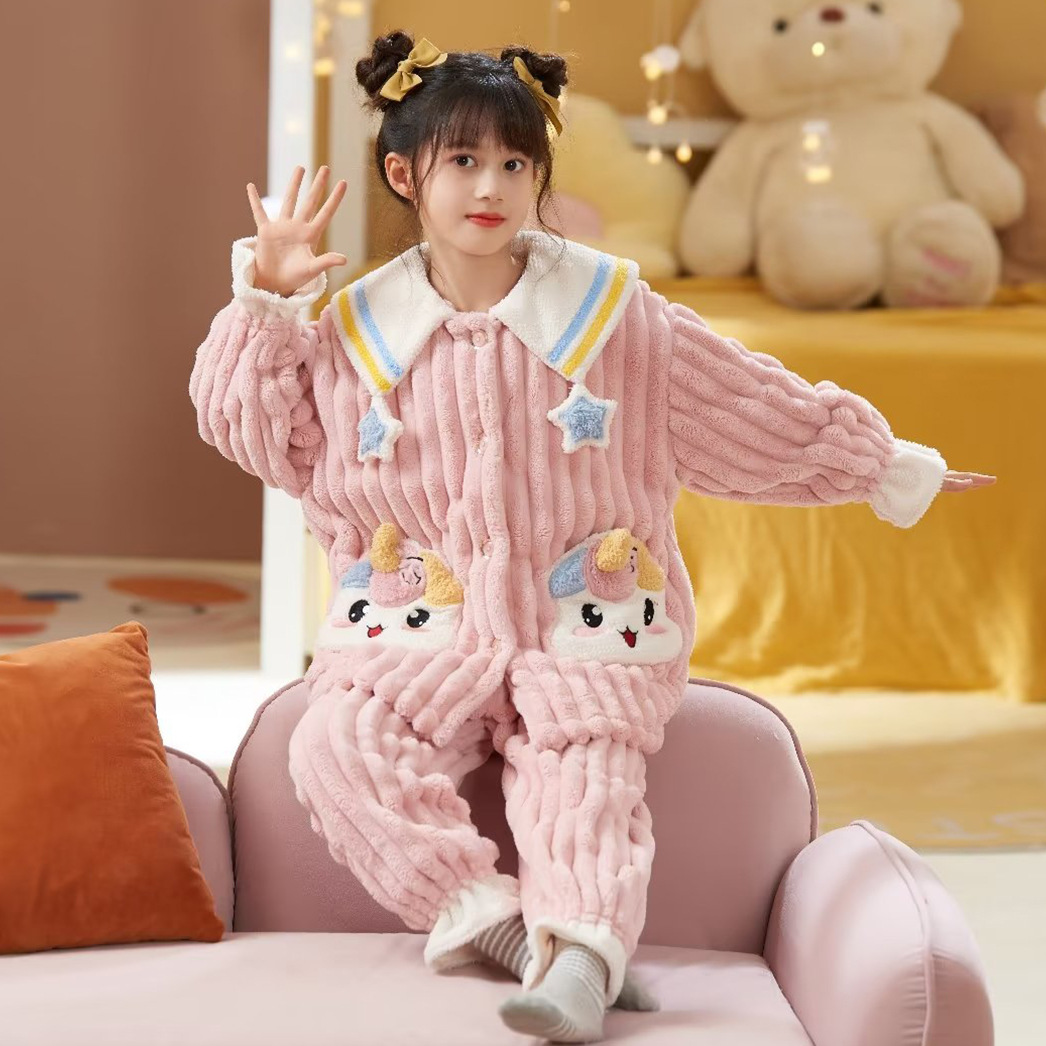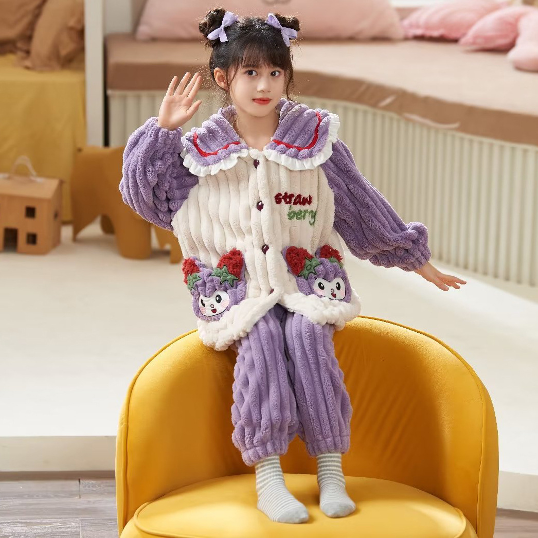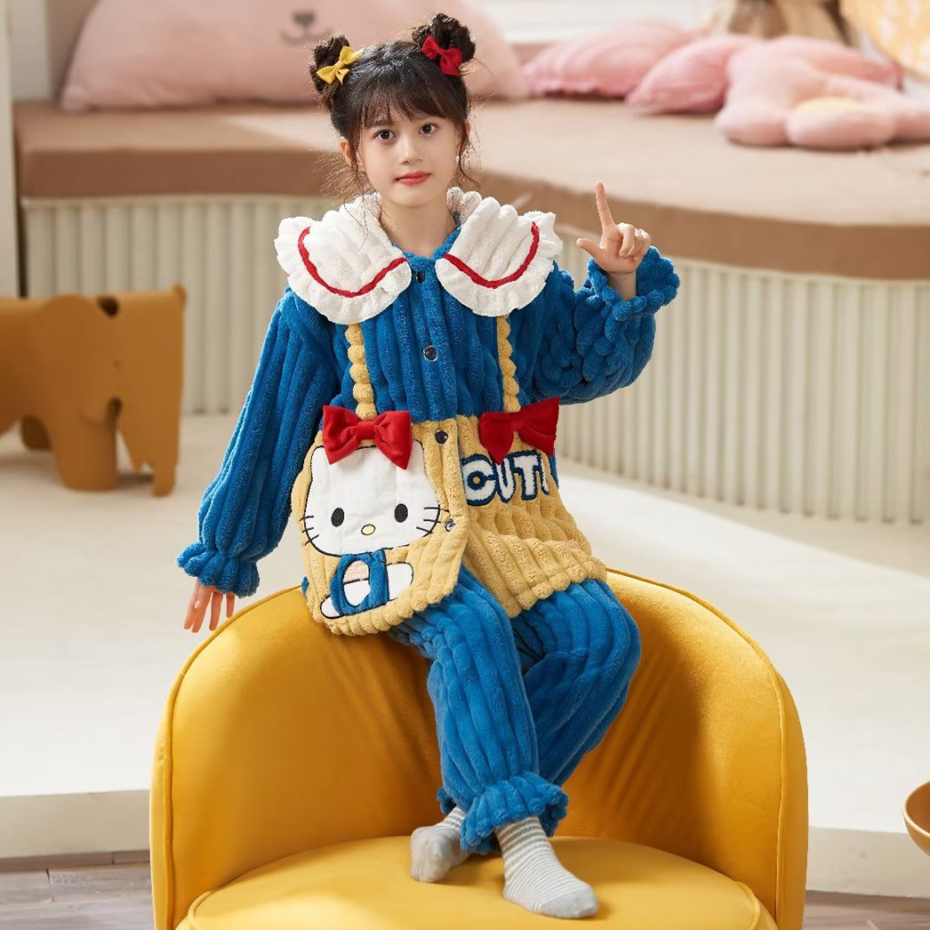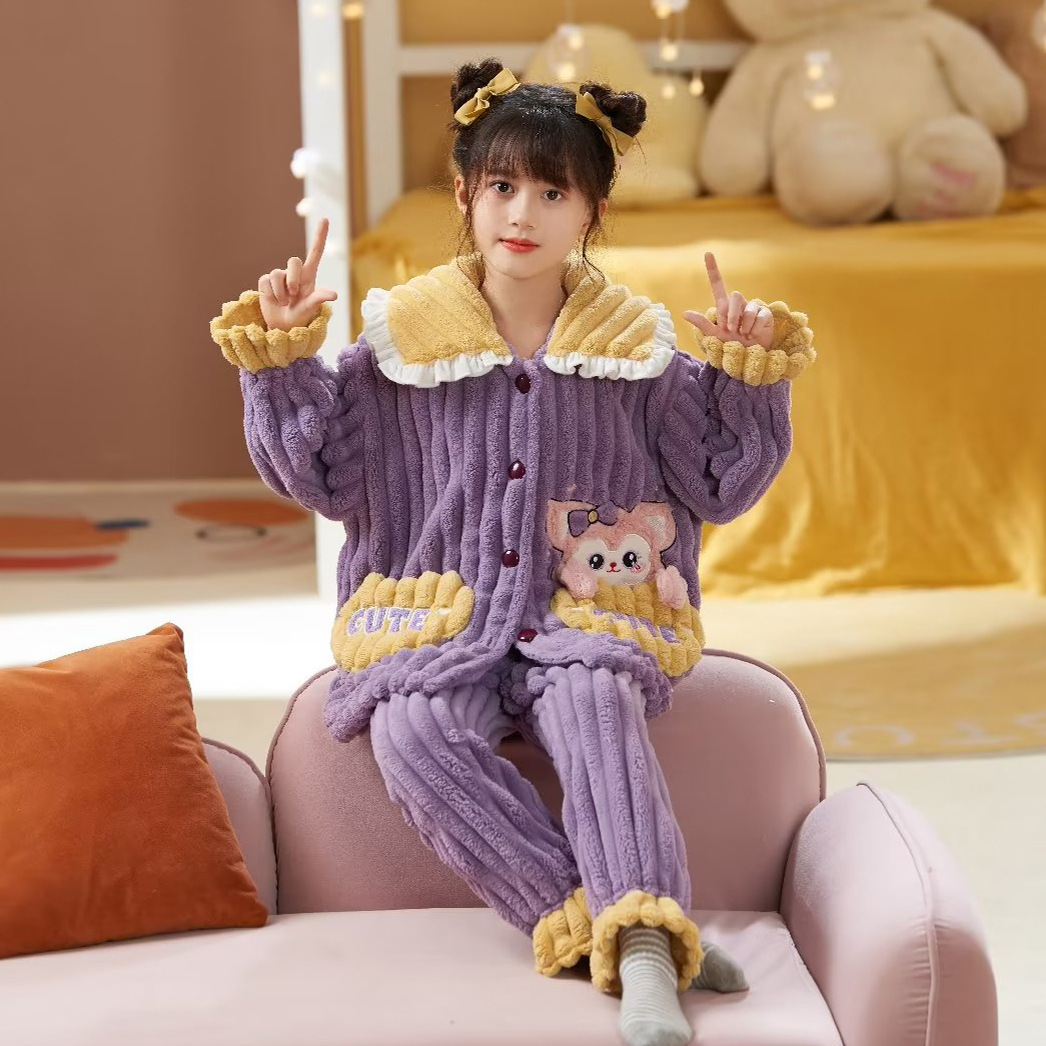 女童睡衣儿童睡袍法兰绒加厚珊瑚绒秋冬季套装浴袍中大童家居服女