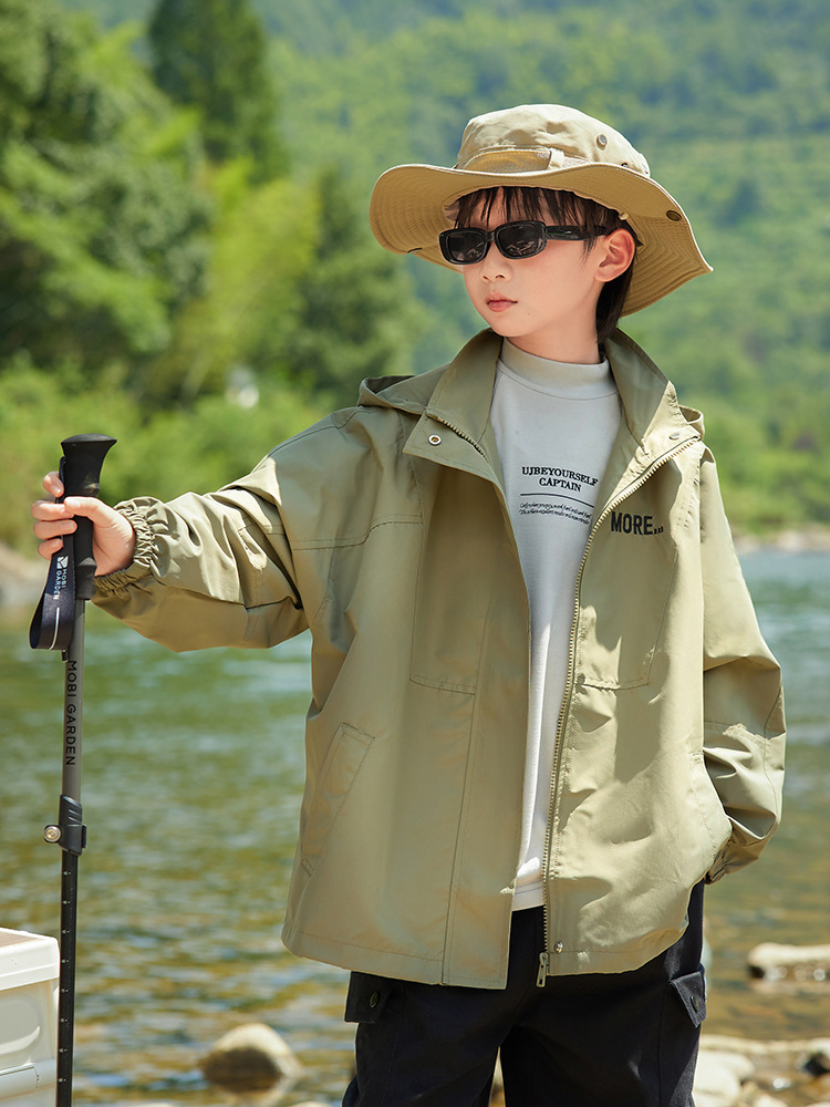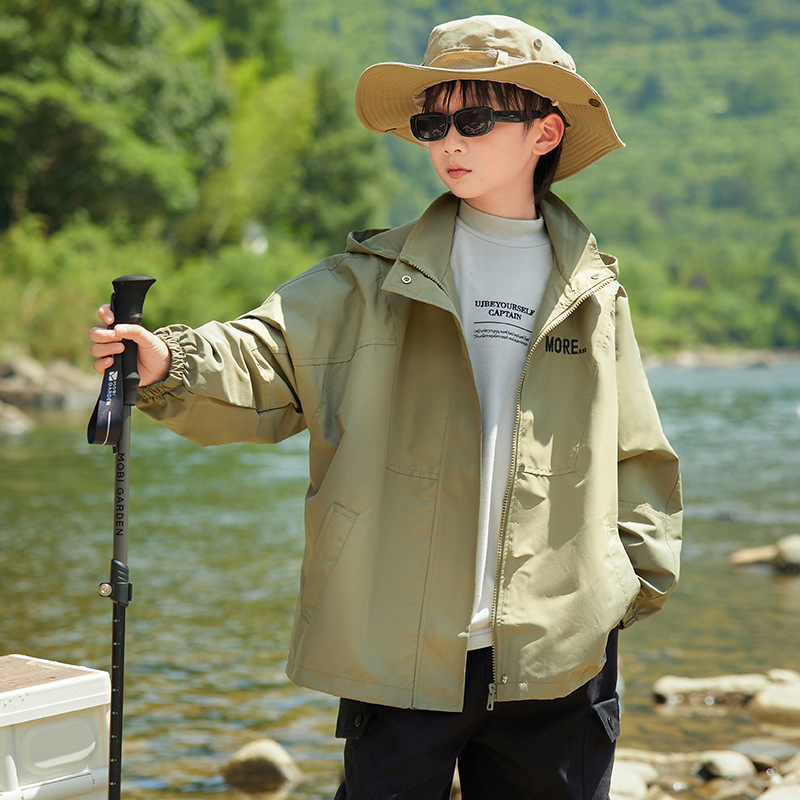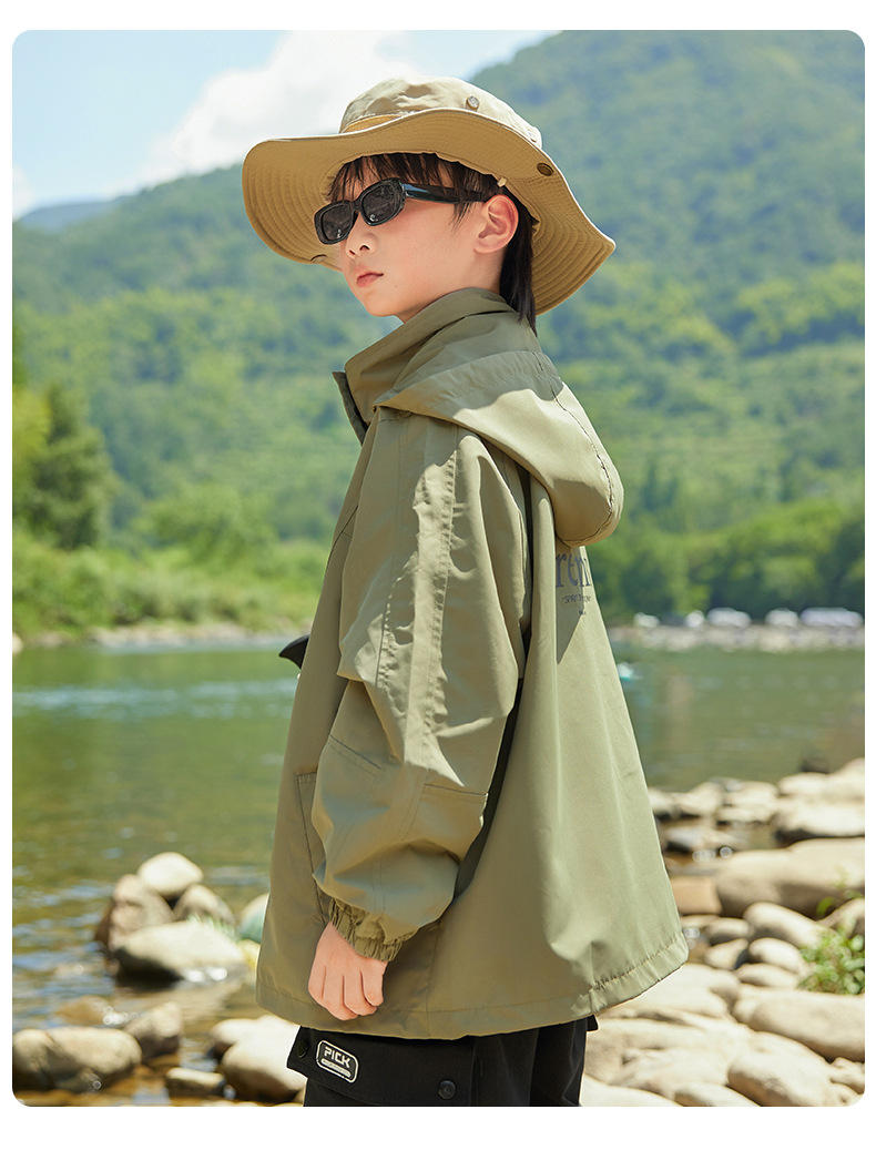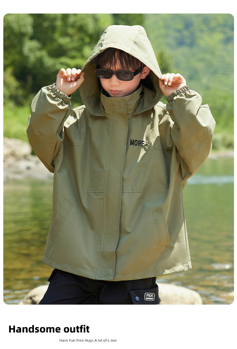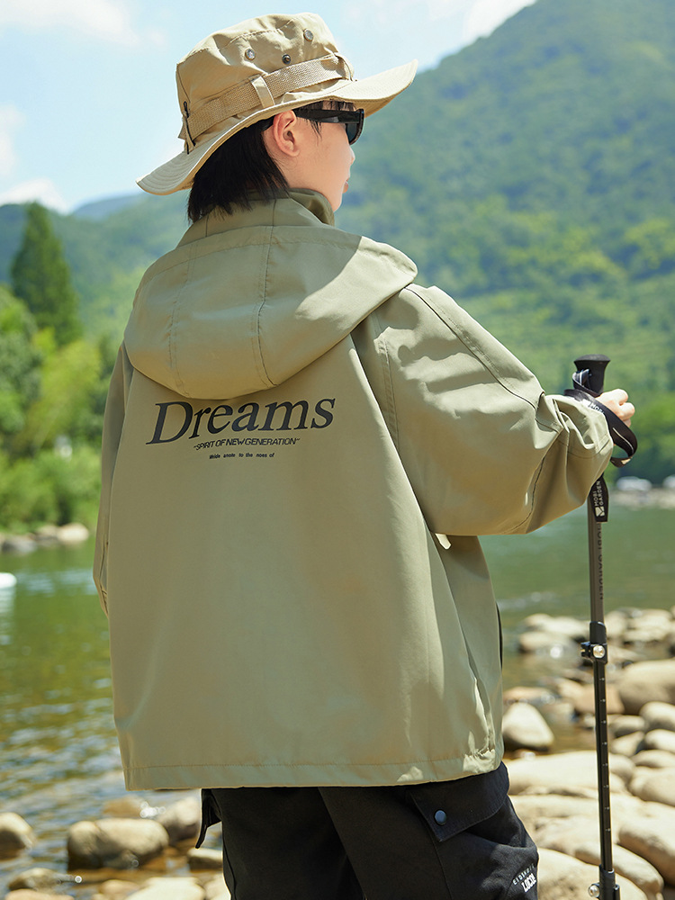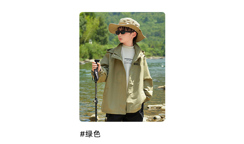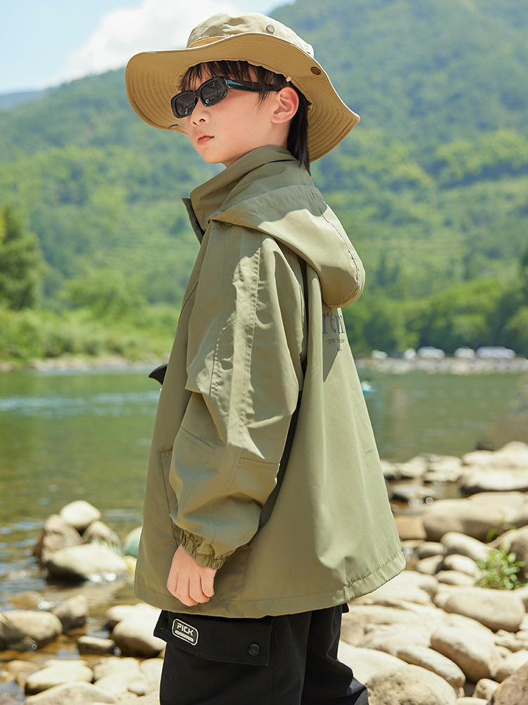 男童字母印花户外三防冲锋衣2023秋季新款中大童简约纯色连帽外套