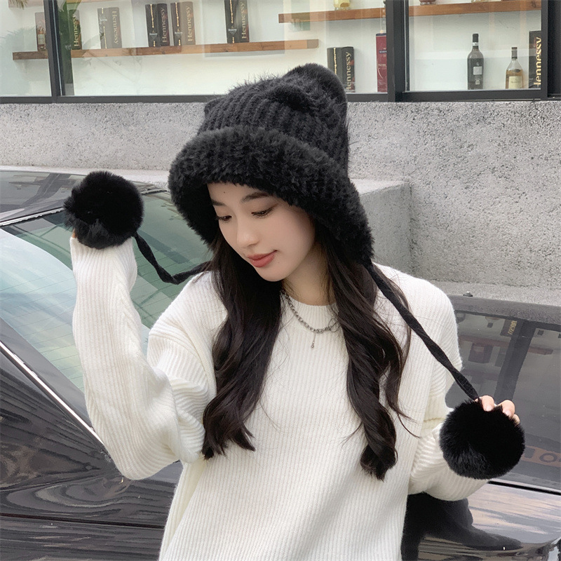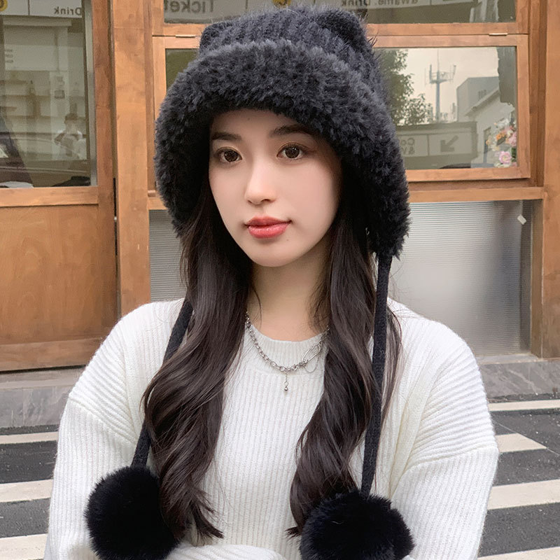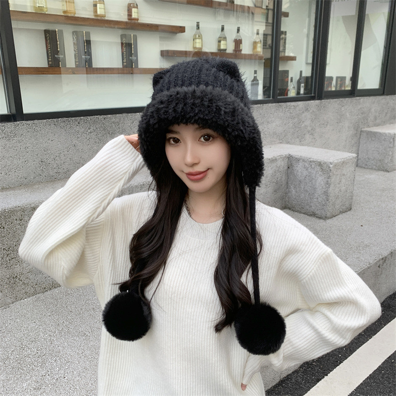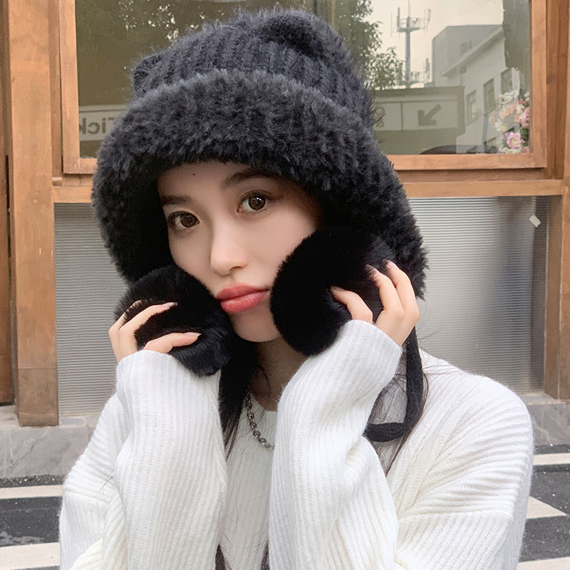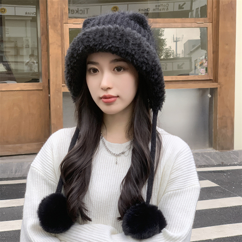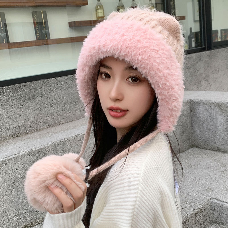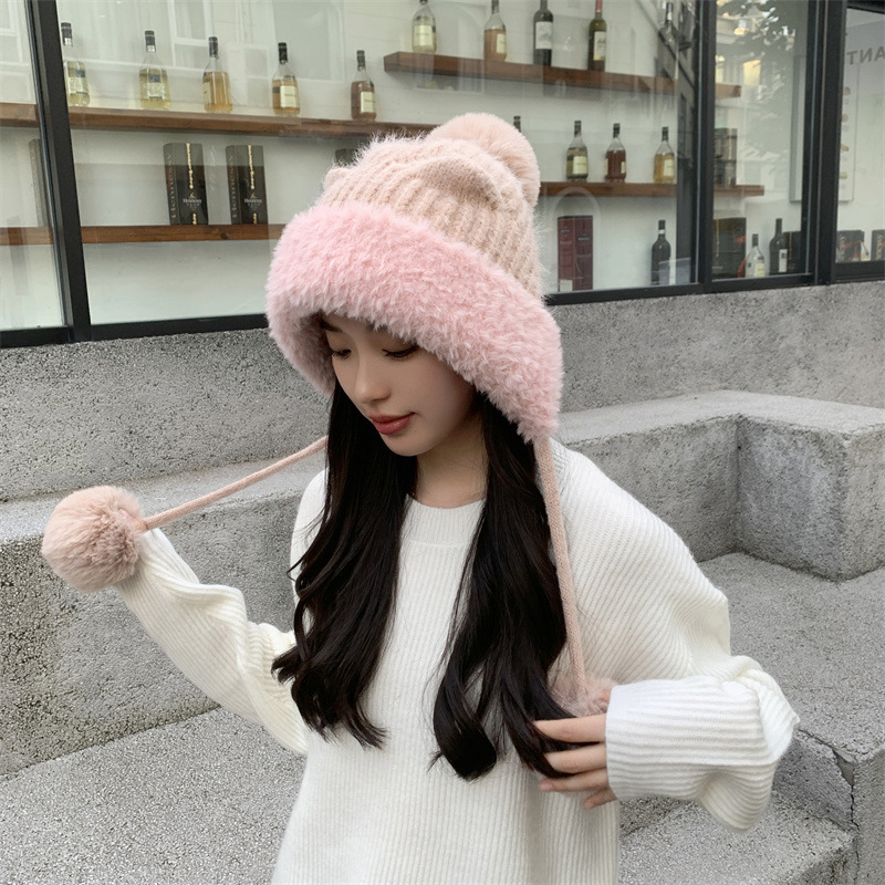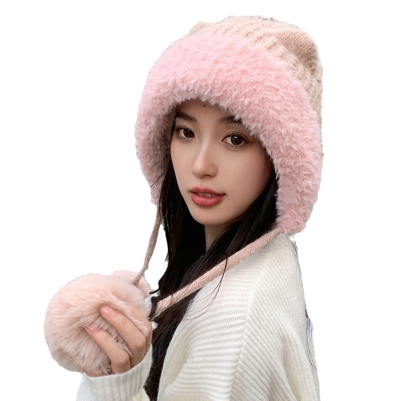 加绒针织保暖护耳兔毛帽子女士秋冬东北滑雪棉帽大头围吊球帽批发