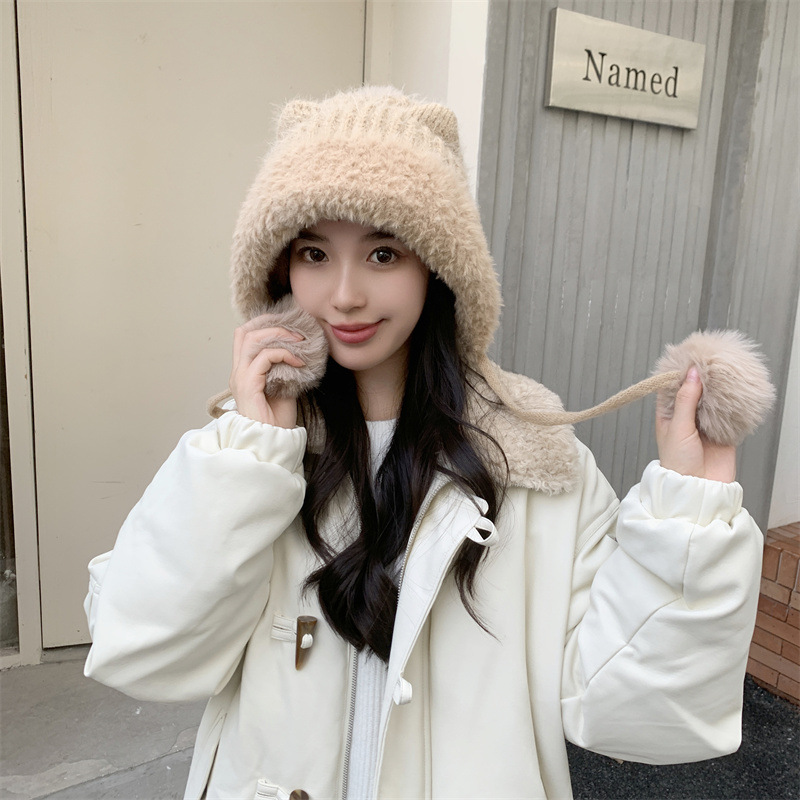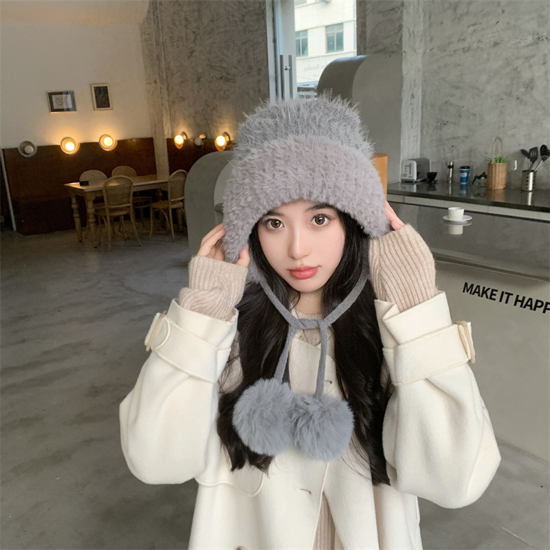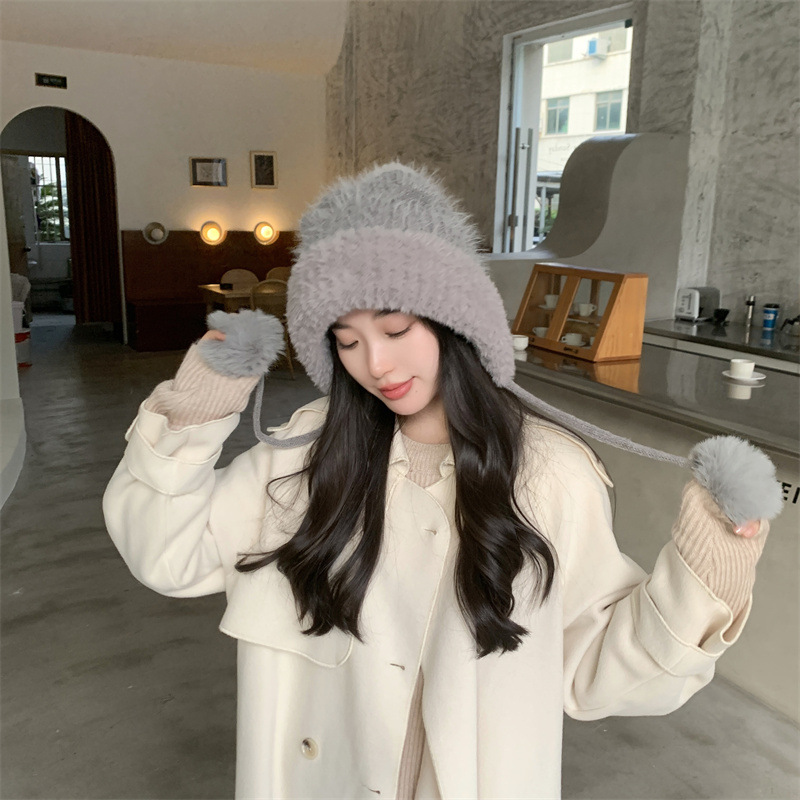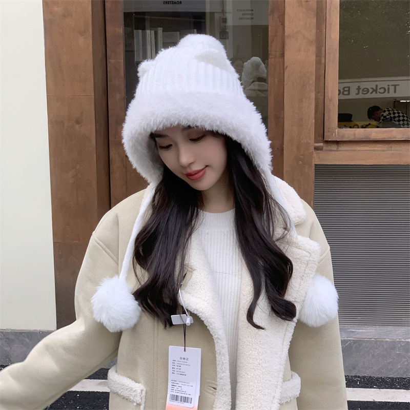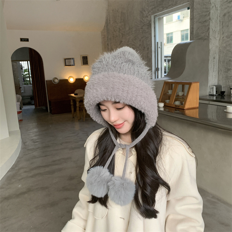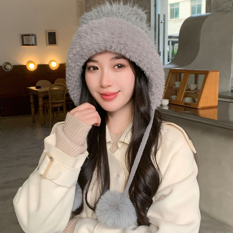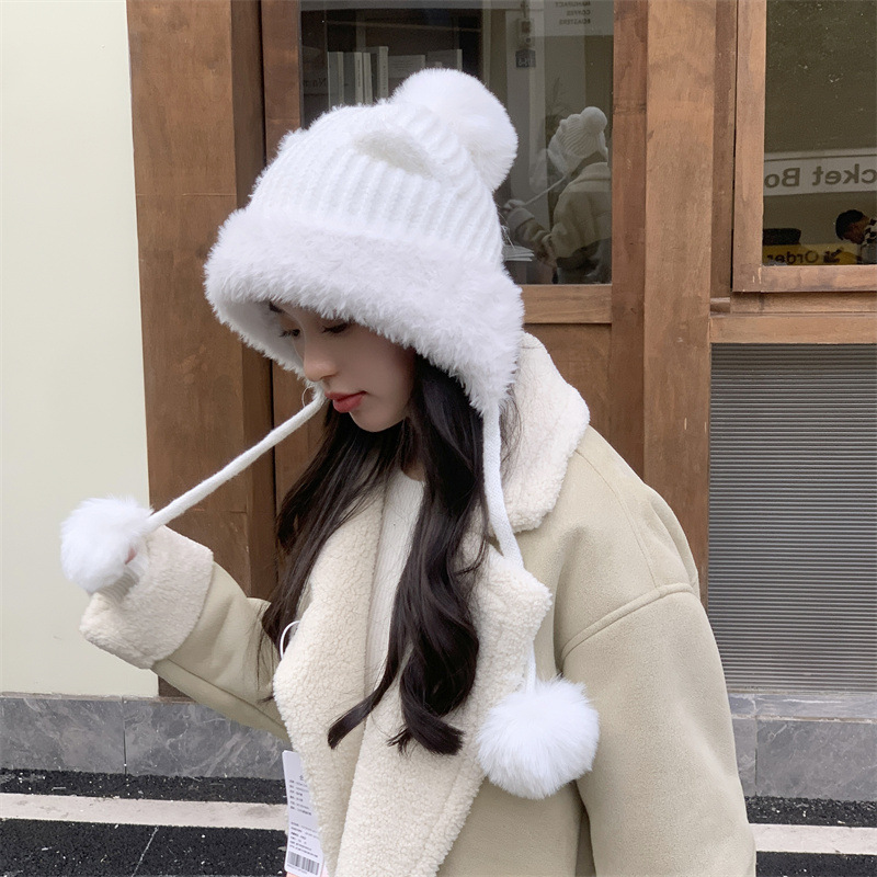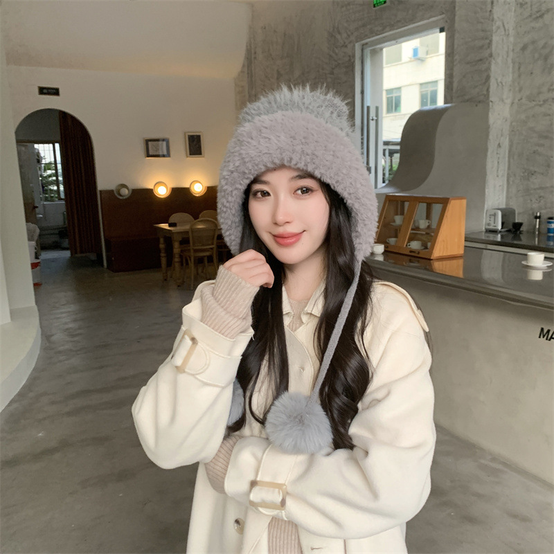 加绒针织保暖护耳兔毛帽子女士秋冬东北滑雪棉帽大头围吊球帽批发