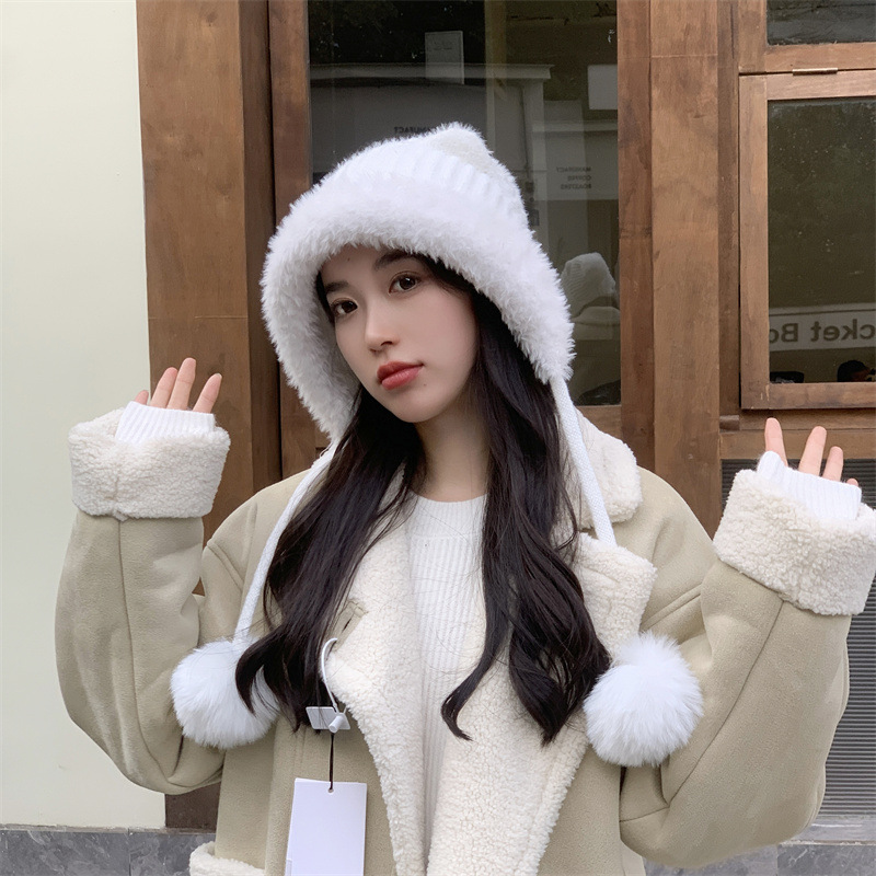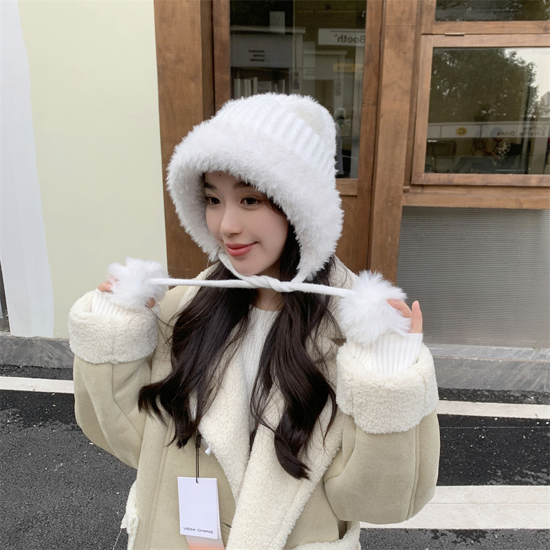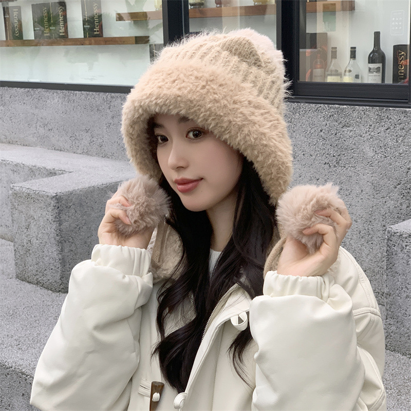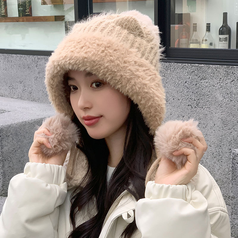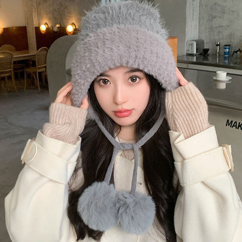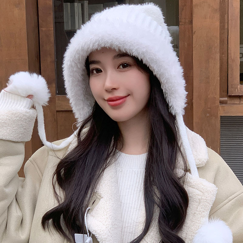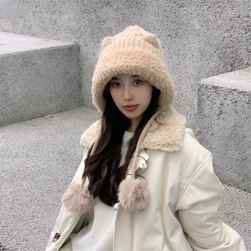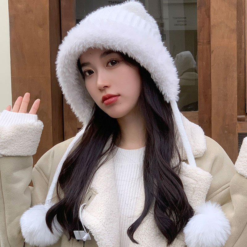 加绒针织保暖护耳兔毛帽子女士秋冬东北滑雪棉帽大头围吊球帽批发