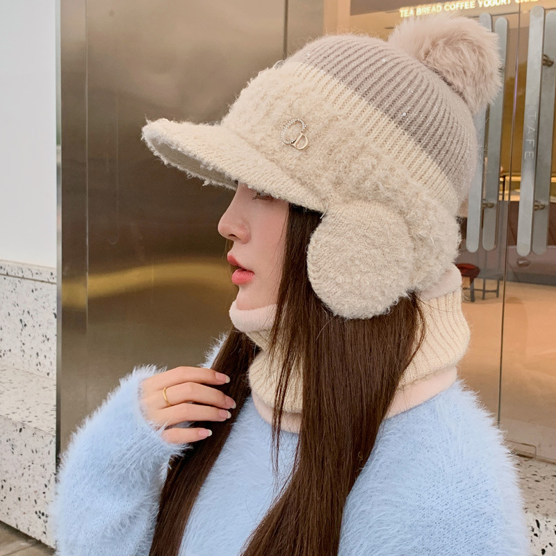 新款CD针织护耳鸭舌帽子女士兔毛保暖围脖套秋冬季拼色毛线帽批发