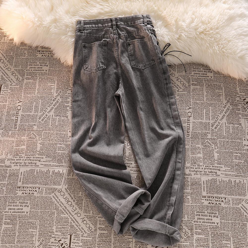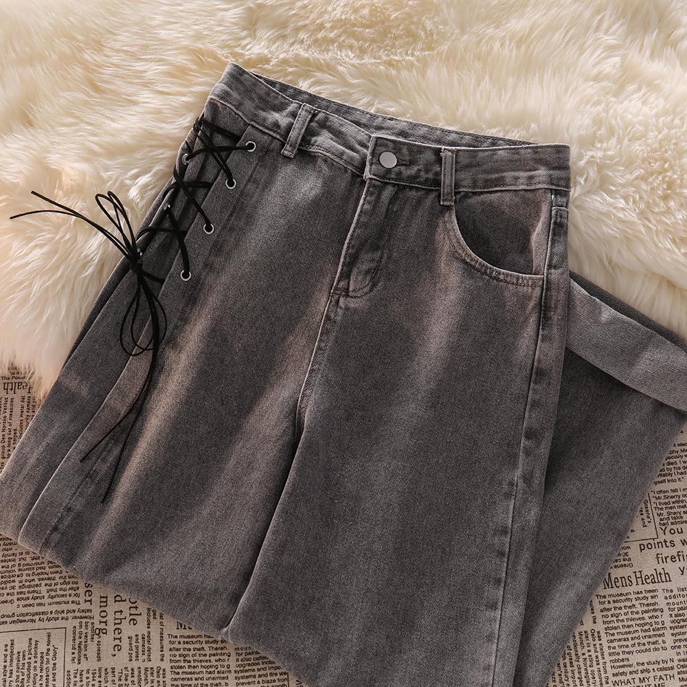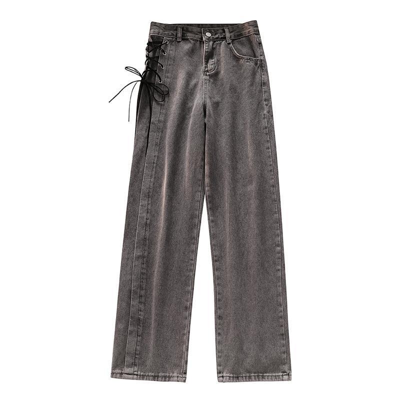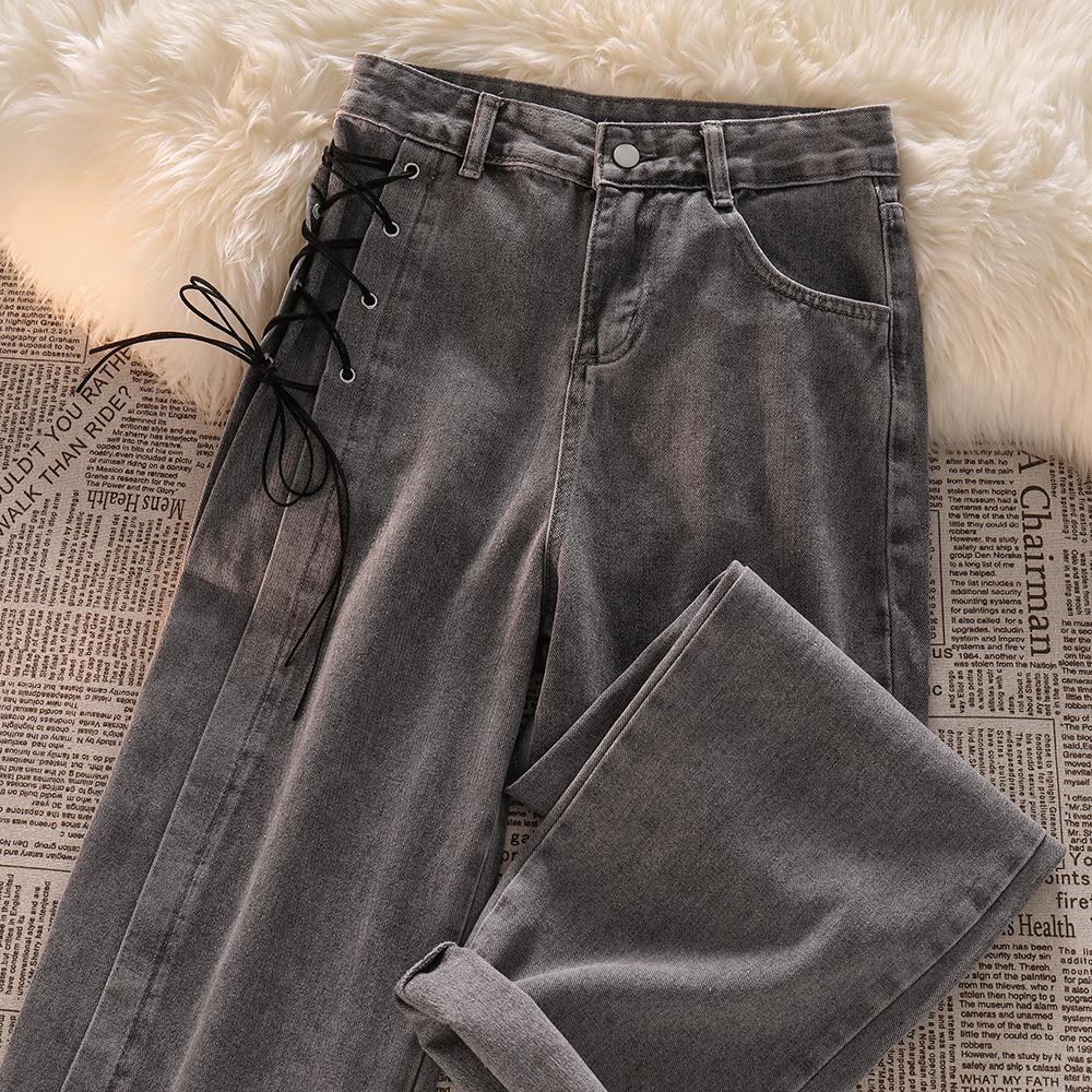 高腰绑带牛仔裤女秋装新款设计感小众烟灰色宽松直筒阔腿拖地裤子