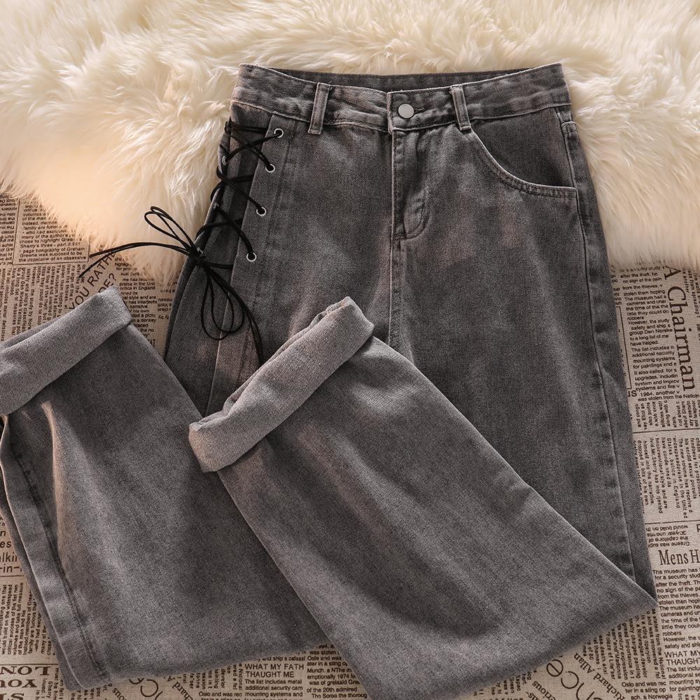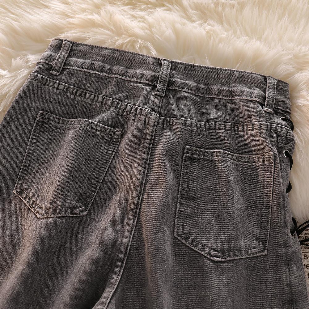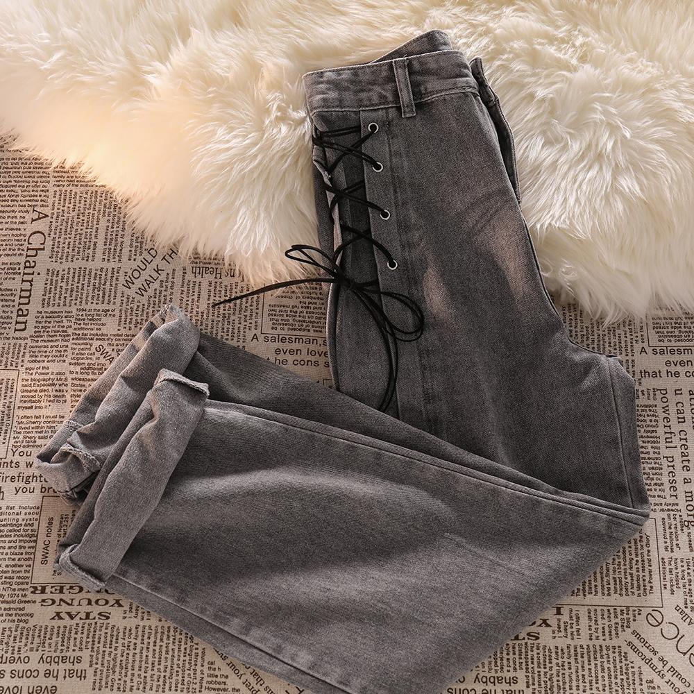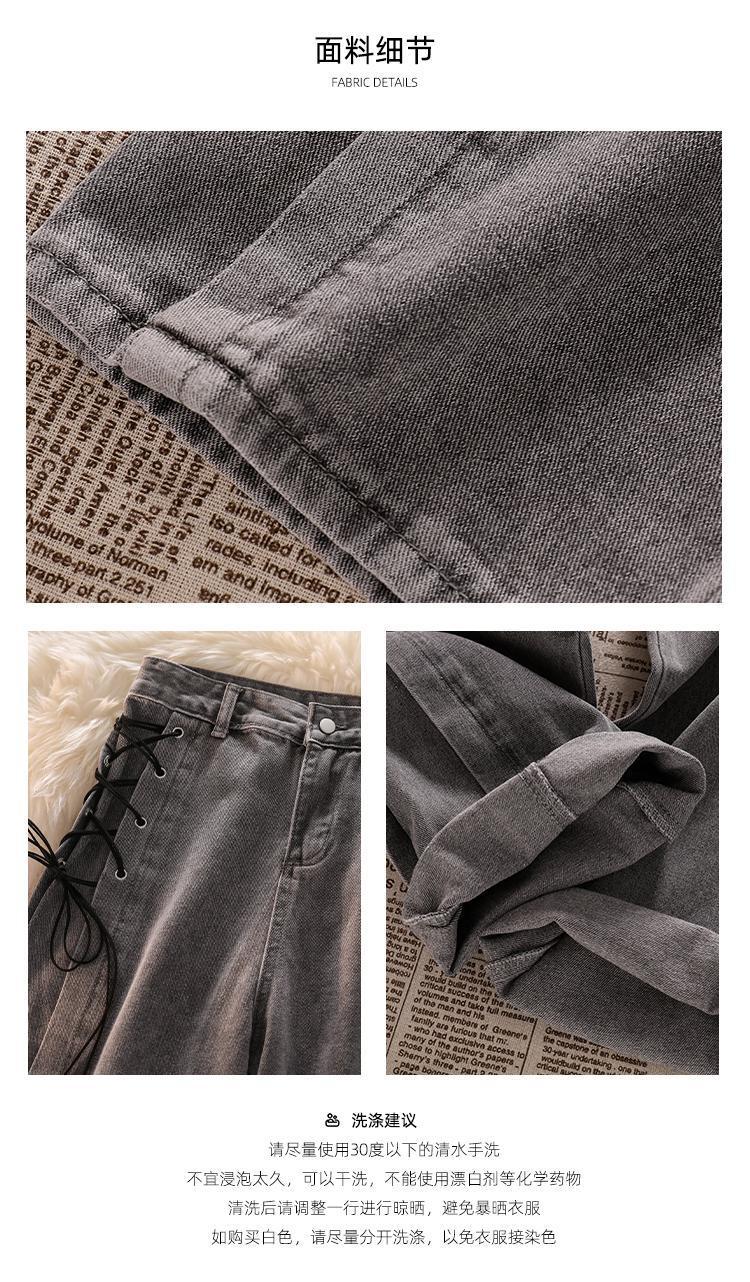 高腰绑带牛仔裤女秋装新款设计感小众烟灰色宽松直筒阔腿拖地裤子