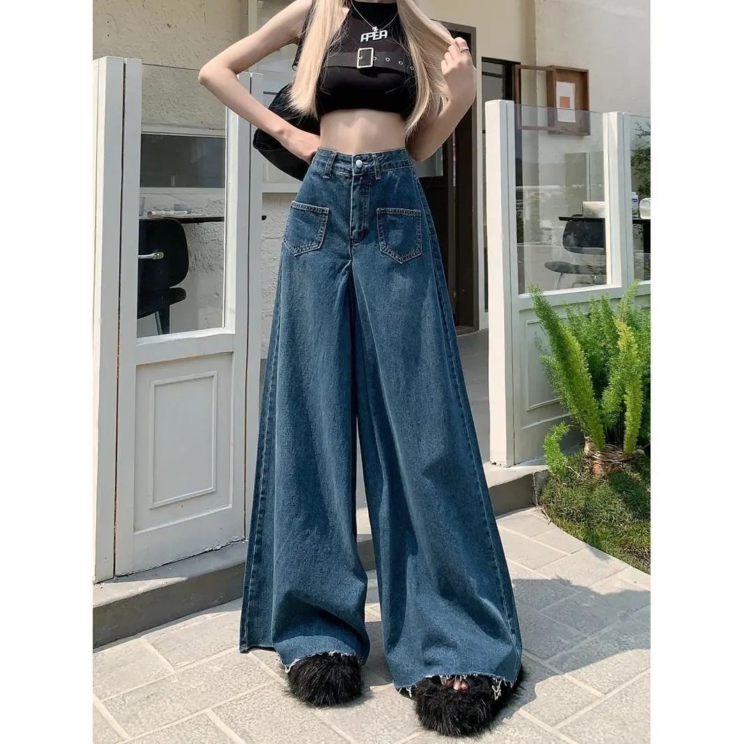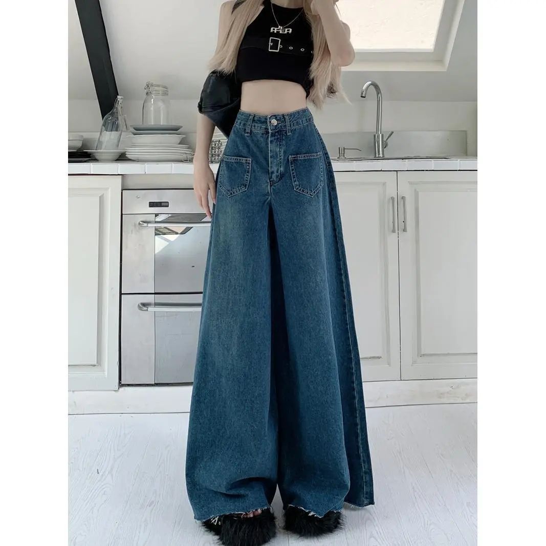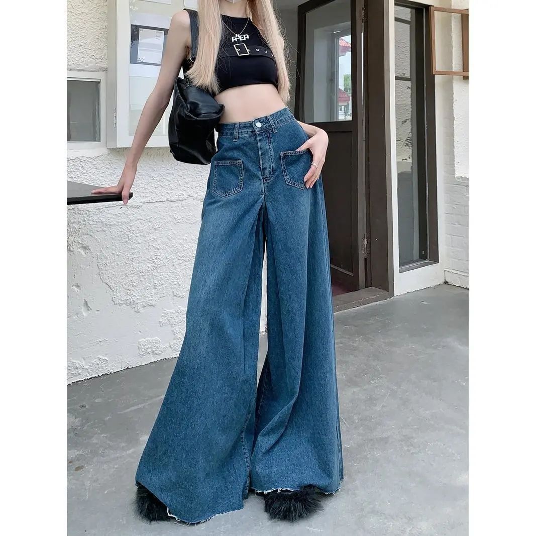 高街复古大裤脚牛仔裤女春秋新款磨边设计感宽松阔腿长裤子ins潮