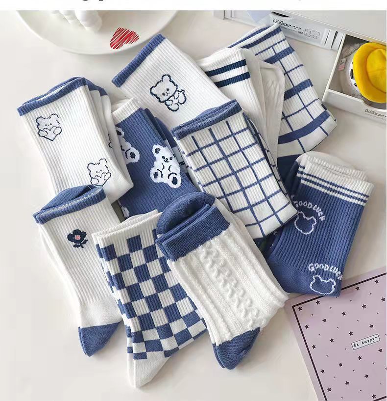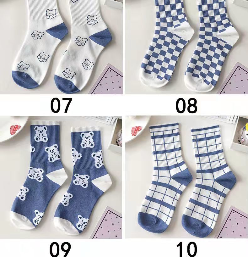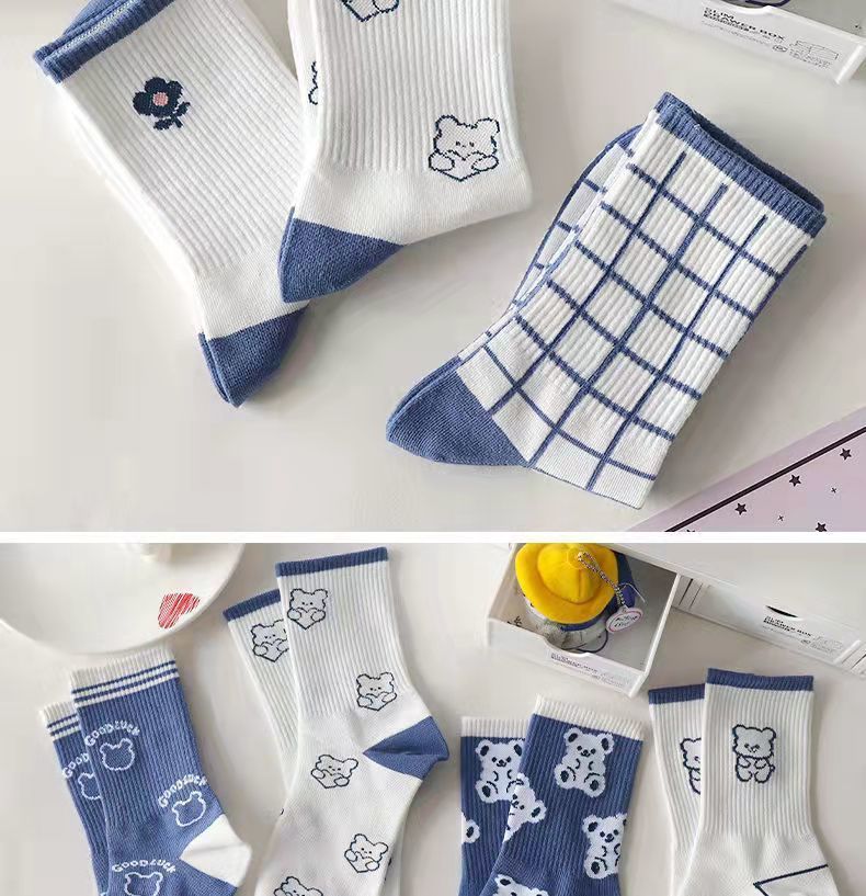 小熊袜子女中筒袜秋冬季可爱学生日系ins潮蓝色格子长袜女春秋款