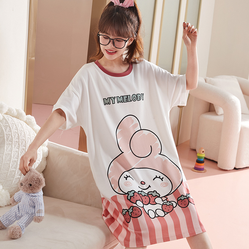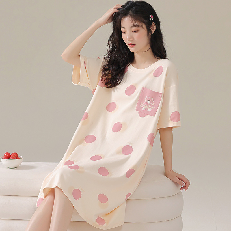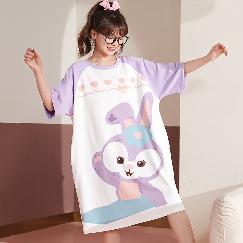 夏季女士睡衣棉质可爱短袖睡裙卡通大码夏天薄款长裙家居服可外穿