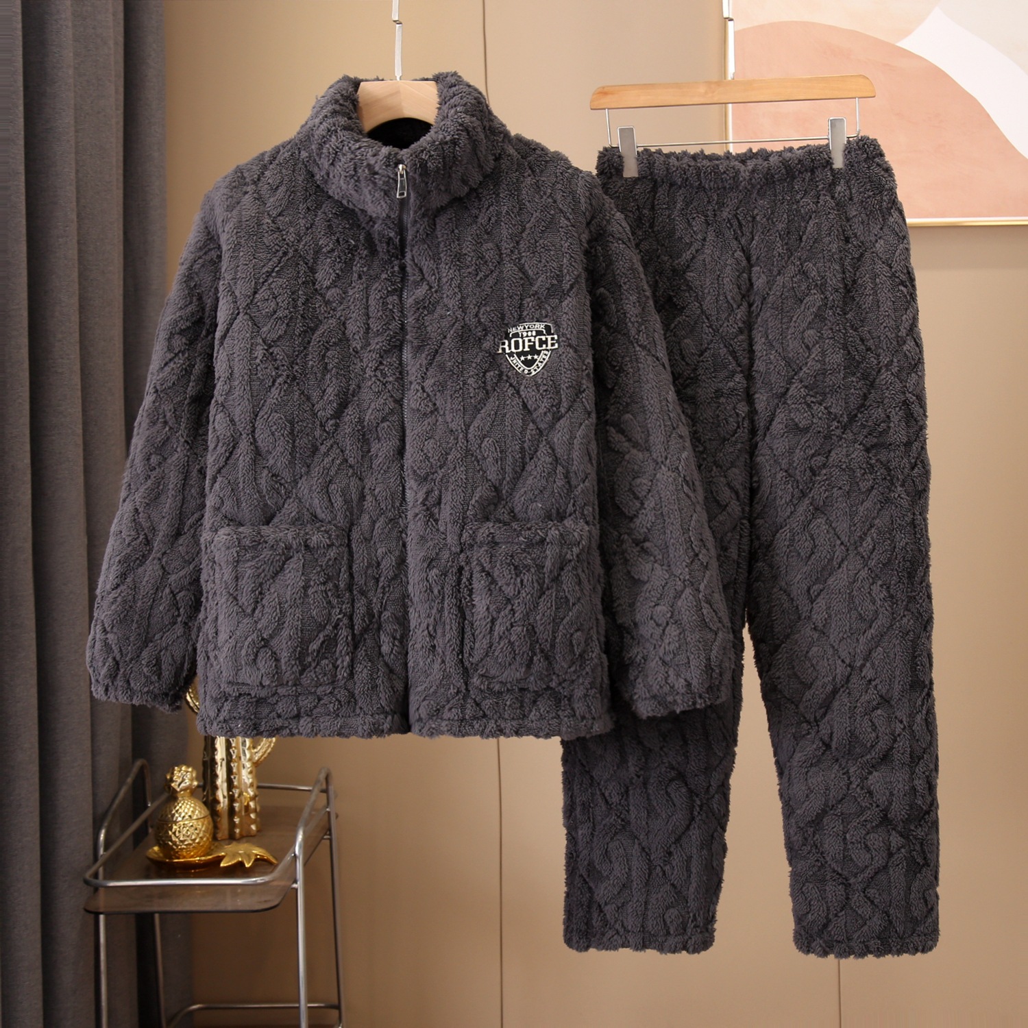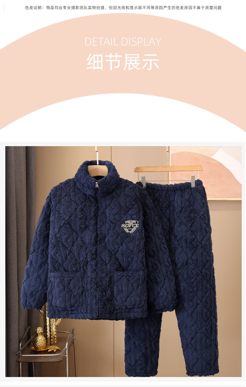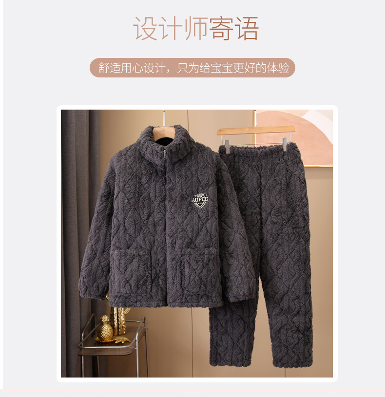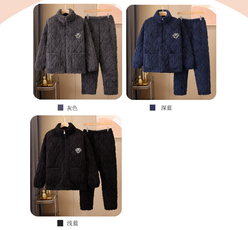 男士冬季三层加厚珊瑚绒夹棉保暖加绒法兰绒秋冬款睡衣家居服套装