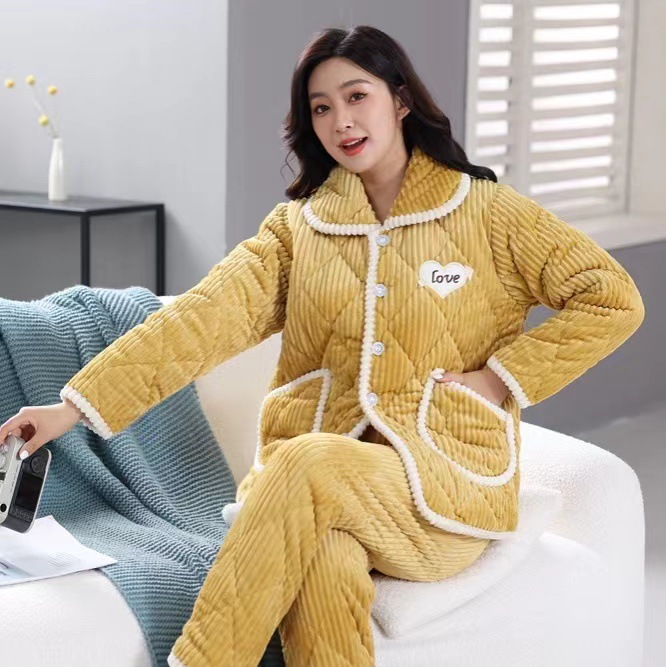 珊瑚绒冬季睡衣女保暖加厚加绒三层夹棉袄套装法兰绒家居服