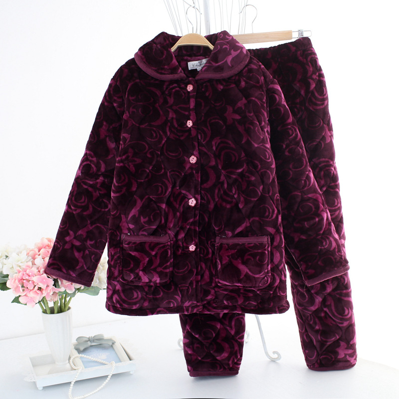 中老年人夹棉睡衣女秋冬季加厚加绒冬天中年妈妈珊瑚绒夹棉套装新