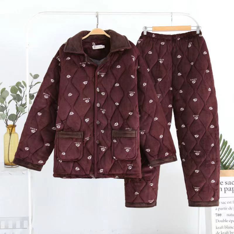 男士睡衣秋冬款珊瑚绒三层夹棉睡衣男冬季加厚加绒法兰绒家居服男