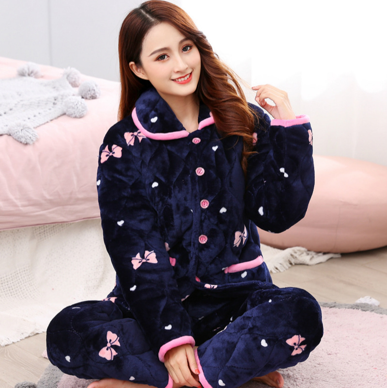 睡衣女冬季三层加厚夹棉睡衣女珊瑚绒法兰绒秋冬保暖可外穿家居服