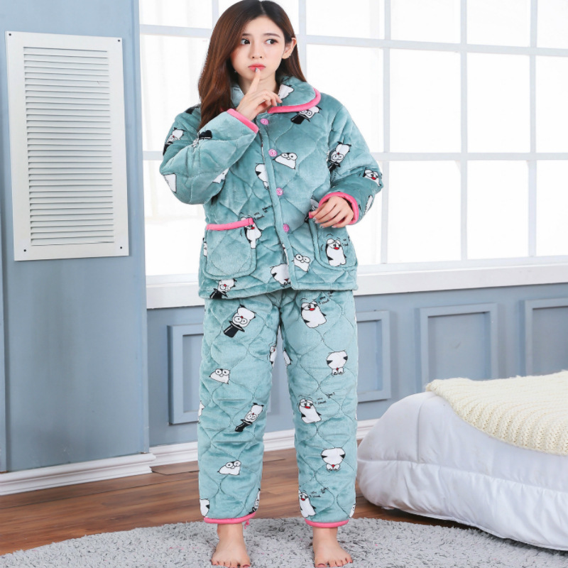 冬季睡衣女珊瑚绒三层加厚保暖夹棉家居服女士法兰绒套装厂家批发
