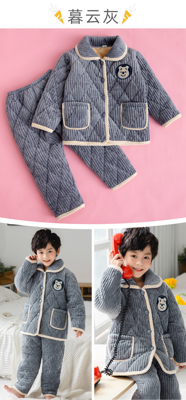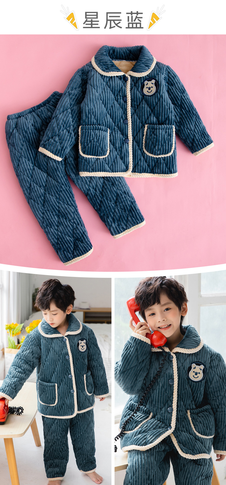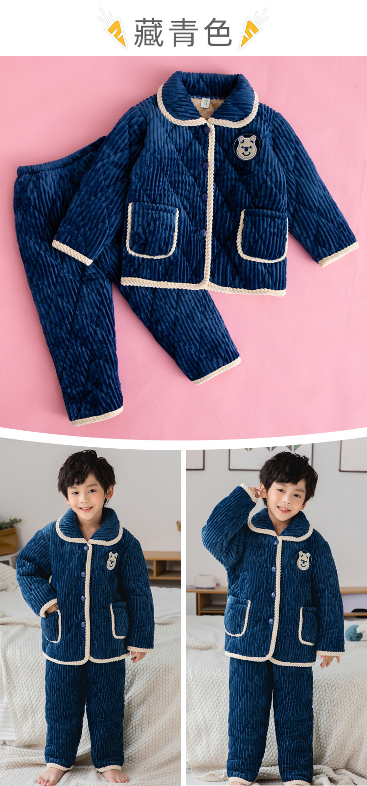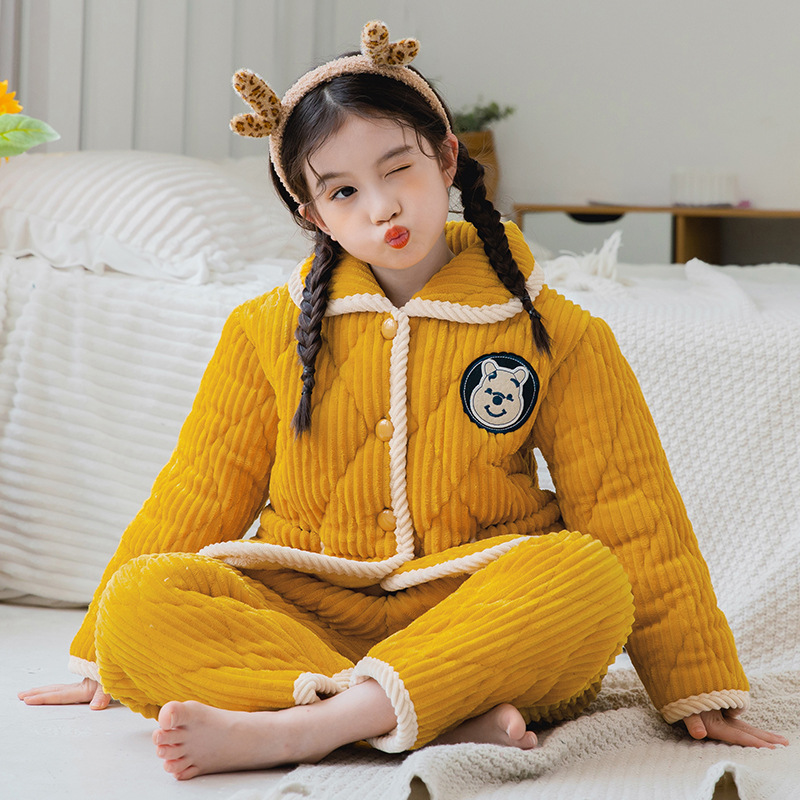 冬季儿童睡衣加厚法兰绒家居服套装男童小女孩三层夹棉加绒珊瑚绒