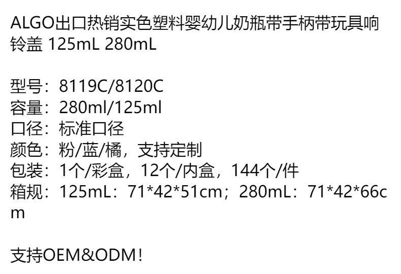 ALG婴儿宽口径pp奶瓶新生儿防胀气宝宝喝水卡通塑料瓶125ml 280ml