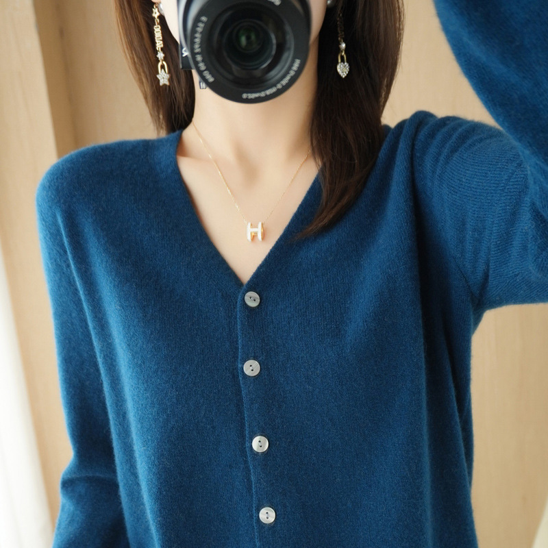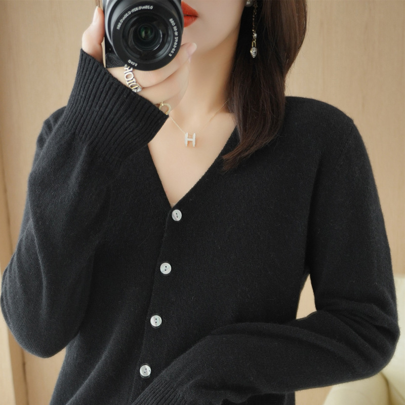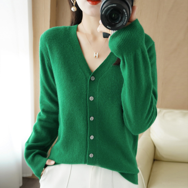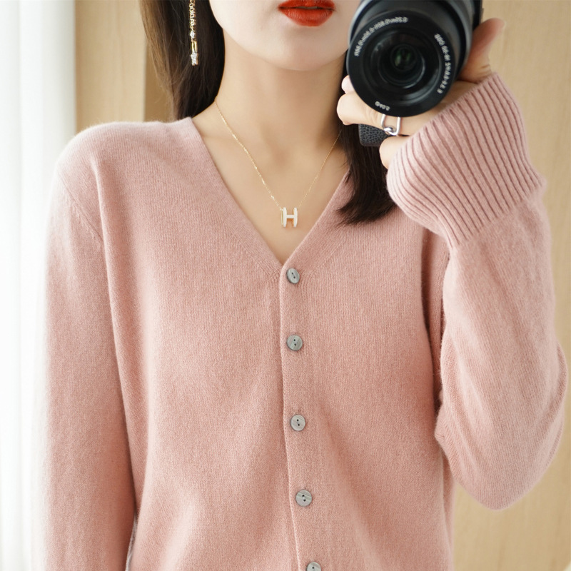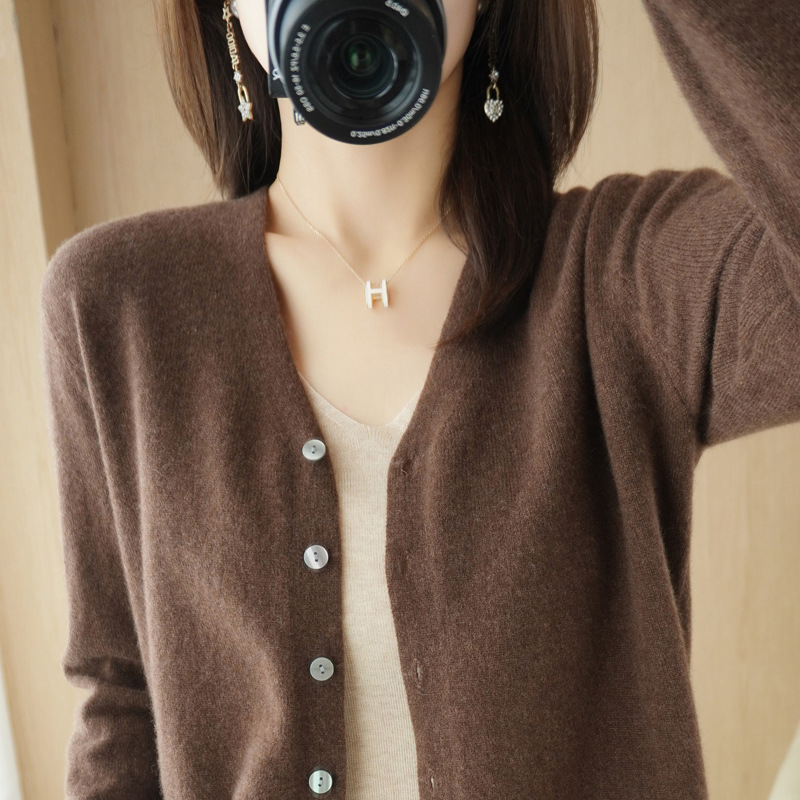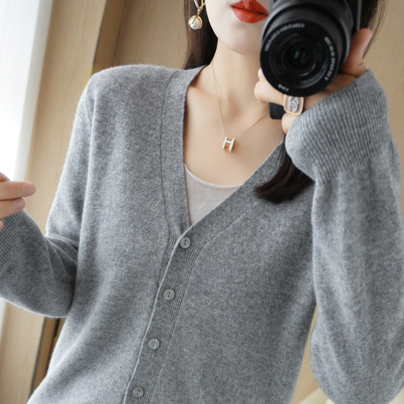 羊毛混纺新款春夏女装宽松v领纯色短款针织开衫外套毛衣空调衫