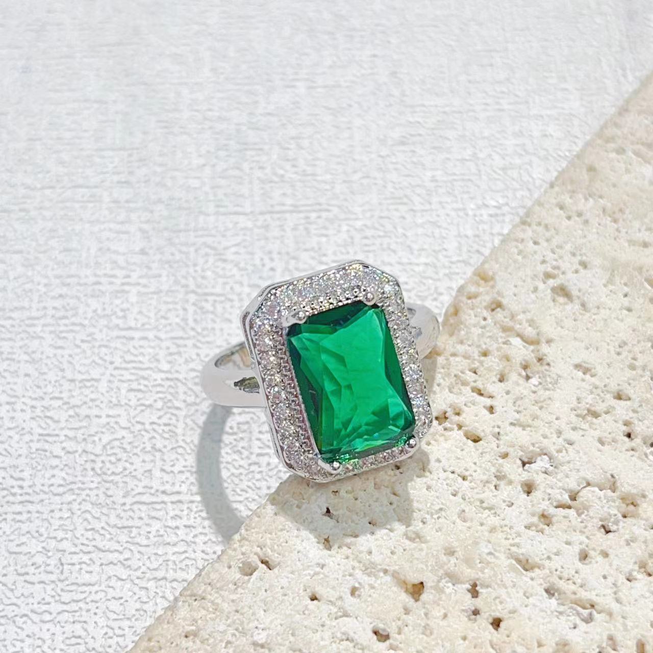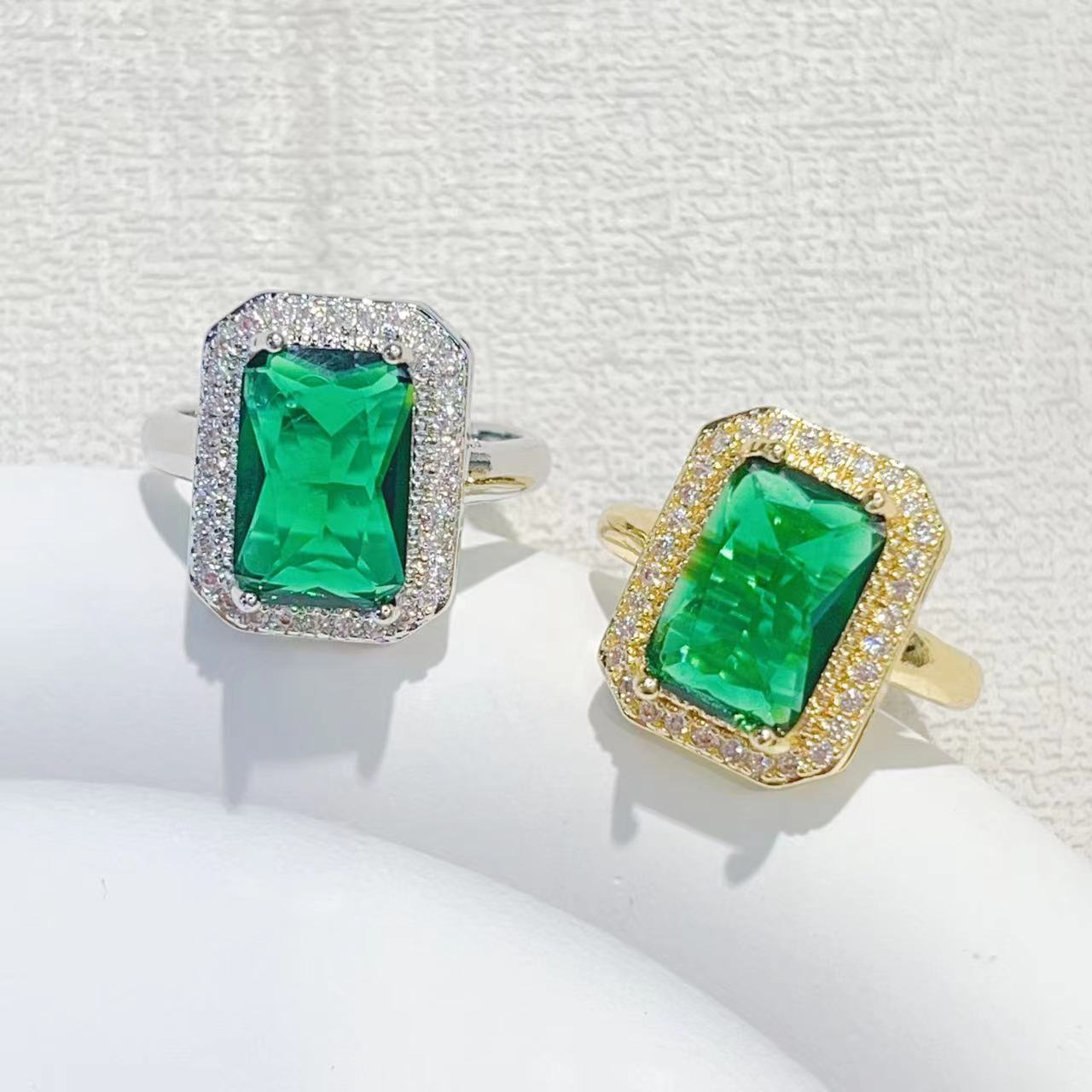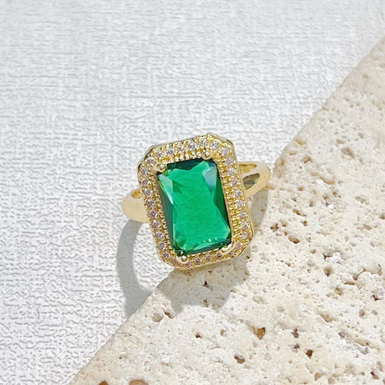 欧美跨境铜镀真金微镶锆石绿色长方轻奢INS网红风时尚开口戒指女