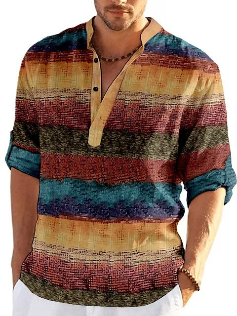2023跨境新款亚马逊欧美春秋简约拼色3D印花立领男士休闲衬衫